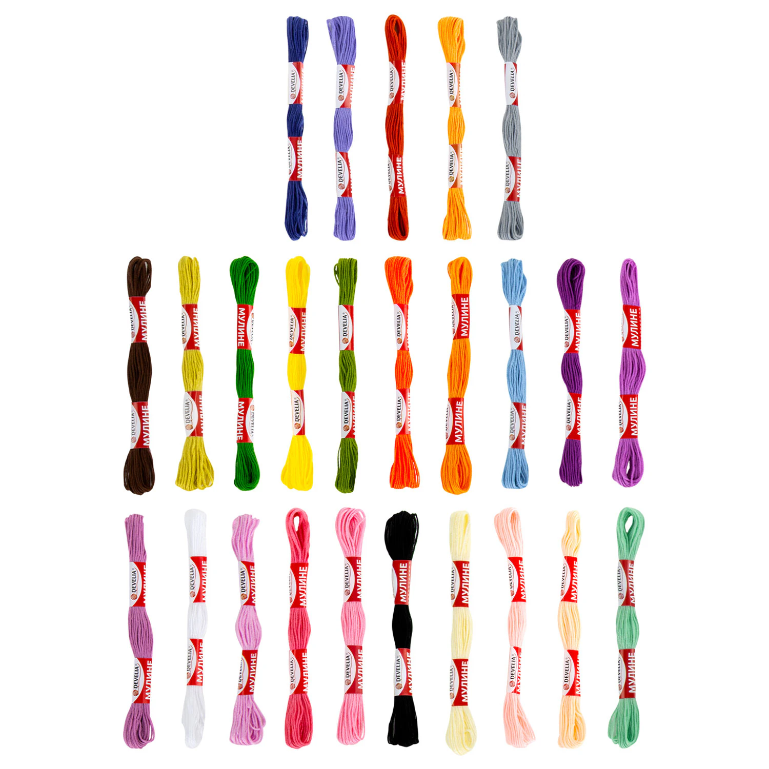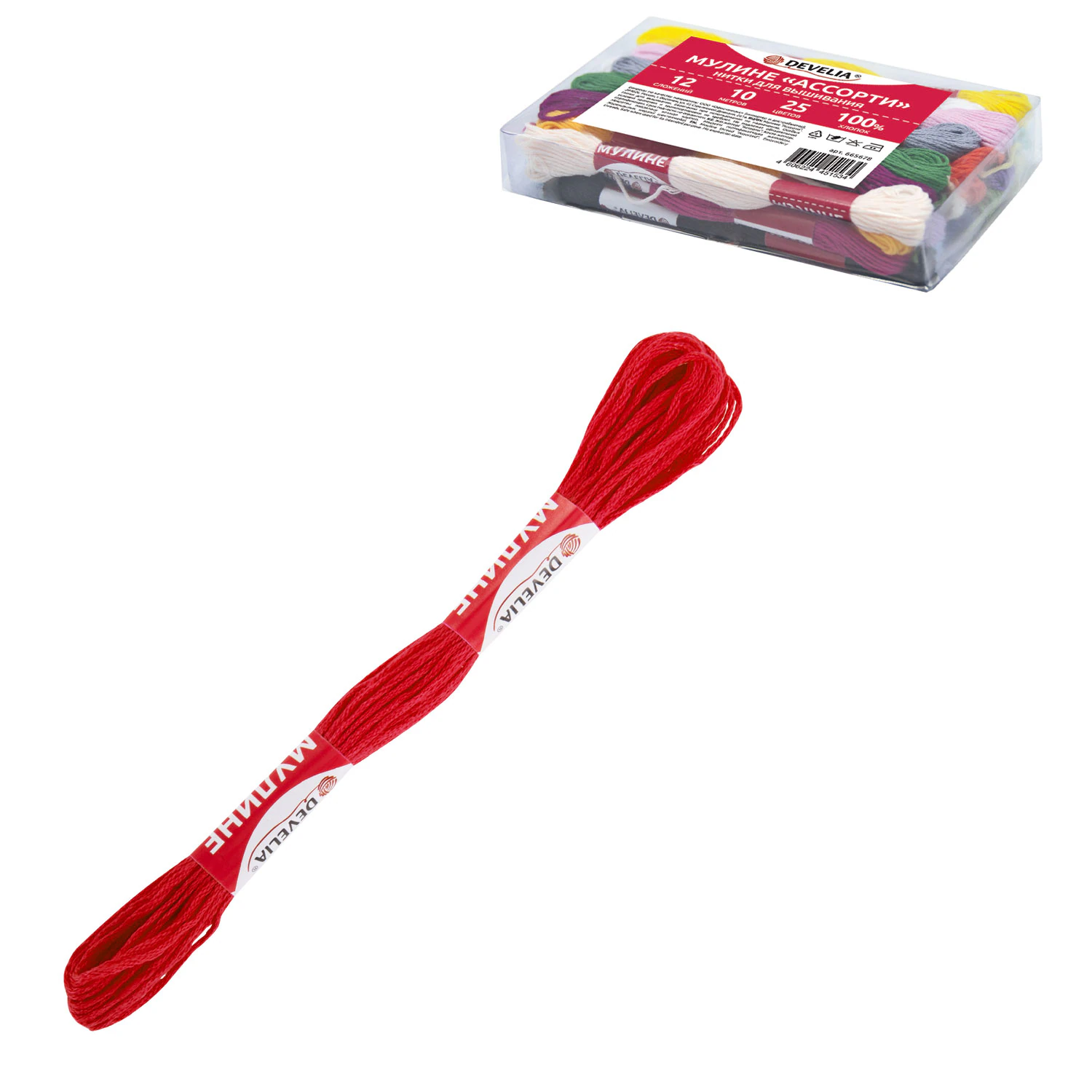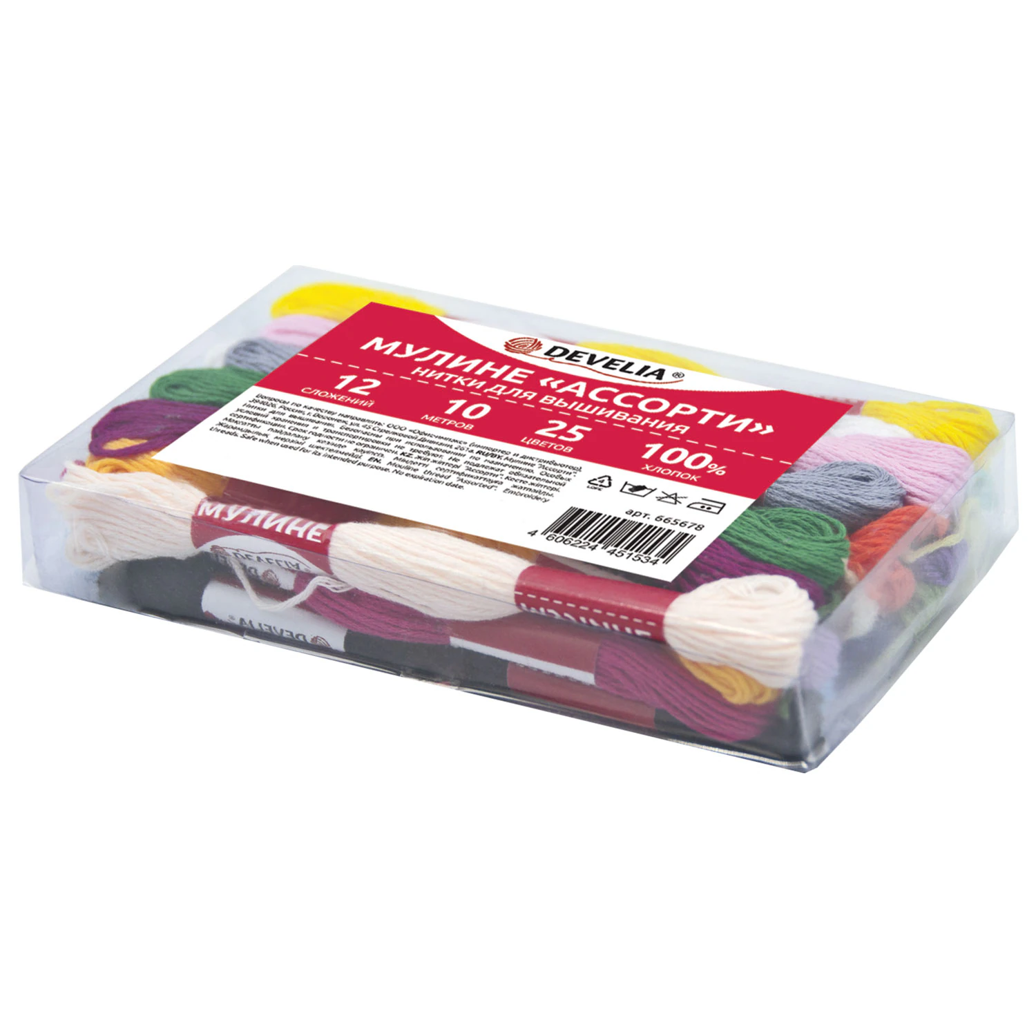 Набор ниток мулине DEVELIA состоит из 25 мотков ниток стандартных цветов в 12 сложений в намотке по 10 метров. Поставляются в пластиковом прозрачном боксе с удобной крышкой.