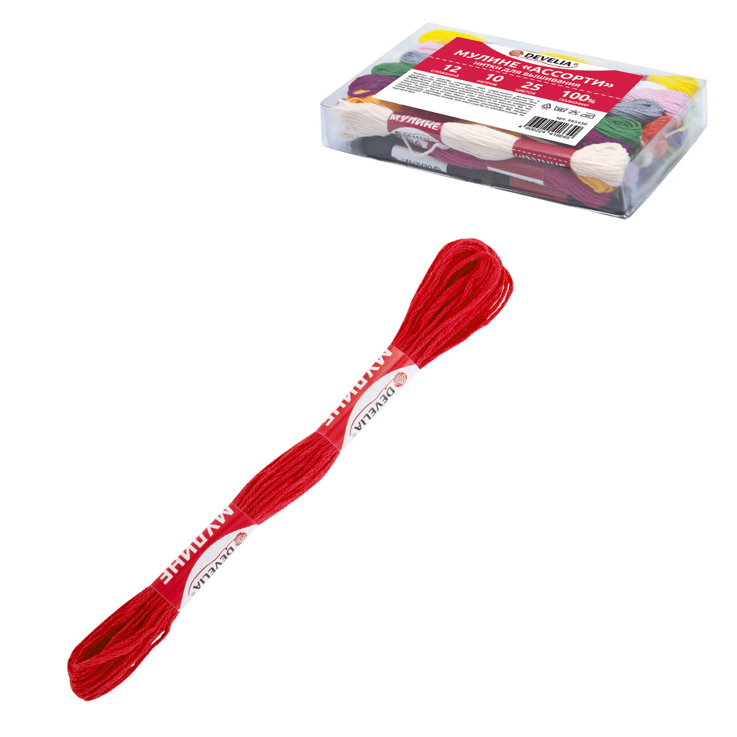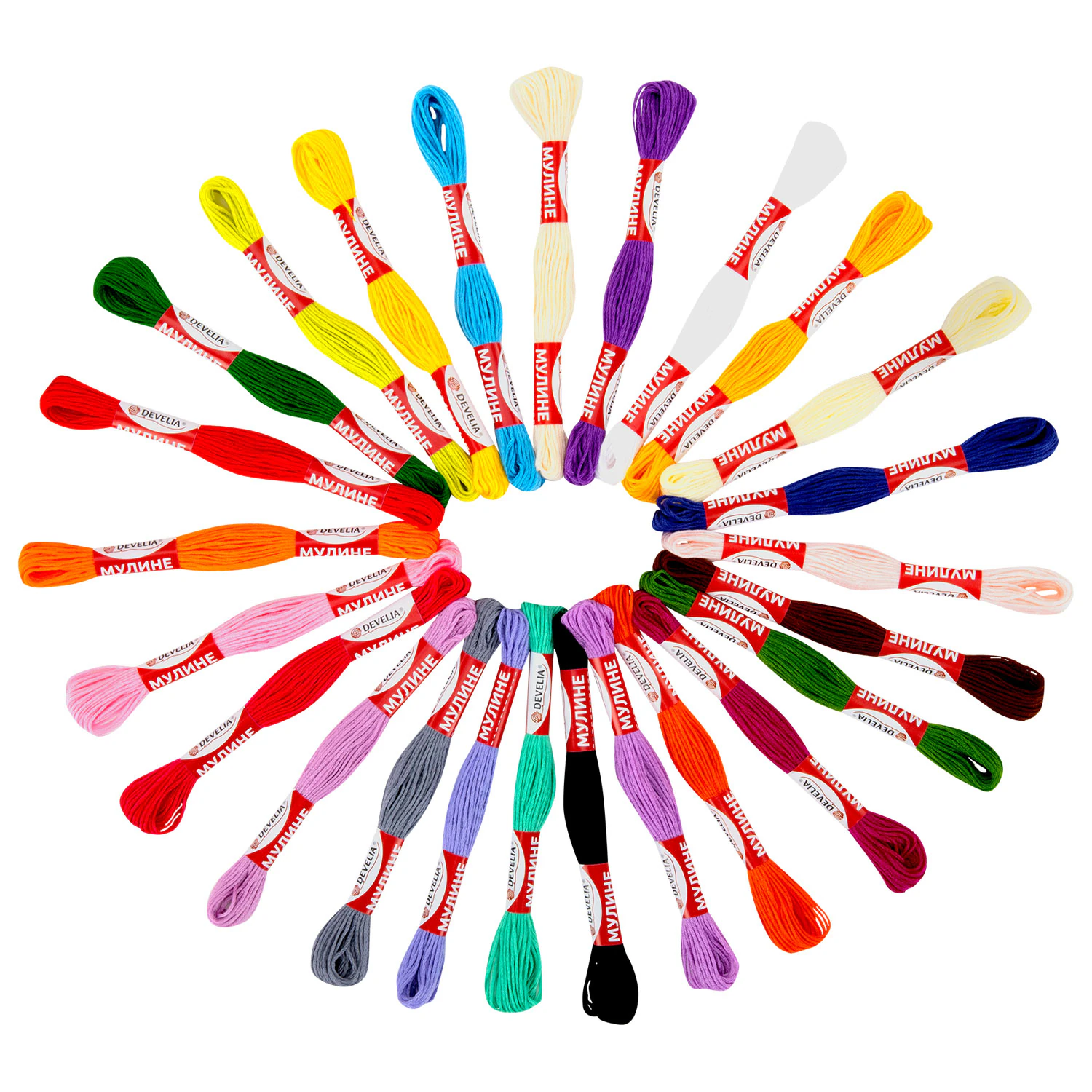 Набор ниток мулине DEVELIA состоит из 25 мотков ниток стандартных цветов в 12 сложений в намотке по 10 метров. Поставляются в пластиковом прозрачном боксе с удобной крышкой.