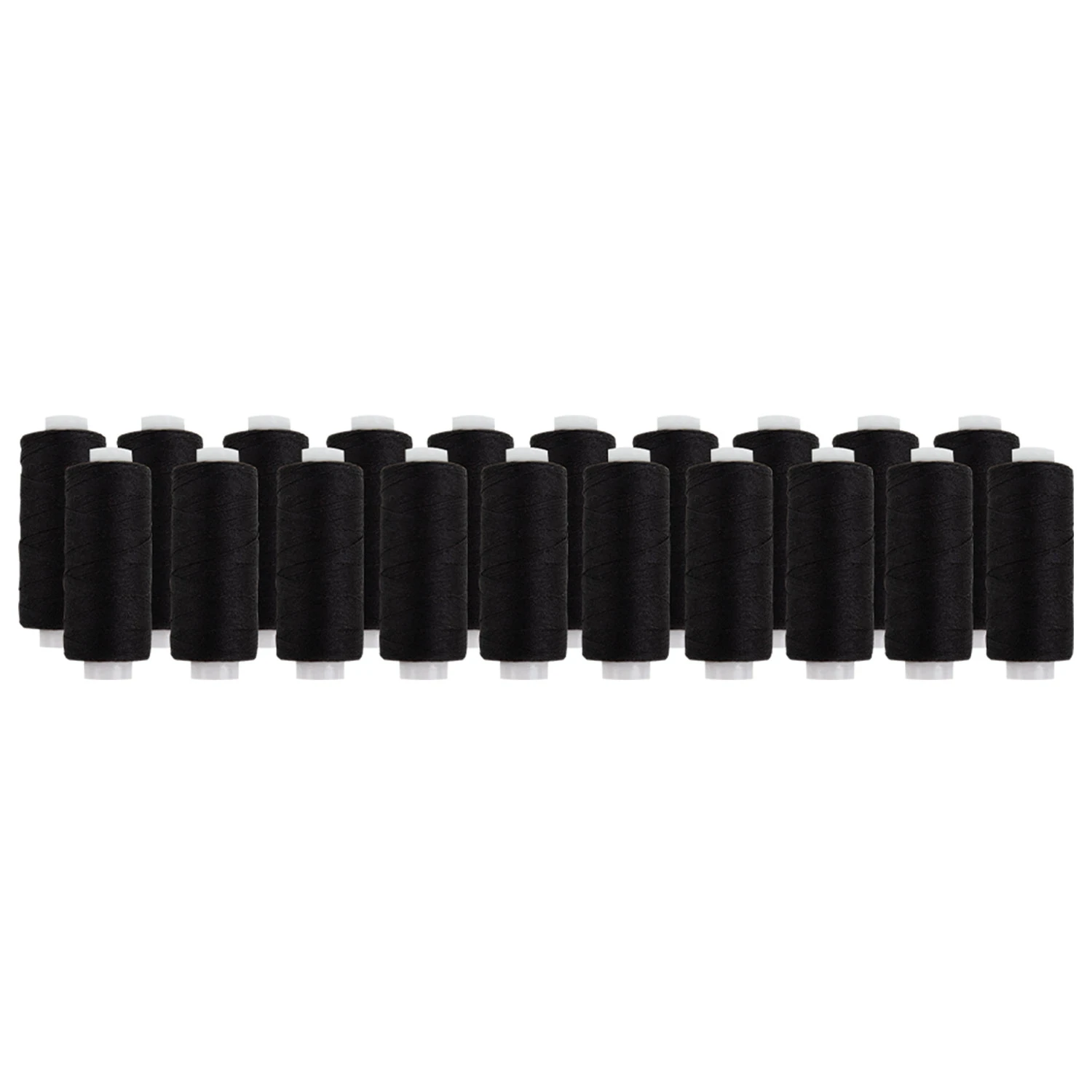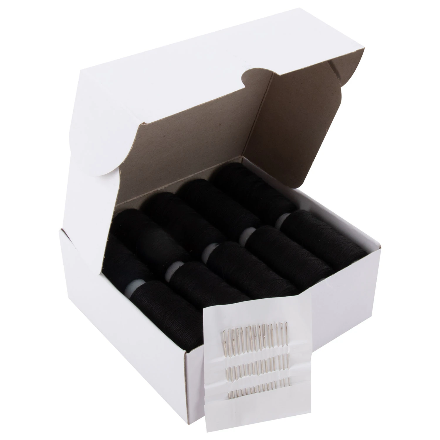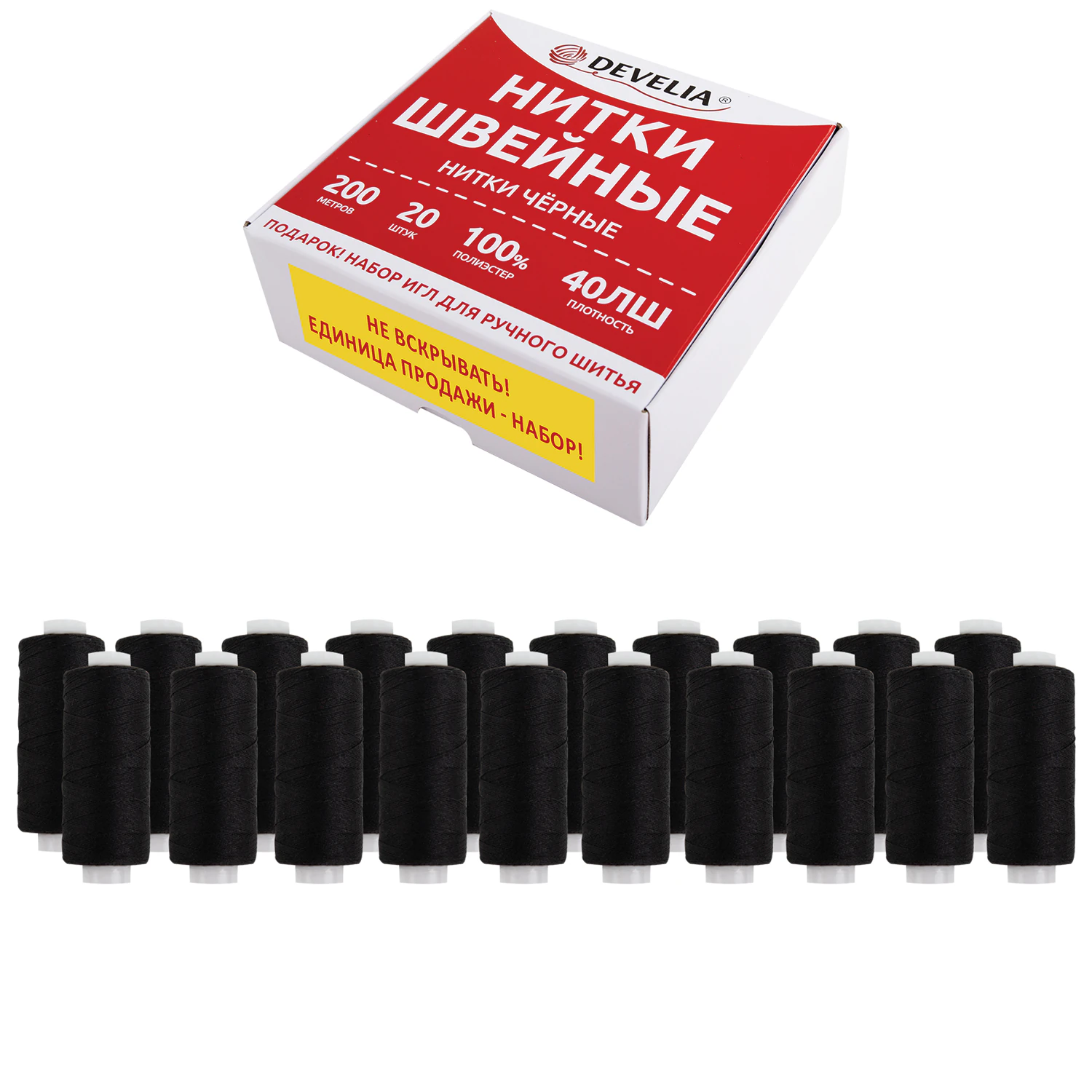 В набор входит 20 катушек 40 ЛШ черного цвета в намотке 200 м и набор игл для ручного шитья (15 штук). Поставляются в картонной коробке.