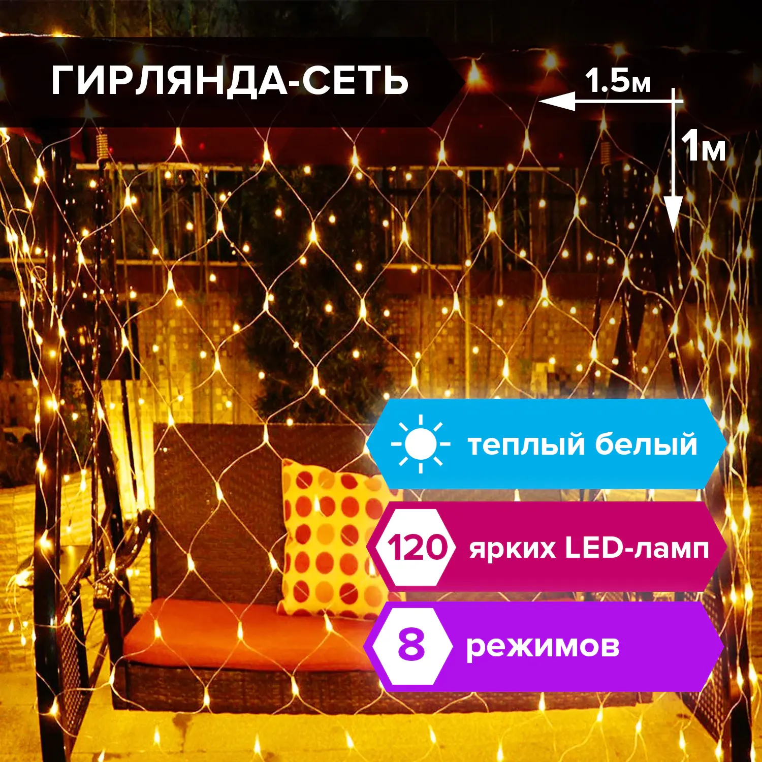 Электрогирлянда типа "Сеть" позволит украсить новогоднюю ель, окно внутри помещения или интерьер и привнести праздничное настроение вместе с теплым белым цветом гирлянды. Контроллер позволяет настроить свечение гирлянды по своему вкусу.