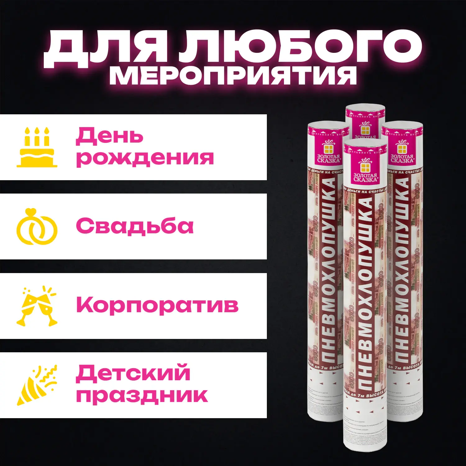 Комплект хлопушек высотой 40 см с бумажным наполнителем в виде купюр является абсолютно безопасным. Выстрел осуществляется под действием сжатого воздуха. Не является пиротехникой. Средняя дальность выстрела – 5-7 м. Корпус хлопушки состоит из двух частей: пневматического баллона со сжатым воздухом и картонного цилиндра с наполнителем. Рекомендуется использовать хлопушку внутри больших помещений или на улице.