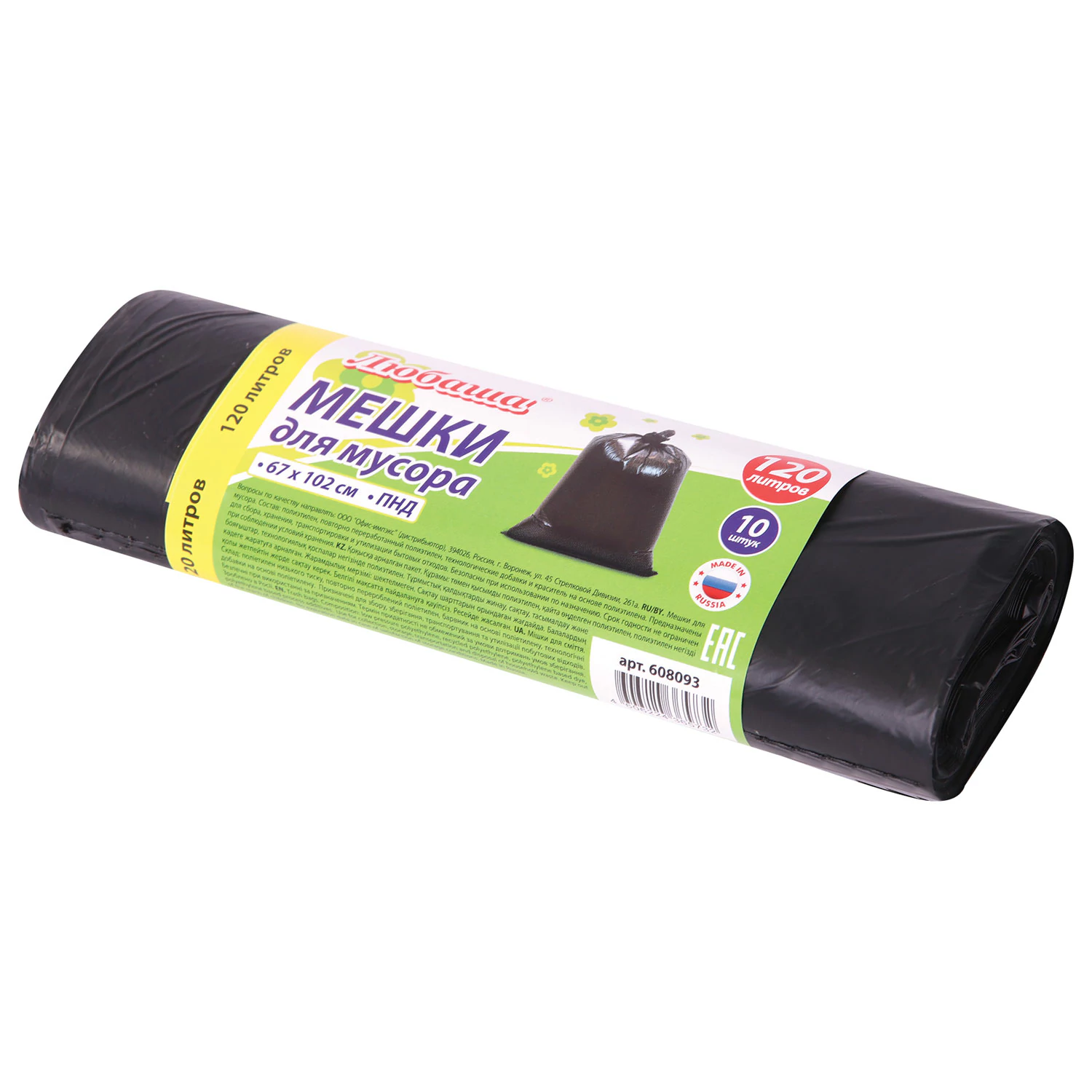 Изготовлены из полиэтилена низкого давления (ПНД) плотностью 11 микрон и имеют объем 120 литров. Размер мешка - 67х102 см (±5%). Поставляются в рулоне по 10 штук. Преимуществом данных мешков для мусора является высокая грузоподъемность.