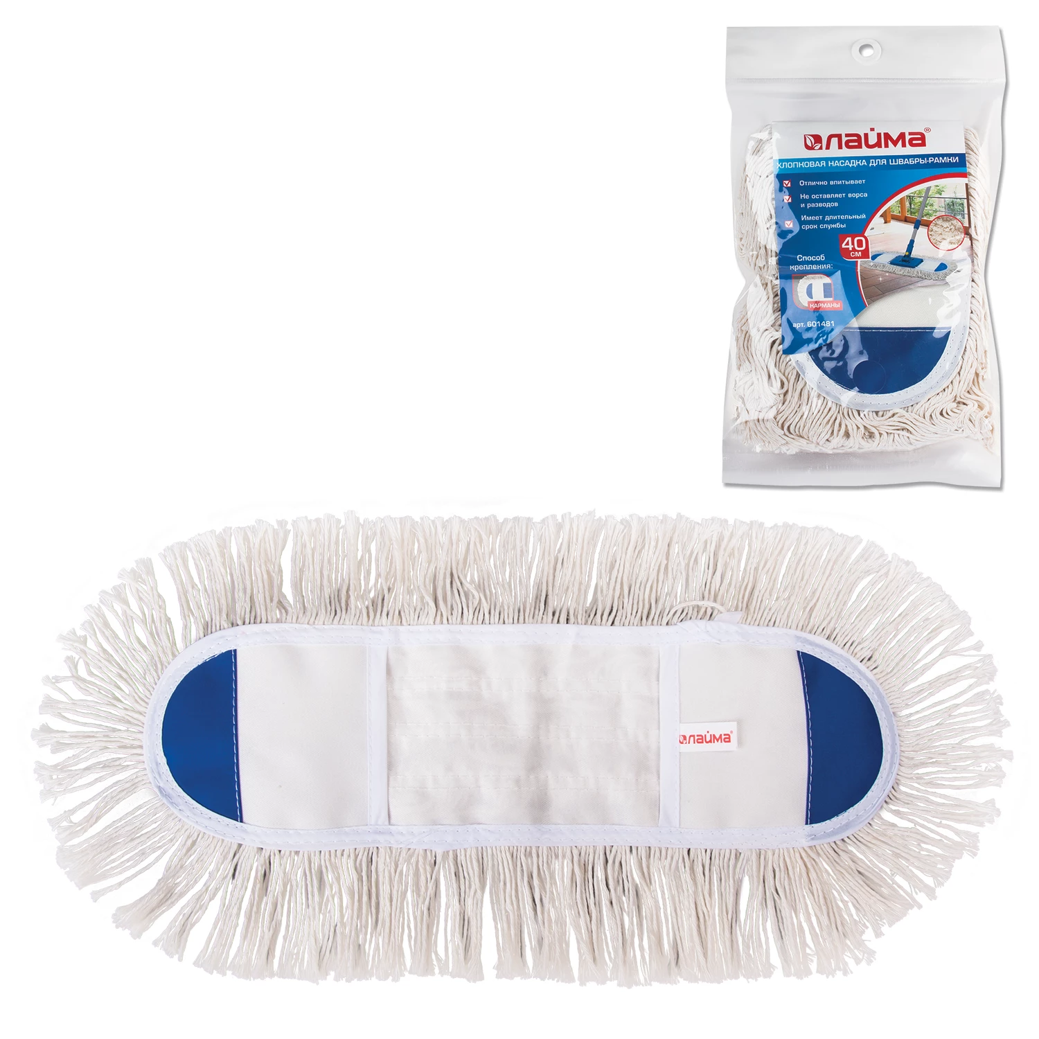 Насадка МОП из хлопка LAIMA предназначена для проведения влажной и сухой уборки помещения.МОП имеет форму плоского прямоугольника, такая форма и чистящая поверхность из ворса длиной 5 см позволяет удобно собрать грязь по углам и захватить большую площадь убираемой поверхности, что в свою очередь уменьшает временные затраты на уборку больших площадей. Устойчива к износу, что обеспечивает долгий срок службы уборочного инструмента. Выполнена из хлопка, имеет размер 40х11 см. Максимальный объем впитывания – 300 мл. Используется в комплекте со шваброй, крепится к держателю с помощью карманов.