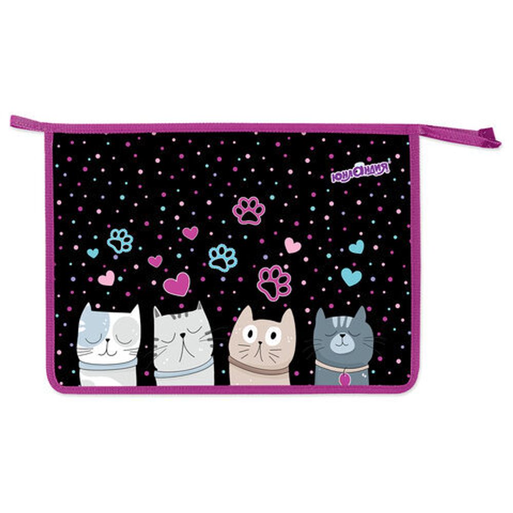 Папка для тетрадей ЮНЛАНДИЯ "Cat squad" – идеальное решение для организации и хранения учебных принадлежностей! Предназначена для тетрадей и учебных пособий формата А4.Изготовлена из прочного износостойкого пластика с тканевой окантовкой по краям. С одной стороны яркая печать коллекционного дизайна. Размер папки - 330х230 мм, ширина - 55 мм. Данный формат товара позволяет разместить канцелярские принадлежности и принадлежности для творчества внутри, а также бумаги, документы и учебные пособия формата А4. Папка имеет удобную застежку-молнию сверху.