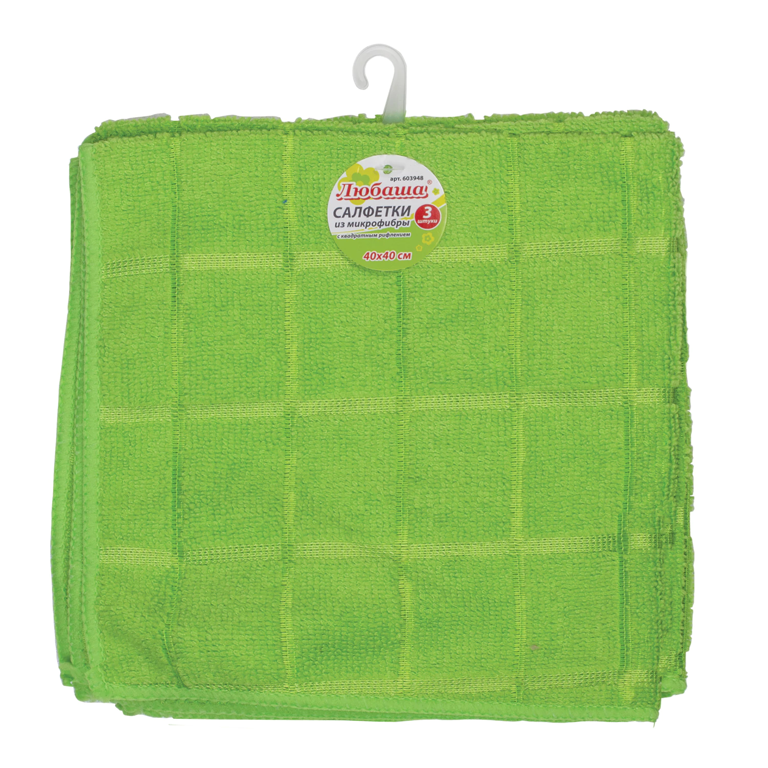 Универсальные салфетки ЛЮБАША из микрофибры применяются для сухой и влажной уборки. Отлично впитывают влагу, масло, грязь.Не оставляют разводов и ворса. Не царапают деликатные поверхности, такие как экраны и ЖК-мониторы, стекло, полированную мебель. Повышенная плотность 220 г/м2 обеспечивает высокую износостойкость и экономичный расход. Размер - 40х40 см. Сохраняют свои свойства даже при многократном применении. Поставляются в пакете с подвесом в количестве 3 штук.