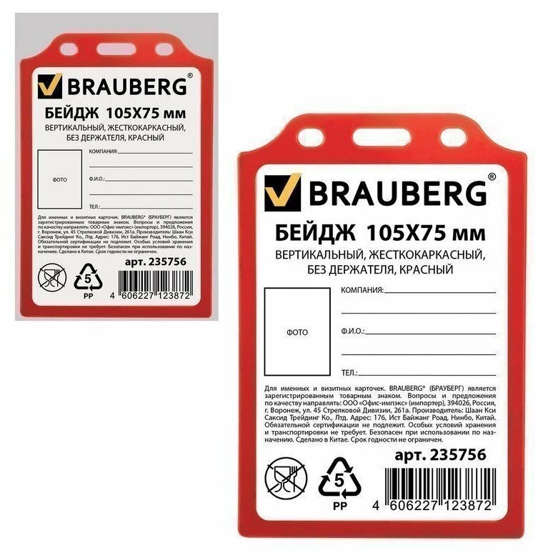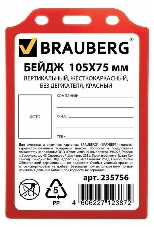 Вертикальный бейдж BRAUBERG для именной карточки предназначен для идентификации сотрудников в компаниях, а также на семинарах, тренингах, презентациях и других мероприятиях.Бейдж подходит для крепления на ленте, держателе с рулеткой. Изготовлен из жесткого пластика, гарантирующего долгий срок службы. Идеально подойдёт для чувствительных к механическим повреждениям магнитных карт и пропусков. Размер вкладыша 105х75 мм.