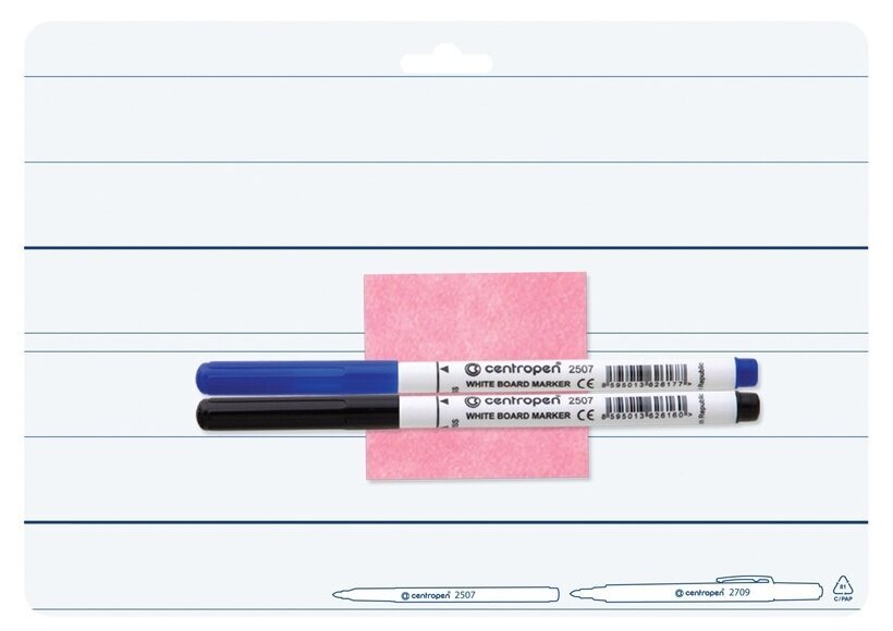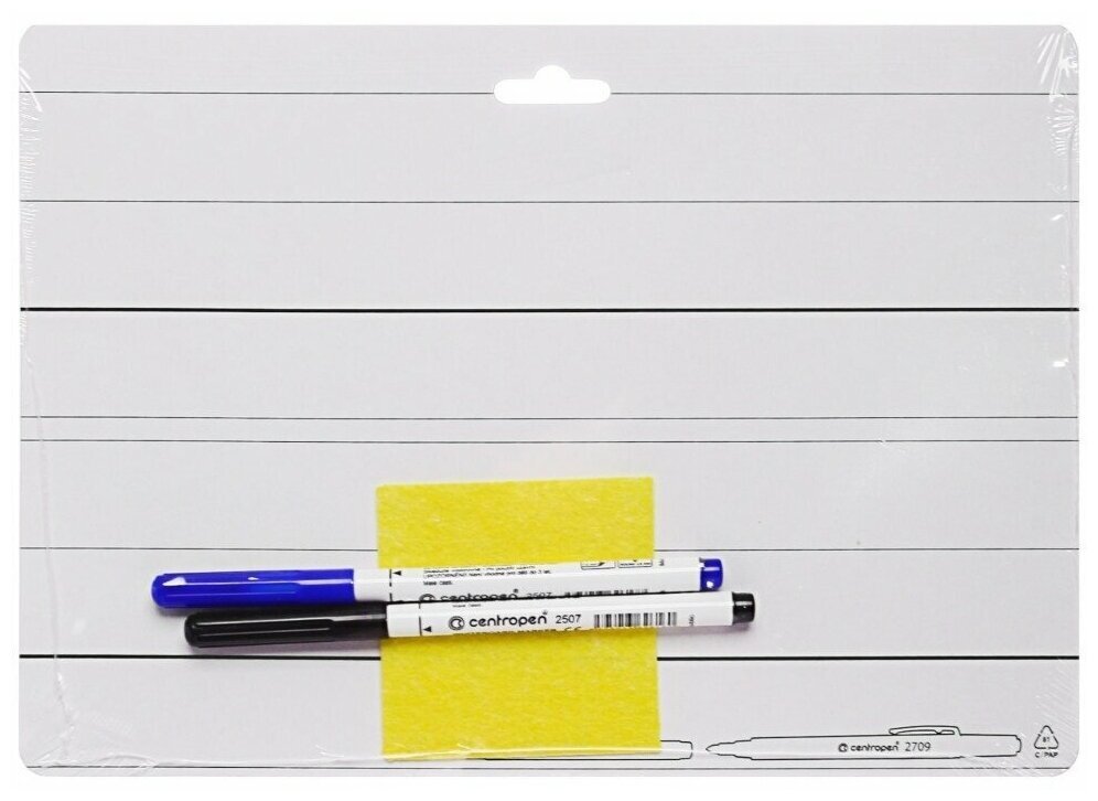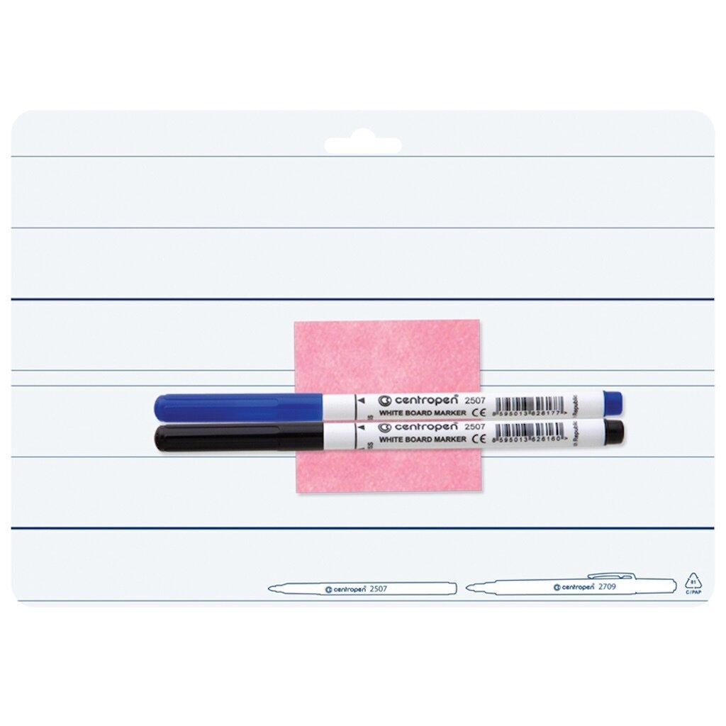 Двусторонняя маркерная доска формата А4 с расчерченными линиями строк и нижними вспомогательными линиями. В комплекте есть 2 маркера для доски и салфетка для удаления надписей.