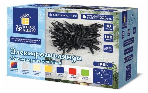 Уличная электрогирлянда ЗОЛОТАЯ СКАЗКА "Heavy Rain" позволит как создать праздничную атмосферу вне помещений, например, украсить фасад зданий, так и украсить внутренний интерьер.Электрическая светодиодная гирлянда представляет собой светодиоды, соединенные между собой электрическим проводом. Тип конструкции электрогирлянды - "Нить". Данный тип конструкции предусматривает, что все светодиоды соединены последовательно, отсутствуют ответвления от основного провода, отсутствуют элементы электрической цепи с параллельным соединением. Длина рабочей части гирлянды составляет 10 м, длина силового кабеля (кабеля питания) - 1,5 м. Количество светодиодов - 100 шт. Расстояние между светодиодами - 10 см.