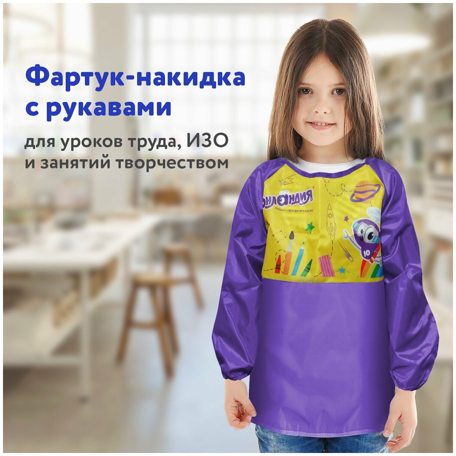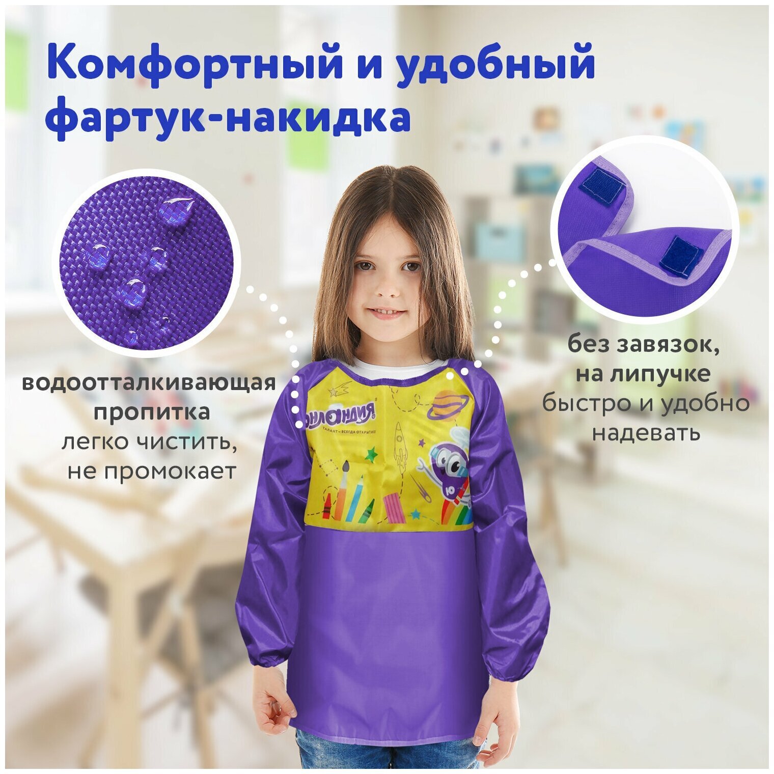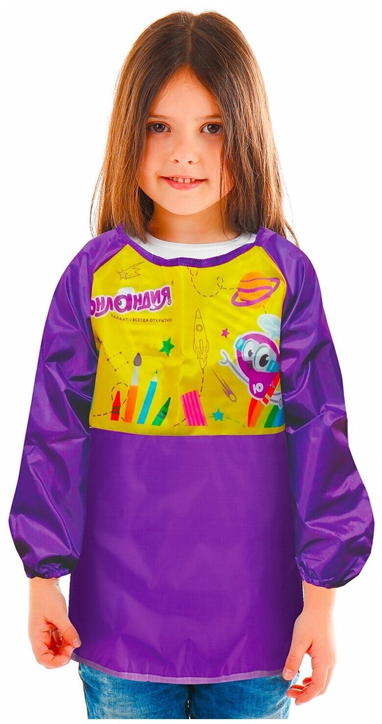 Фартук-накидка ЮНЛАНДИЯ предназначен для уроков труда и занятий творчеством. Фартук изготовлен из водоотталкивающего материала, который защитит одежду от загрязнений в процессе занятий. Предусмотрен для многоразового использования.Выполнен из плотного полиэстера с водоотталкивающей пропиткой. Застегивается сзади на липучку - быстро и удобно.