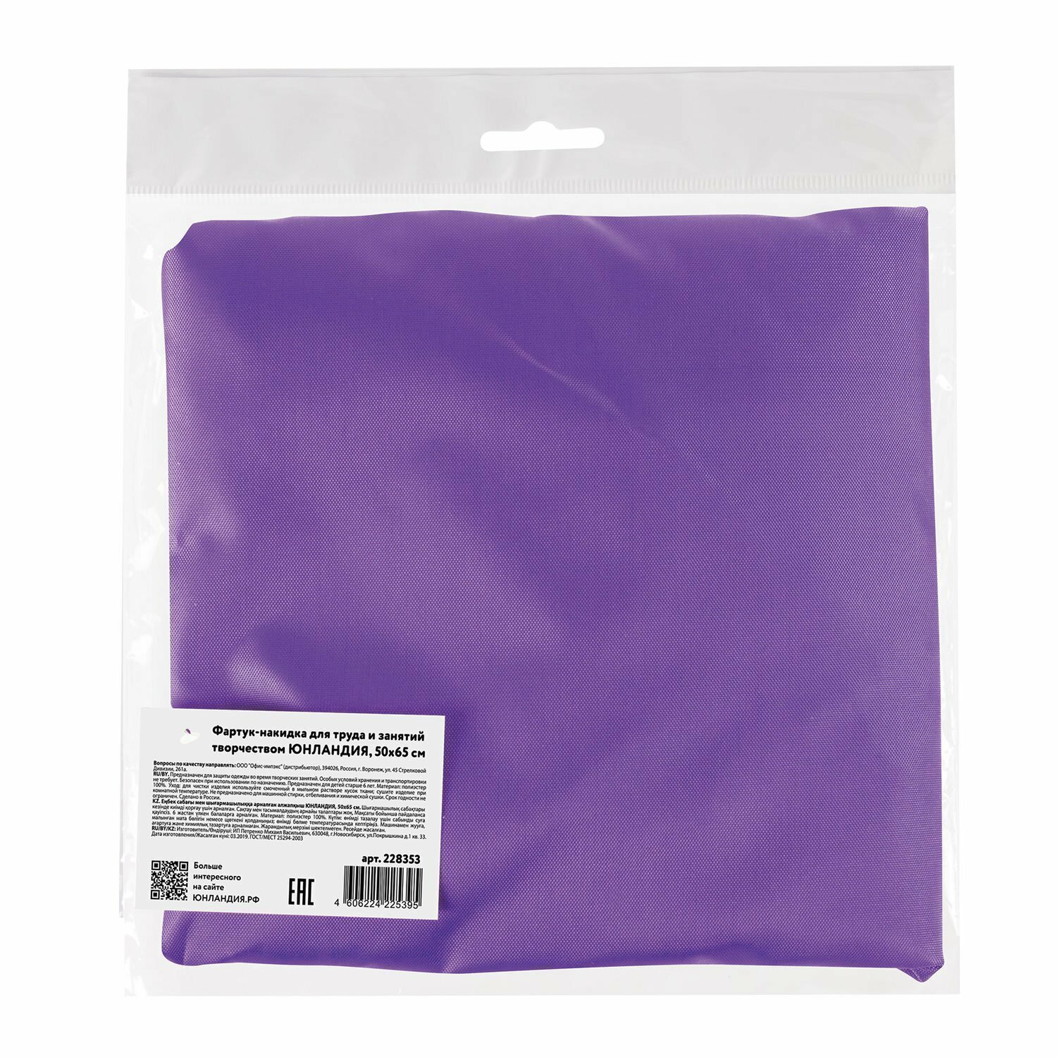 Упакован в прозрачный пакет с европодвесом в сложенном виде. Заметная яркая этикетка с основной информацией о товаре подчеркивает высокий уровень качества и заботы о потребителе, и выгодно выделяет товар в магазине.