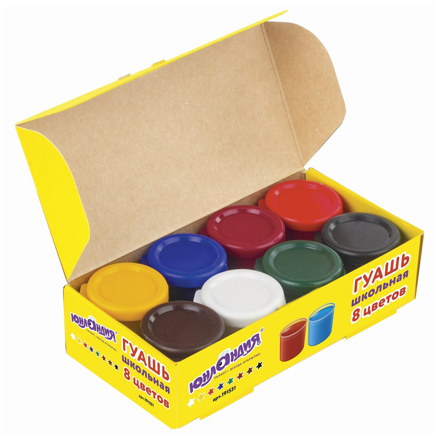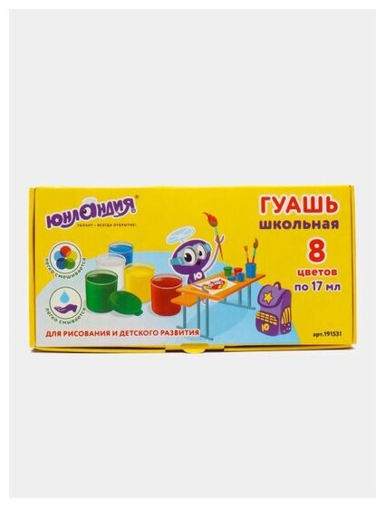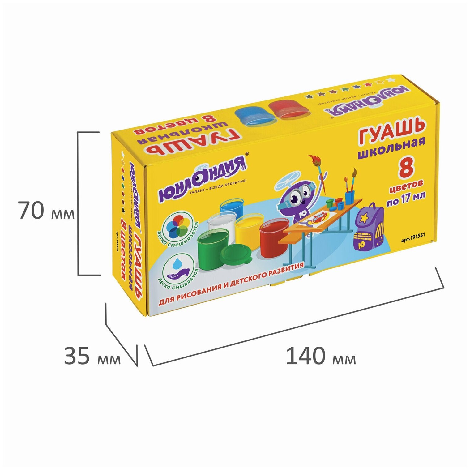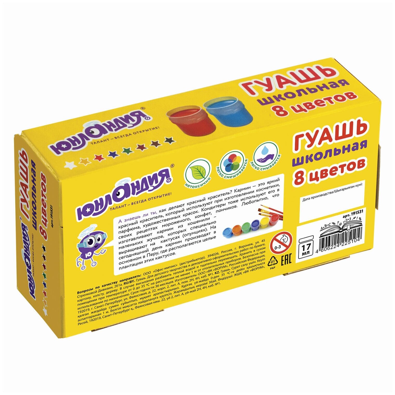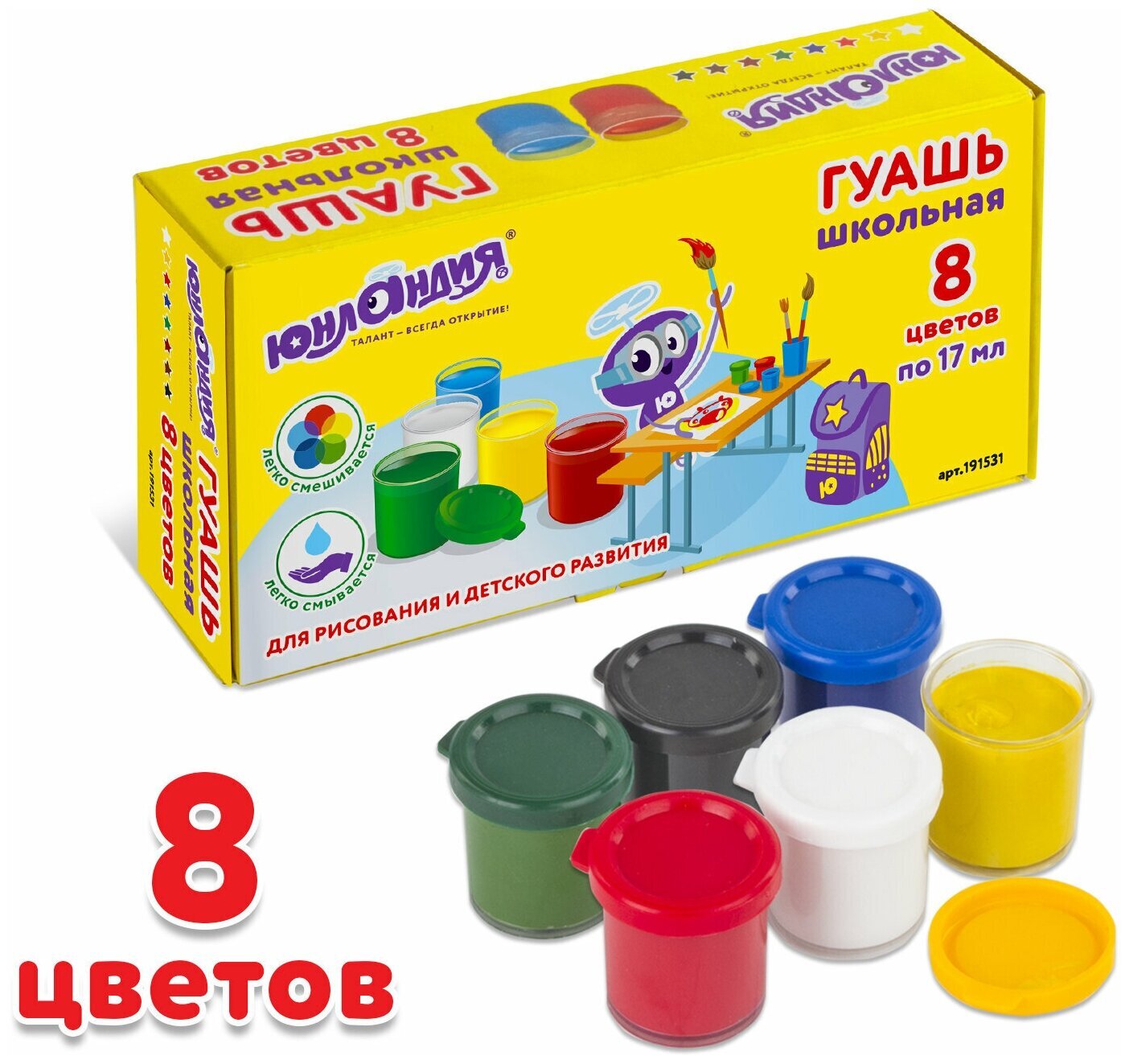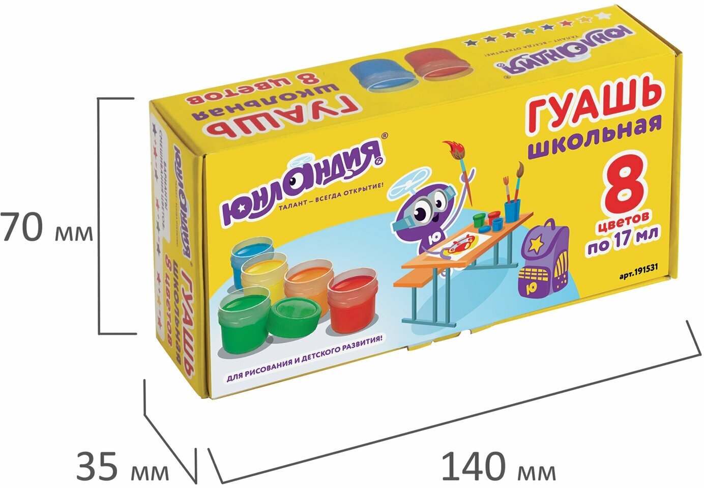 Школьная гуашь высшего качества ЮНЛАНДИЯ поможет создать юным художникам первые шедевры. Идеальна для нанесения на бумагу, картон, дерево, стекло, керамику.8 ярких сочных цветов красок полностью безопасны в использовании, не токсичны и не имеют резкого запаха. Гуашь имеет высокую светостойкость и укрывистость, легко размывается водой, хорошо наносится, без труда удаляется с рук и одежды. Краска находится в пластмассовой герметичной баночке, объем которой равен 17 мл. Общий объем - 136 мл.