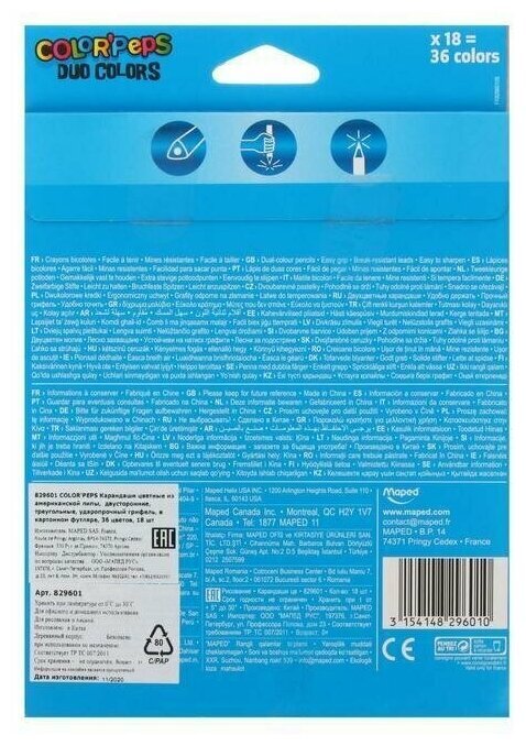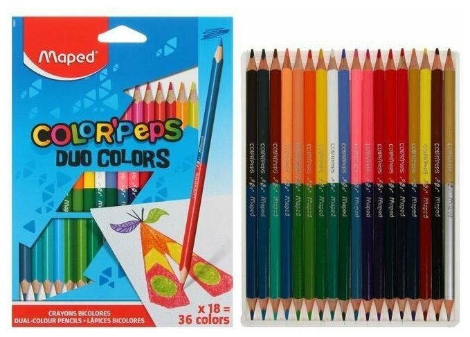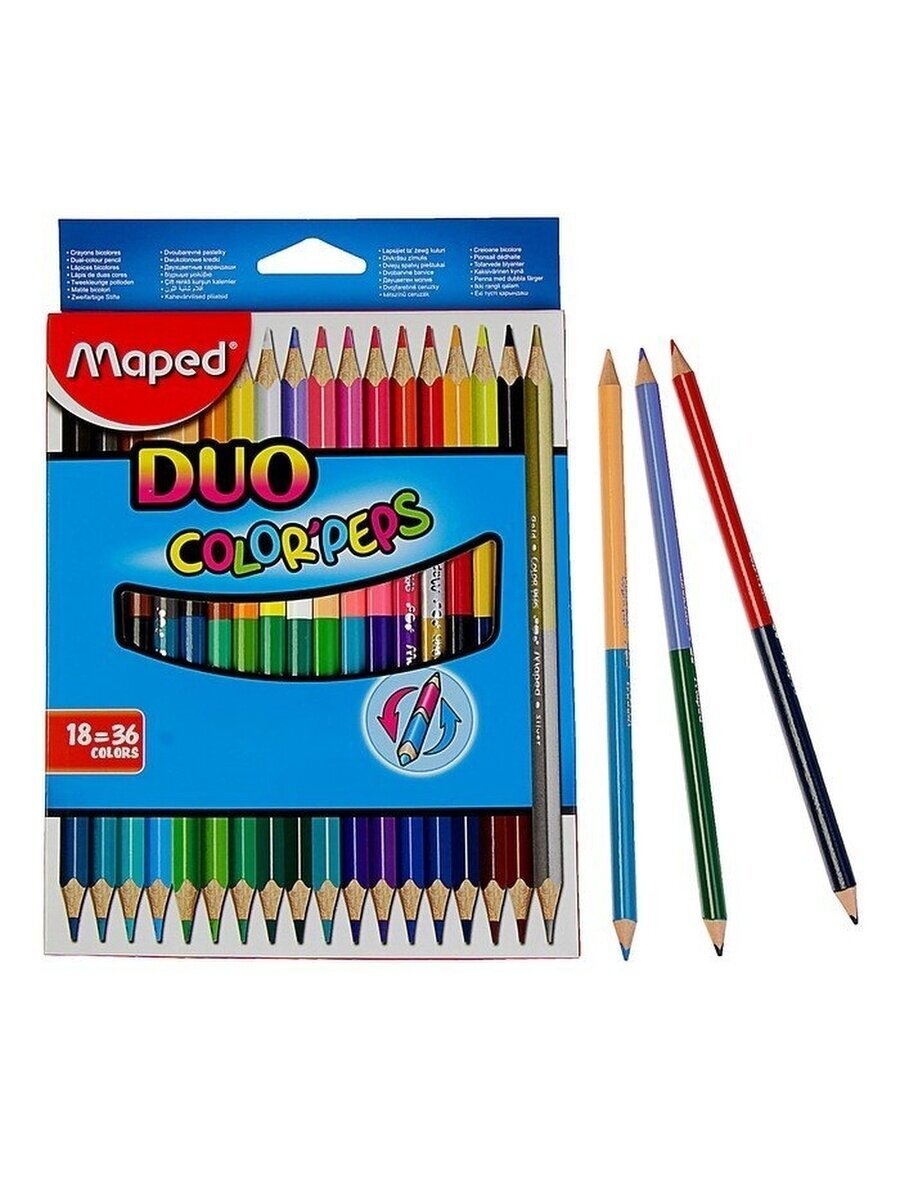 Высококачественные заточенные цветные карандаши MAPED "Color'Peps Duo" в корпусе из американской липы. Двусторонние карандаши: в 2 раза больше цветов - в 2 раза меньше места в пенале!Мягкий и прочный грифель 2,9 мм в каждом карандаше обеспечит яркие, насыщенные оттенки. В наборе представлено 18 штук - 36 цветов, включая два уникальных цвета - золотистый и серебристый. Эргономичный трехгранный корпус обеспечит комфорт при использовании.