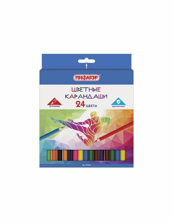 Цветные карандаши ПИФАГОР "БЫСТРЕЕ! ВЫШЕ! СИЛЬНЕЕ!" предназначены для детского творчества, а упаковка с забавным дизайном порадует как детей дошкольного и младшего школьного возраста, так и взрослых.Набор состоит из 24 цветов: белый, каштановый, темно-коричневый, бежевый, малиновый, розовый, коричневый, коралловый, красный, персиковый, серый, оранжевый, канареечный, желтый, салатовый, светло-зеленый, бирюзовый, зеленый, темно-синий, темно-зеленый, синий, фиолетовый, сиреневый, черный. Шестигранная форма сечения корпуса позволяет не скатываться карандашу с поверхности стола во время занятий рисованием. Они изготовлены из высокосортной белой древесины ценных пород и имеют лакированный корпус. Качество древесины и исполнения гарантируют легкую заточку. Грифель из натуральных материалов и пигментов диаметром 3 мм обладает повышенной прочностью. Все карандаши заточены и поставляются в картонной упаковке с европодвесом.