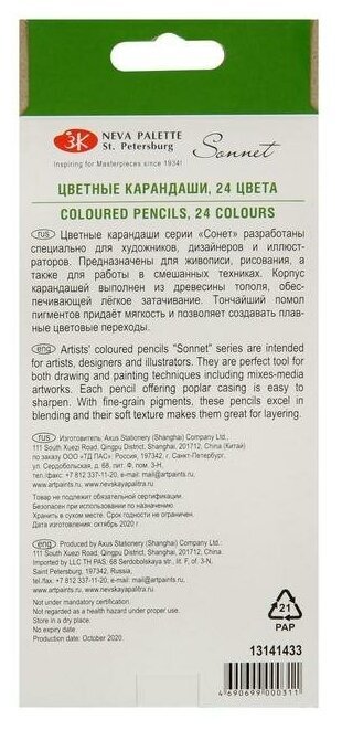 Профессиональные цветные карандаши высокого качества. Предназначены для использования в графическом искусстве, где важна чёткая передача цвета и линий. Абсолютная чистота, насыщенность и равномерность цвета по всей поверхности рисунка.