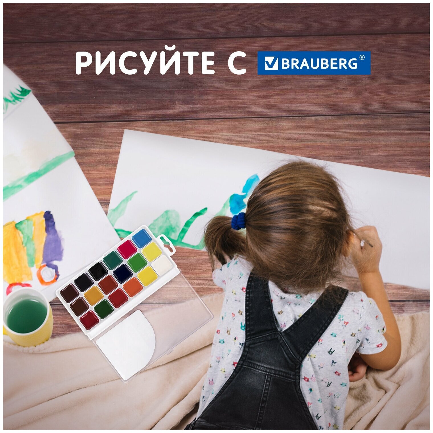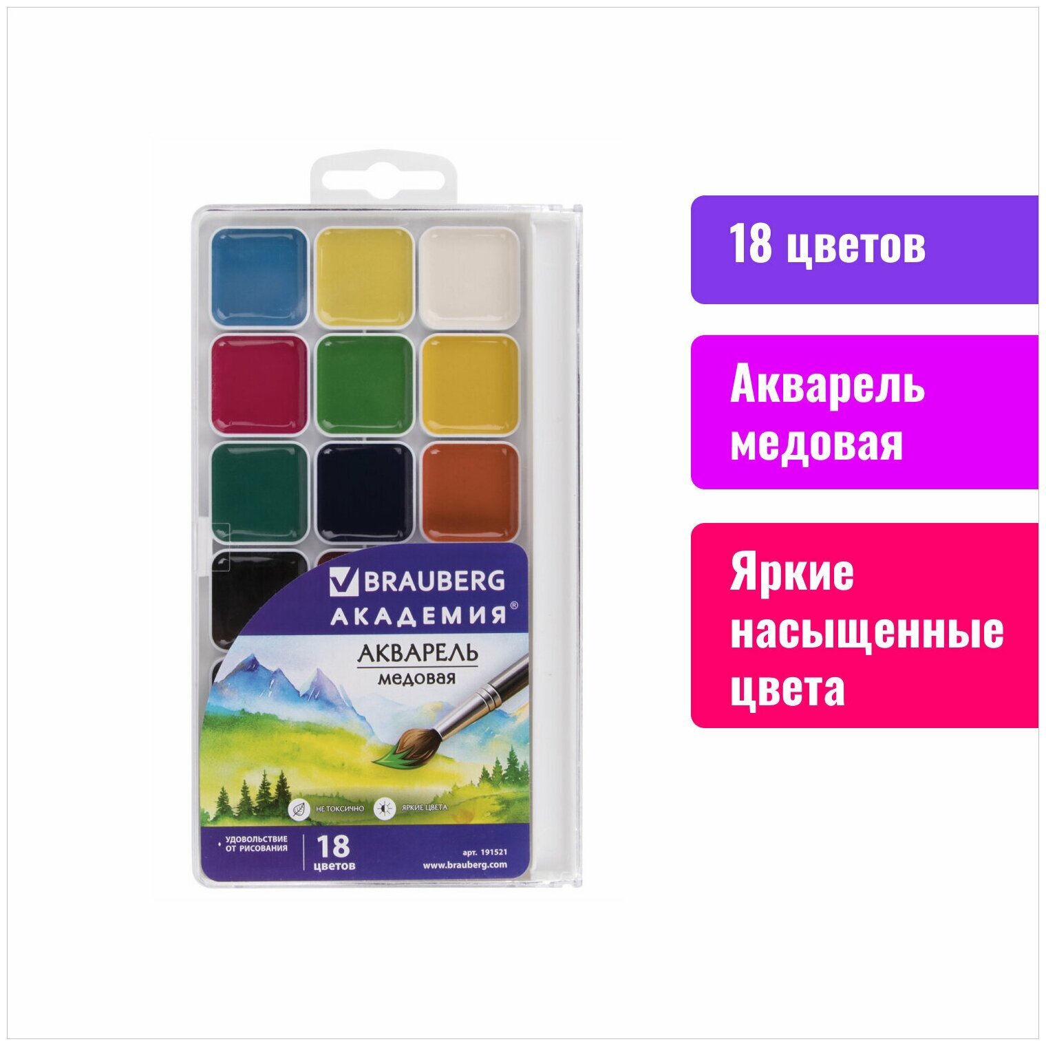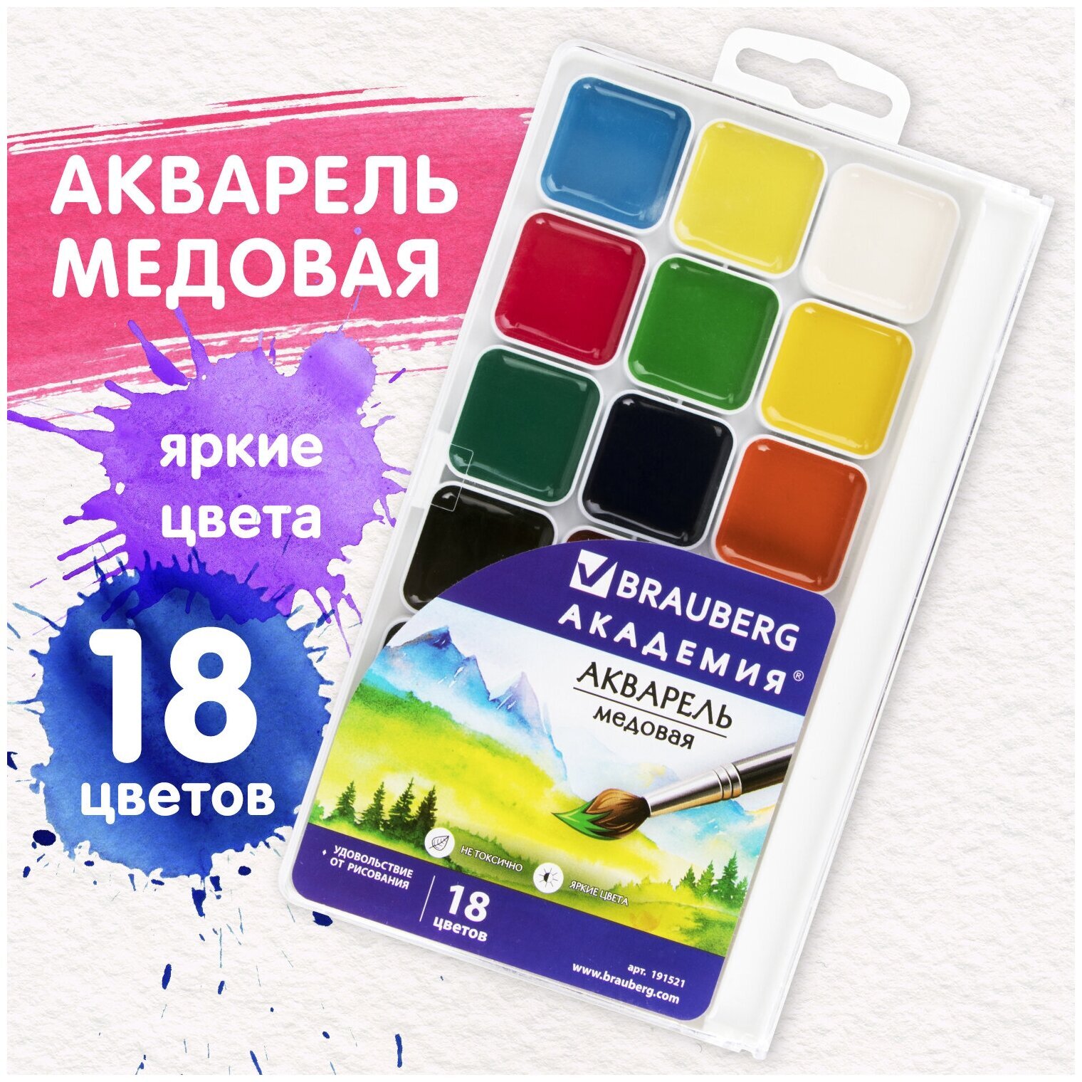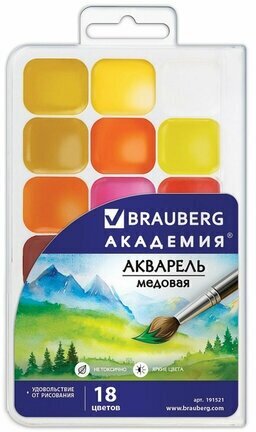 Краски акварельные BRAUBERG применяются во многих сферах: на занятиях рисованием в школе, для иллюстраций, изображения пейзажей, на курсах живописи. Кисть в комплект не входит.Содержат 18 ярких цветов. Обладают отличной укрывистостью и высокой светоустойчивостью, прекрасно смешиваются и сохраняют яркость при высыхании. Отлично ложатся на бумагу. Изготовлены с добавлением патоки. Нетоксичны. Удобная квадратная форма кюветов. Имеется отделение для кисточки. Поставляются в пластиковой коробке с европодвесом.