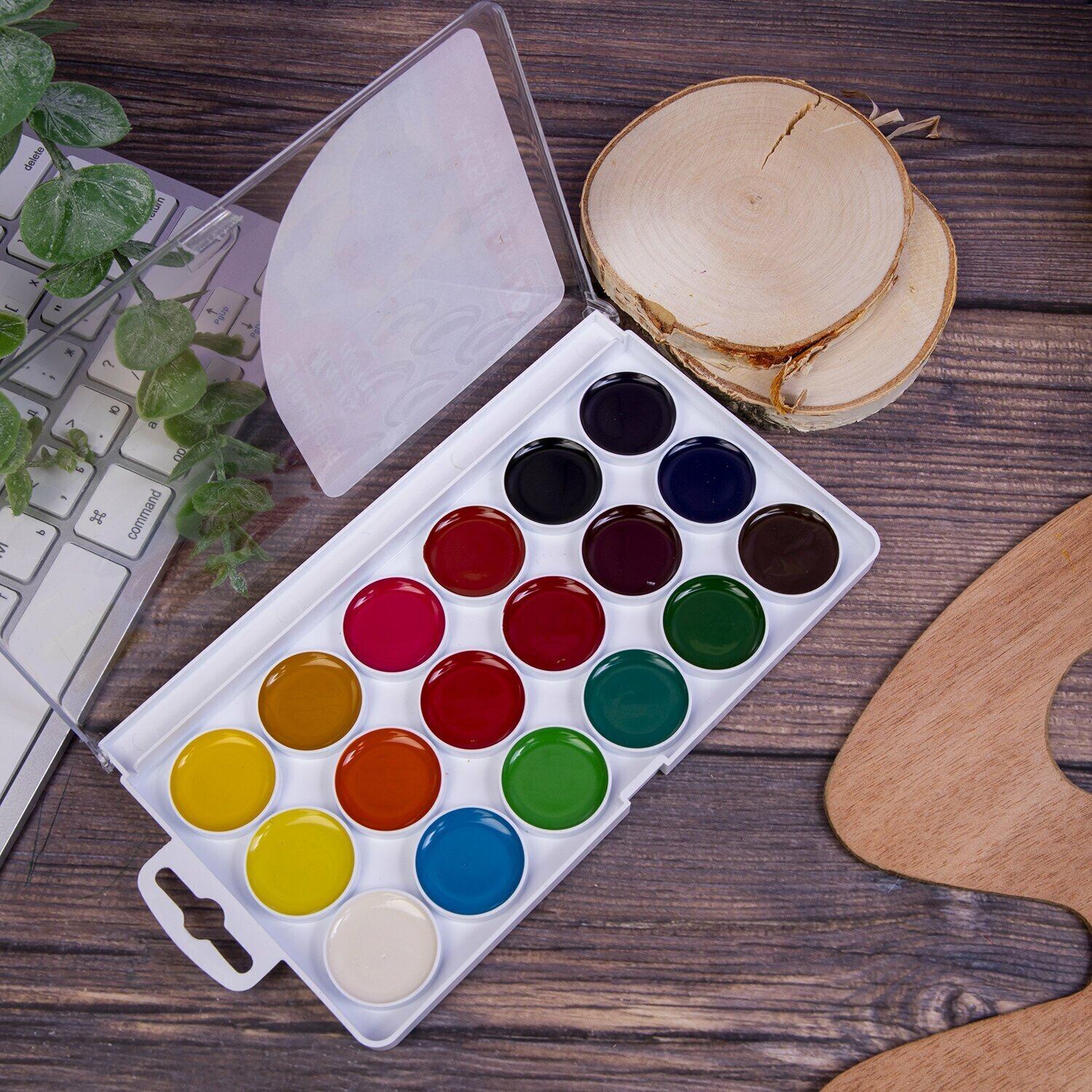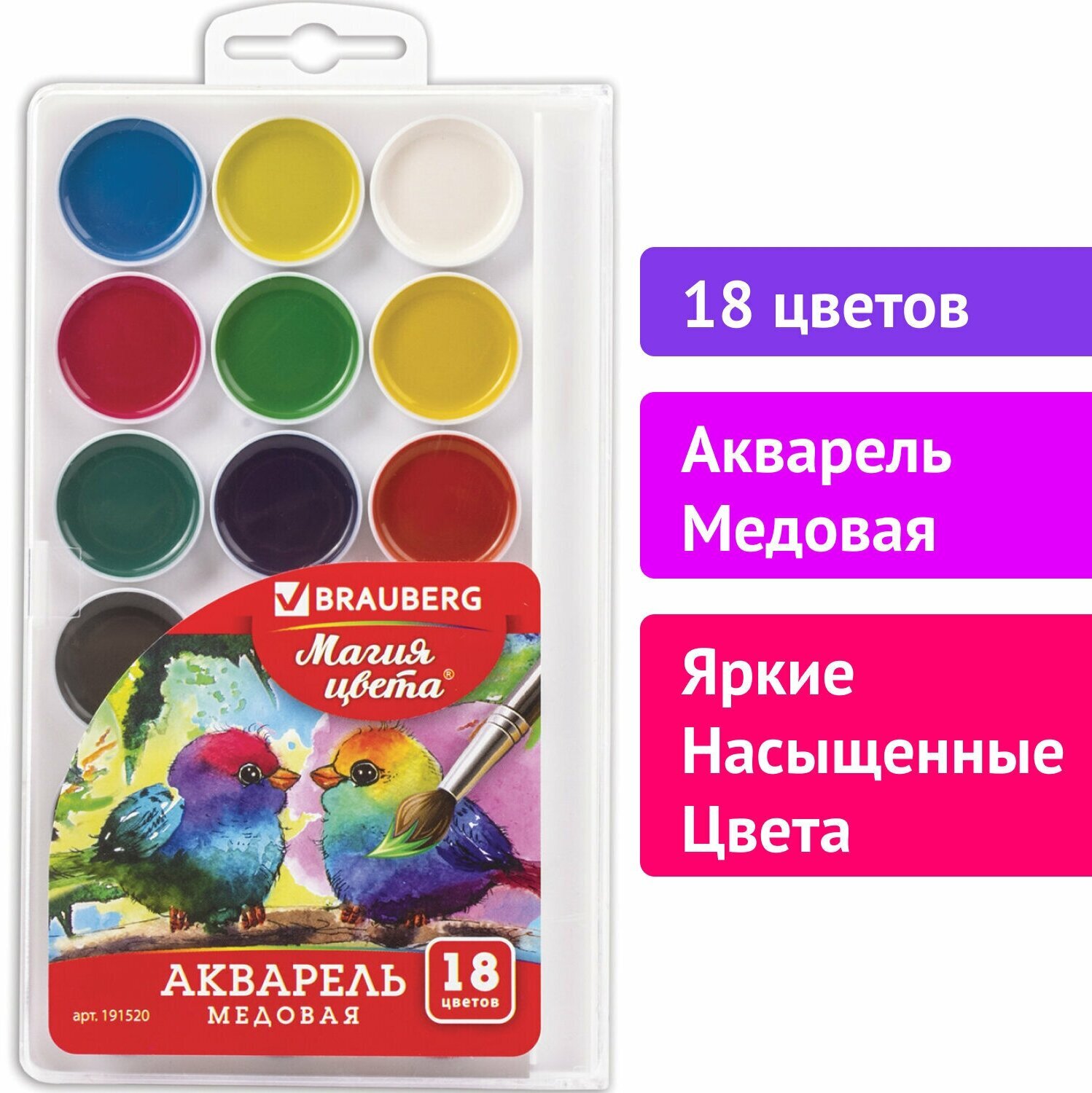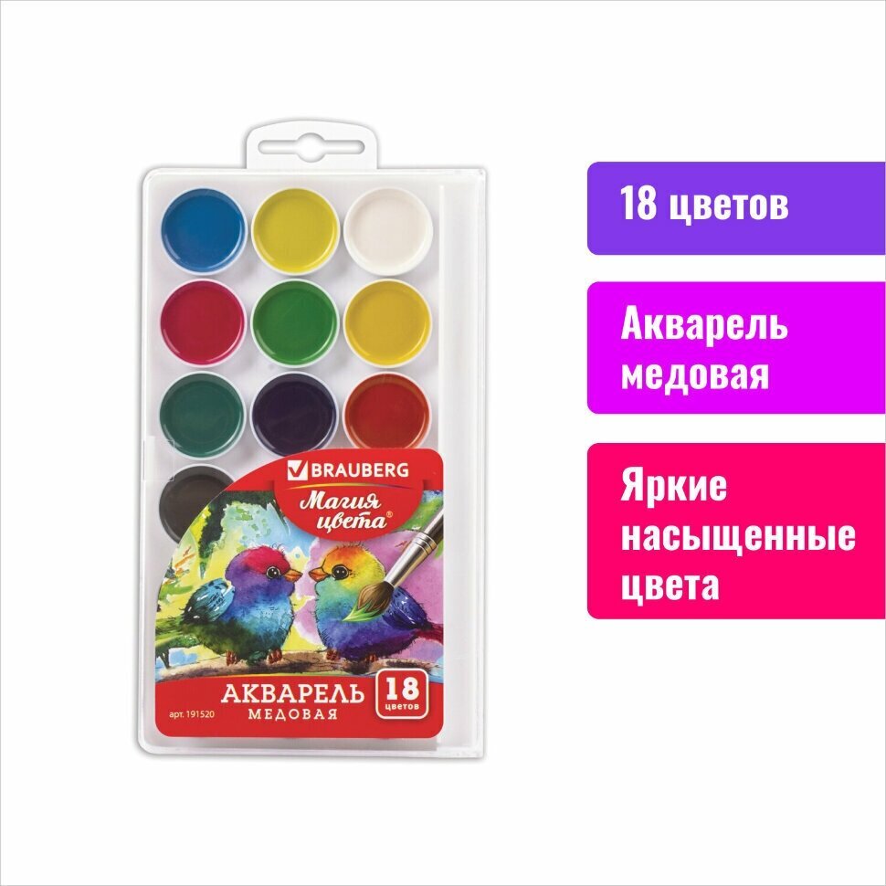 Краски акварельные BRAUBERG применяются во многих сферах: на занятиях рисованием в школе, для иллюстраций, изображения пейзажей, на курсах живописи. Кисть в комплект не входит.Содержат 18 ярких цветов. Обладают отличной укрывистостью и высокой светоустойчивостью, прекрасно смешиваются и сохраняют яркость при высыхании. Отлично ложатся на бумагу. Изготовлены с добавлением патоки. Нетоксичны. Удобная круглая форма кюветов. Имеется отделение для кисточки. Поставляются в пластиковой коробке с европодвесом.