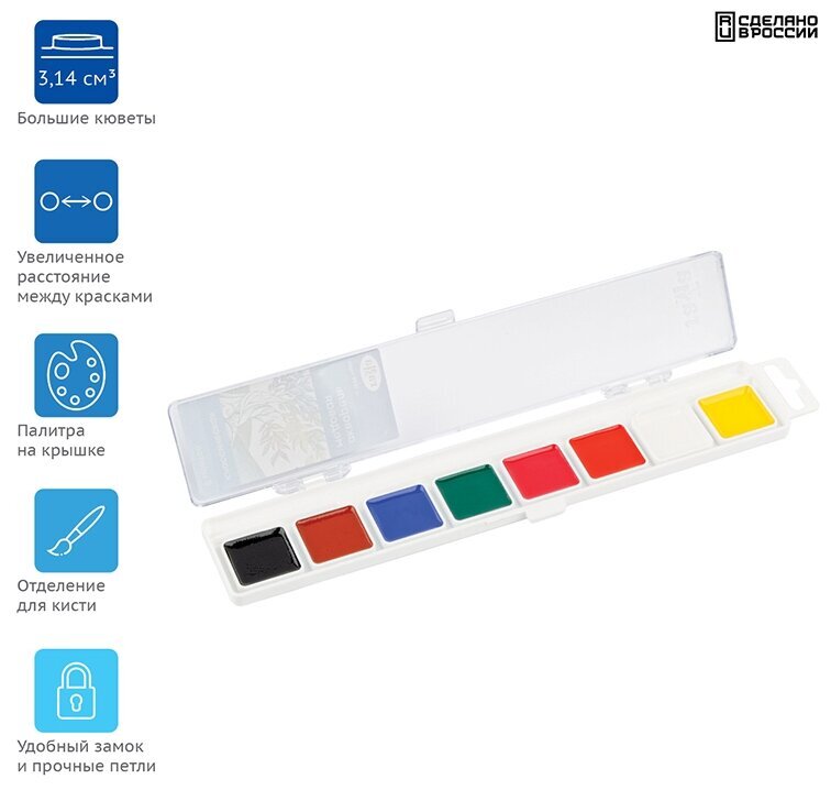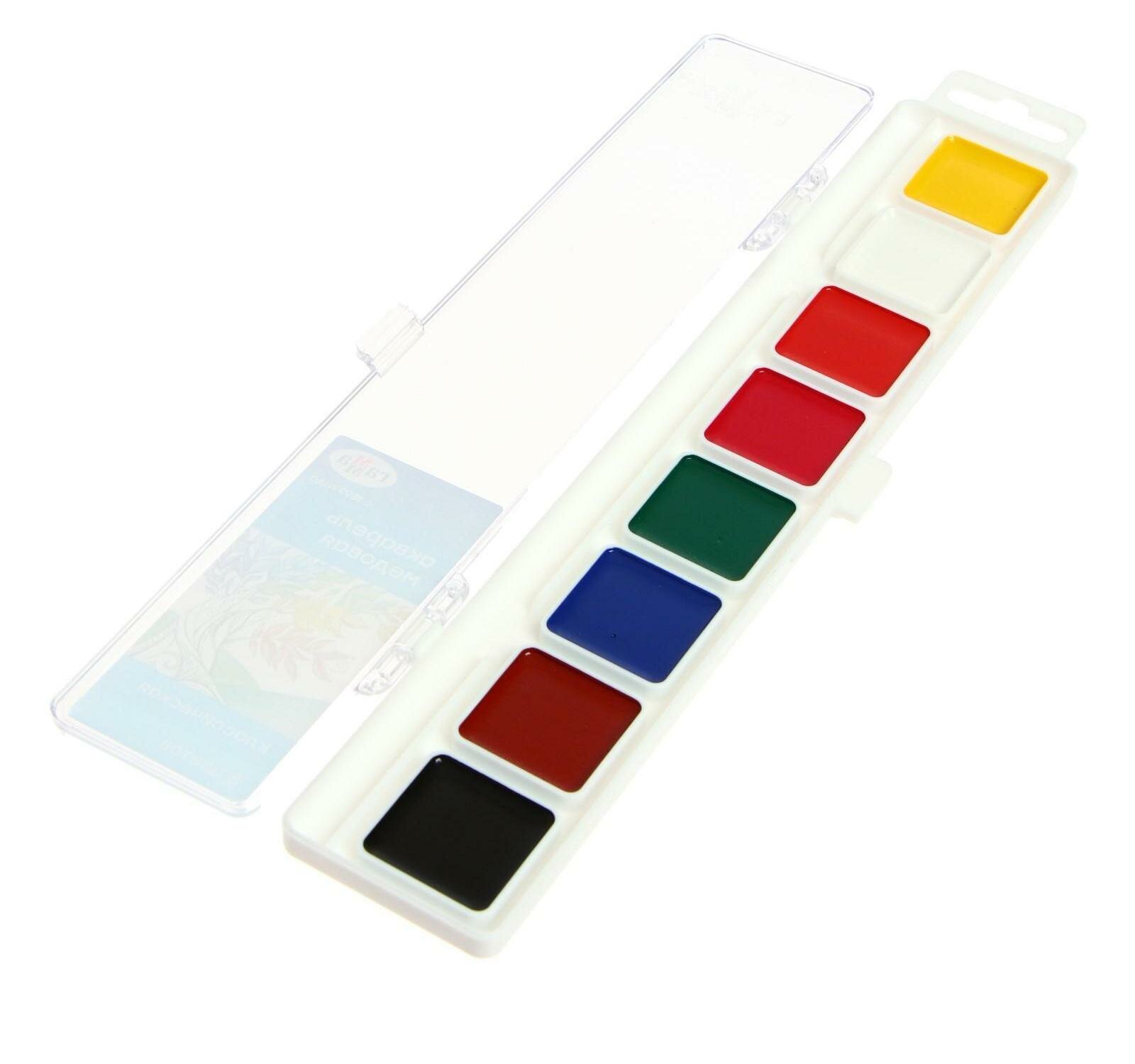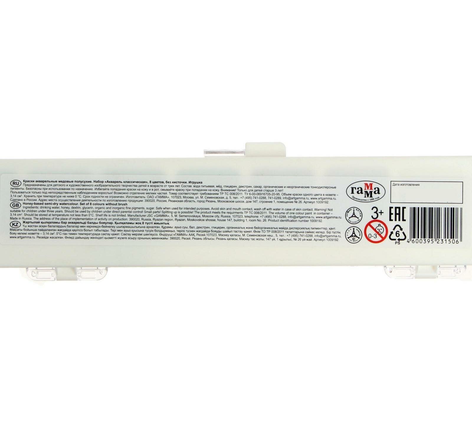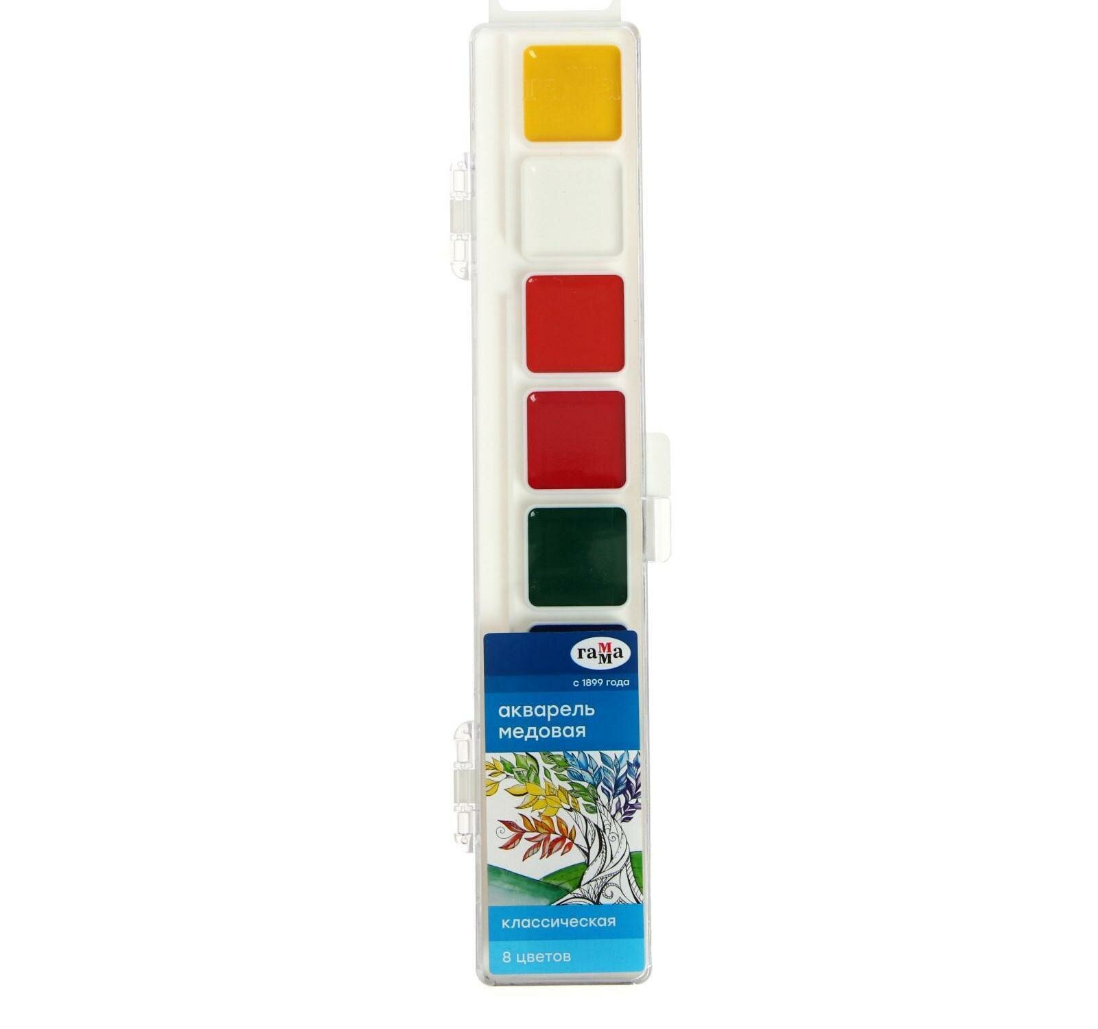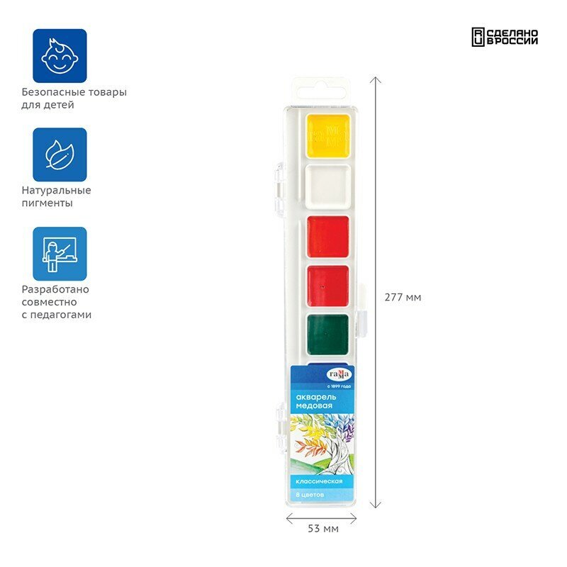 Медовая акварель ГАММА "Классическая" в обновленной подложке: больший объем краски в кюветах — больше возможностей для творчества!Благодаря качественному прозрачному связующему в составе цвета акварели яркие и чистые. Увеличенное расстояние между кюветами, чтобы краски не смешивались во время рисования. Если нужно получить новый оттенок, на крышке предусмотрена палитра. Предусмотрено отделение для кисти с удобными зонами захвата, чтобы ребенок мог быстро достать кисть, не переворачивая подложку. Удобный замок и прочные петли плотно фиксируют крышку. В наборе 8 цветов.