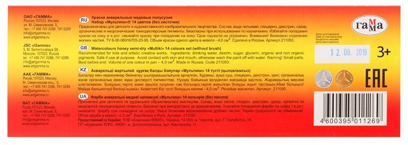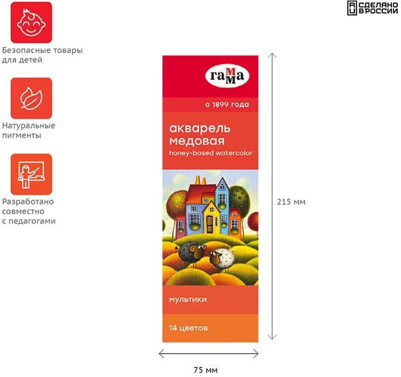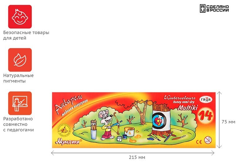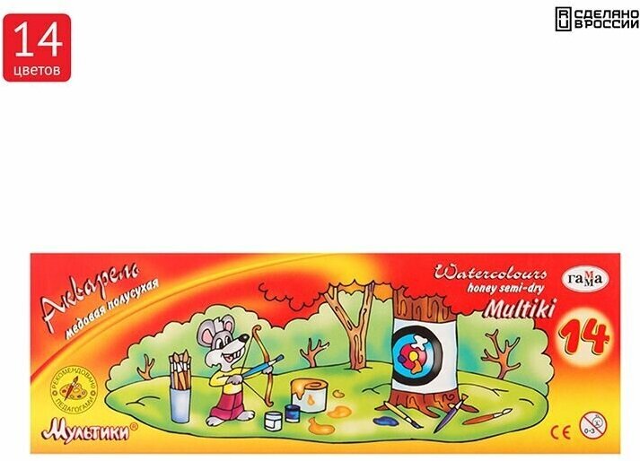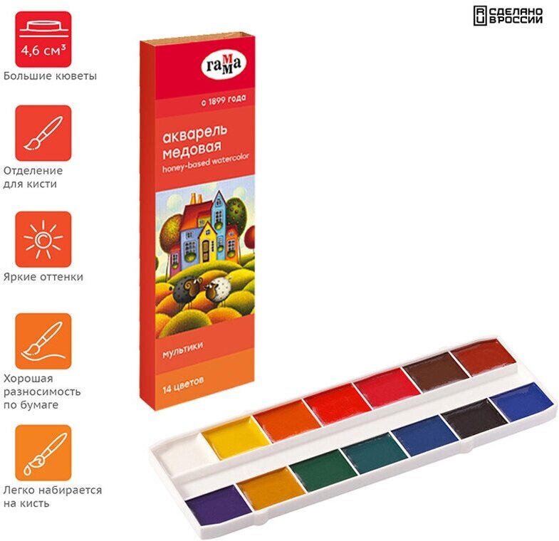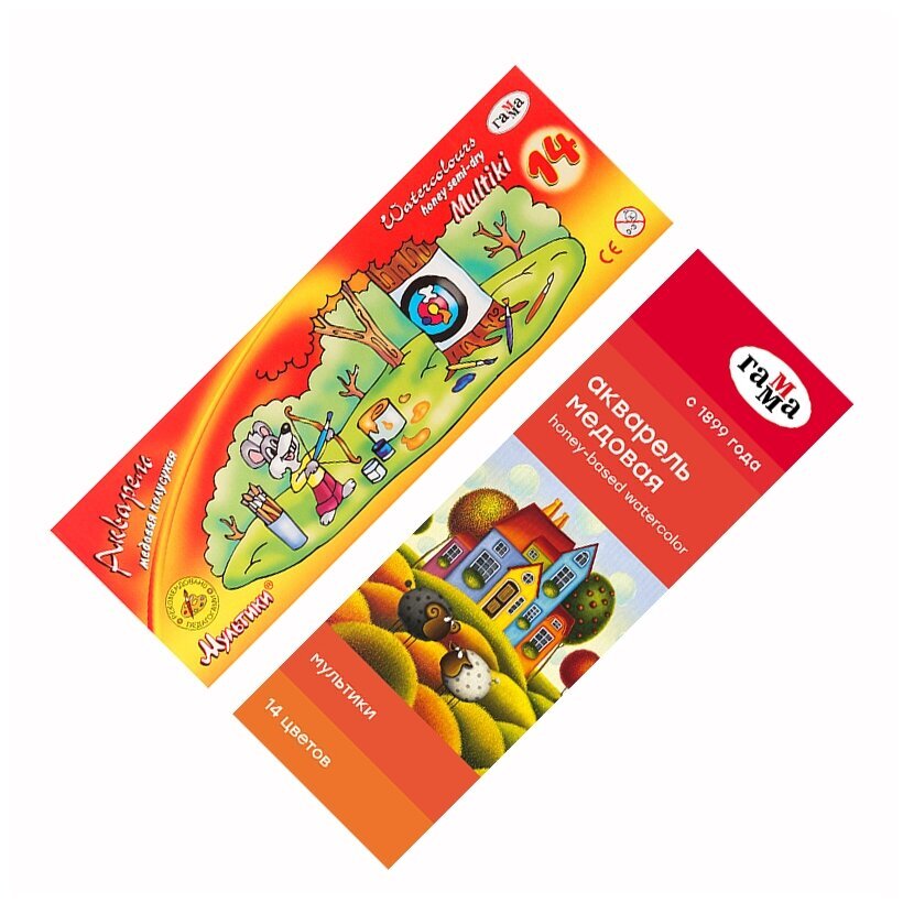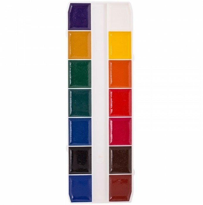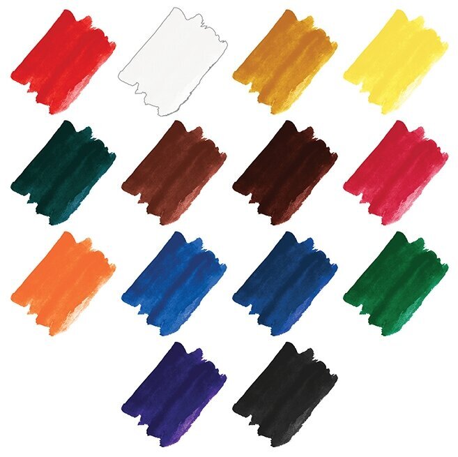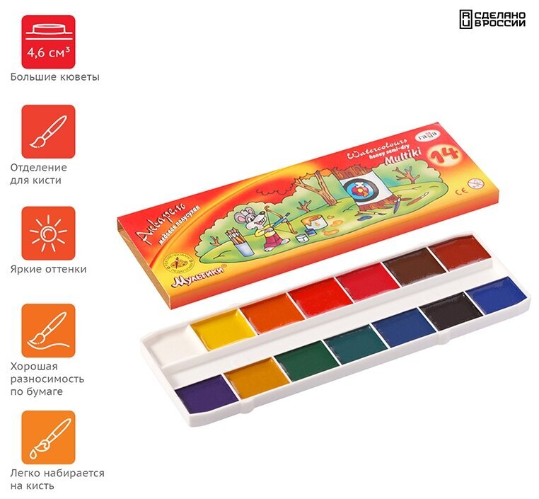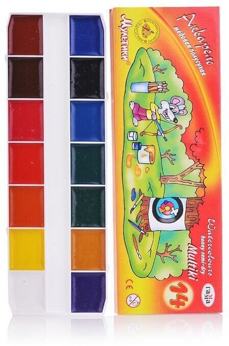 Акварель полусухая с добавлением натуральной патоки и пчелиного меда. Краски легко размываются, создавая прозрачный цветной слой.Состав набора: белая, фиолетовая, светло-желтая, охра желтая, светло-оранжевая, ярко-зеленая, алая, изумрудная светлая, рубиновая, голубая, коричневая, сажа газовая, красно-коричневая, ярко-синяя.