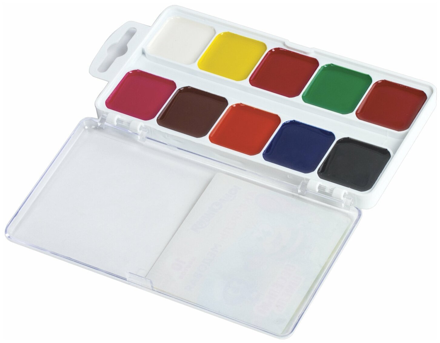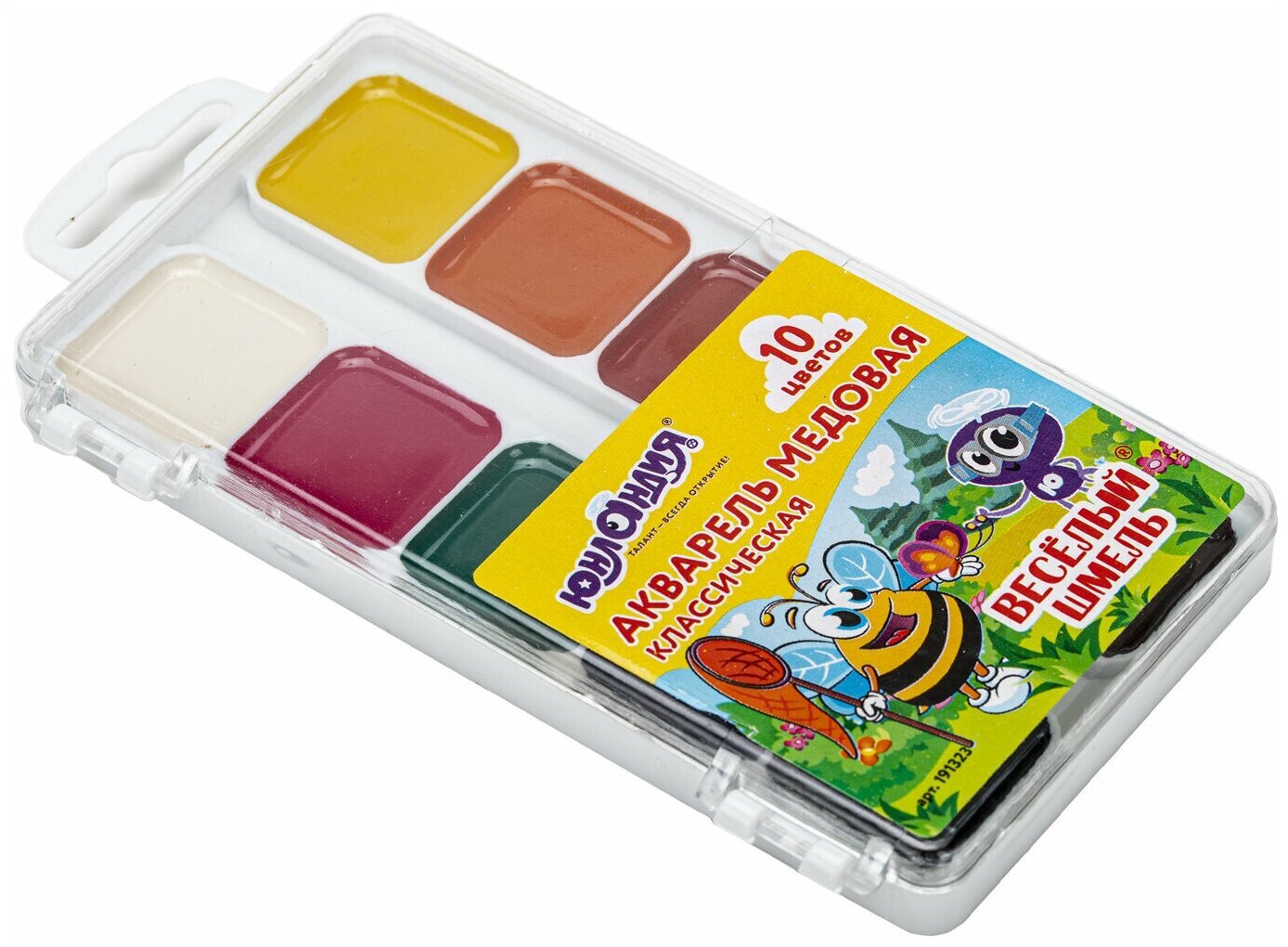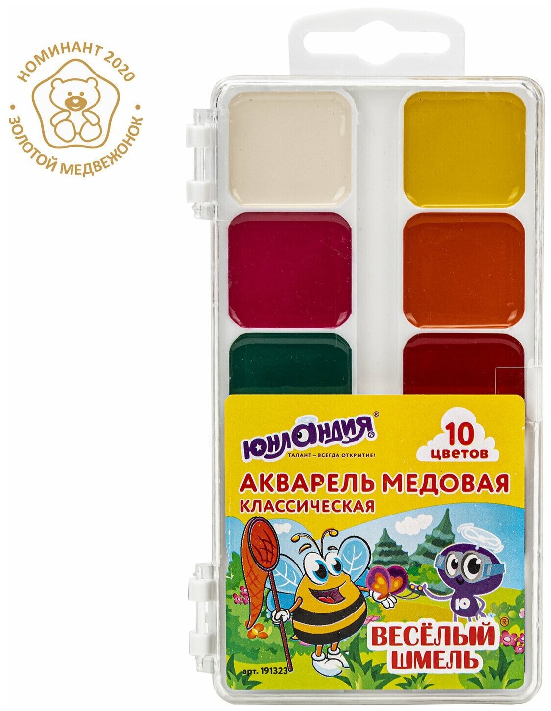 Акварельные краски ЮНЛАНДИЯ идеально подходят для уроков детского творчества и художественного изобразительного искусства. Рисование способствует развитию образного мышления, глазомера, мелкой моторики рук, тонкому восприятию цветовой гаммы.10 ярких насыщенных цветов отлично смешиваются между собой и позволяют создать множество оттенков, обеспечивают однородное окрашивание. Краски быстро высыхают и не портятся со временем. Безопасны для детей, нетоксичны. Выпускаются в пластиковом пенале с прозрачной крышкой, квадратной формой кювет и отделением для кисточки. Упаковка обладает компактными размерами и легким весом.