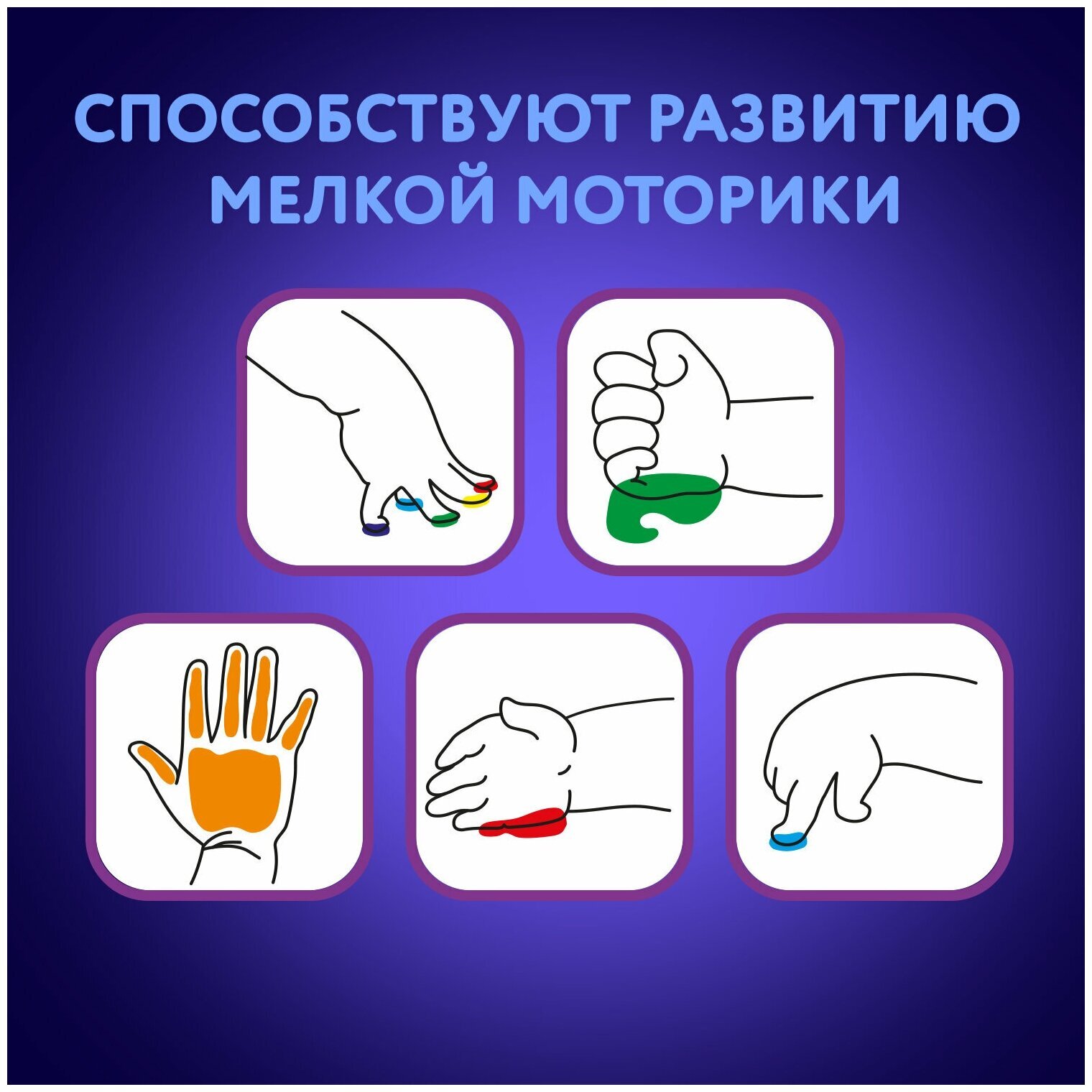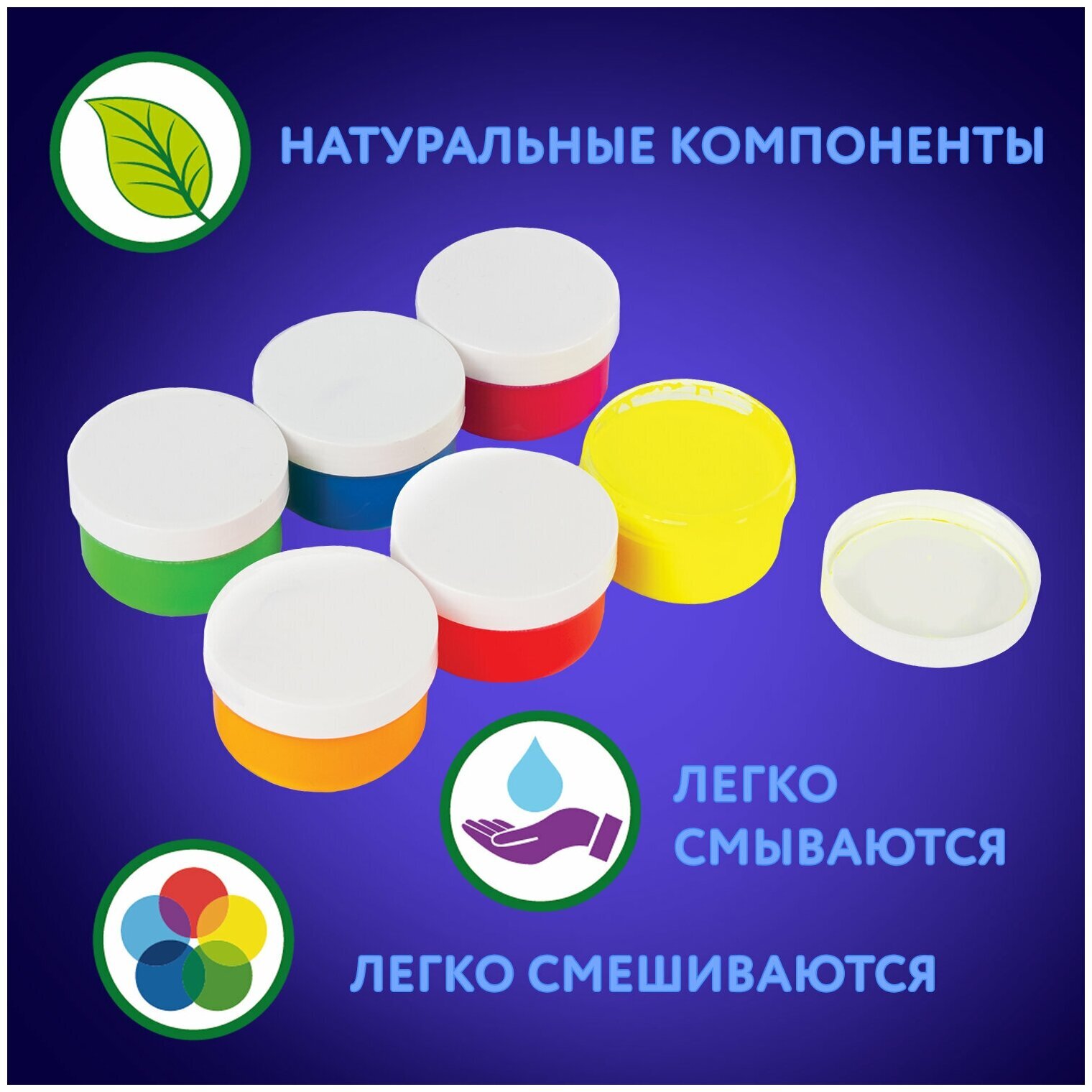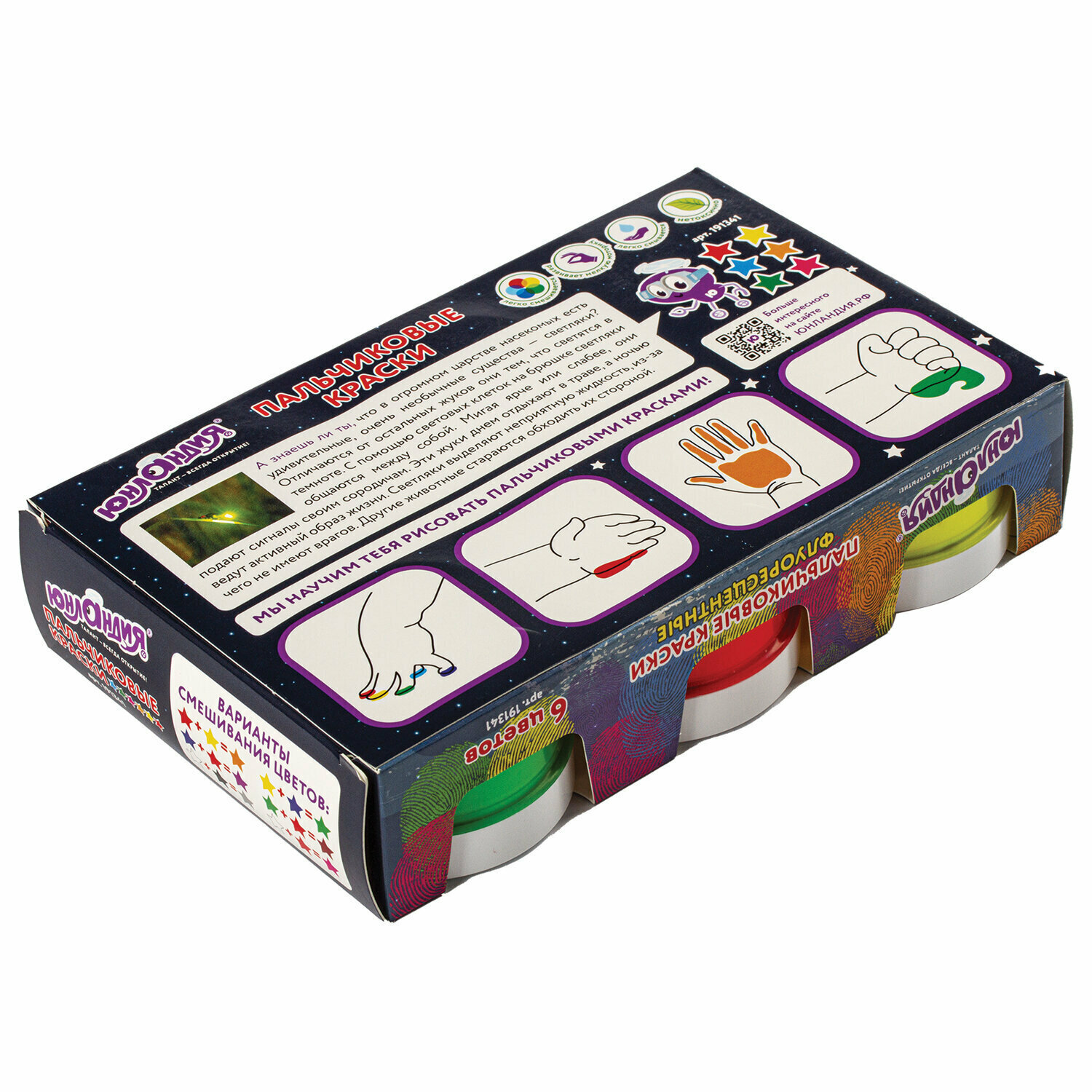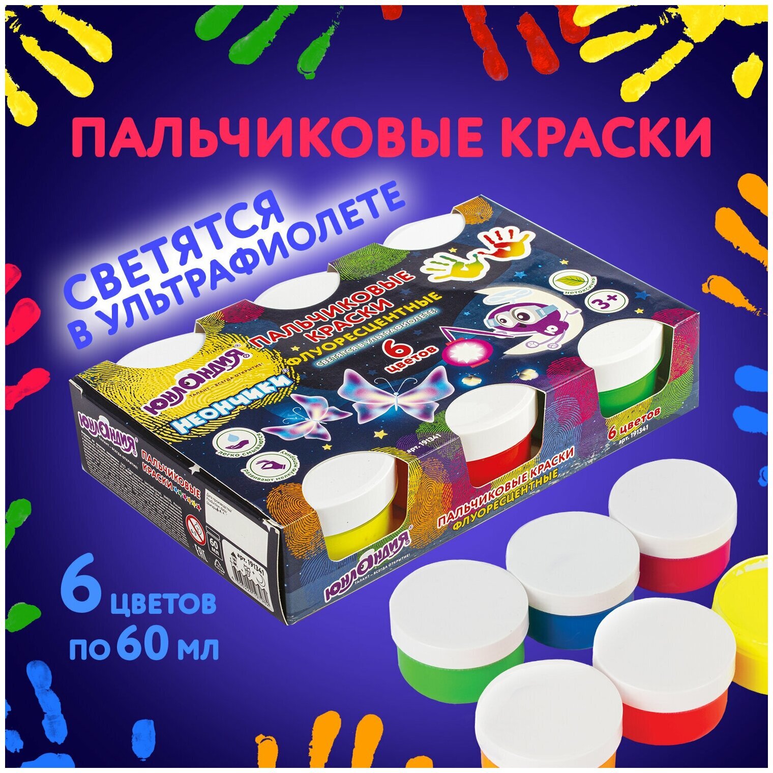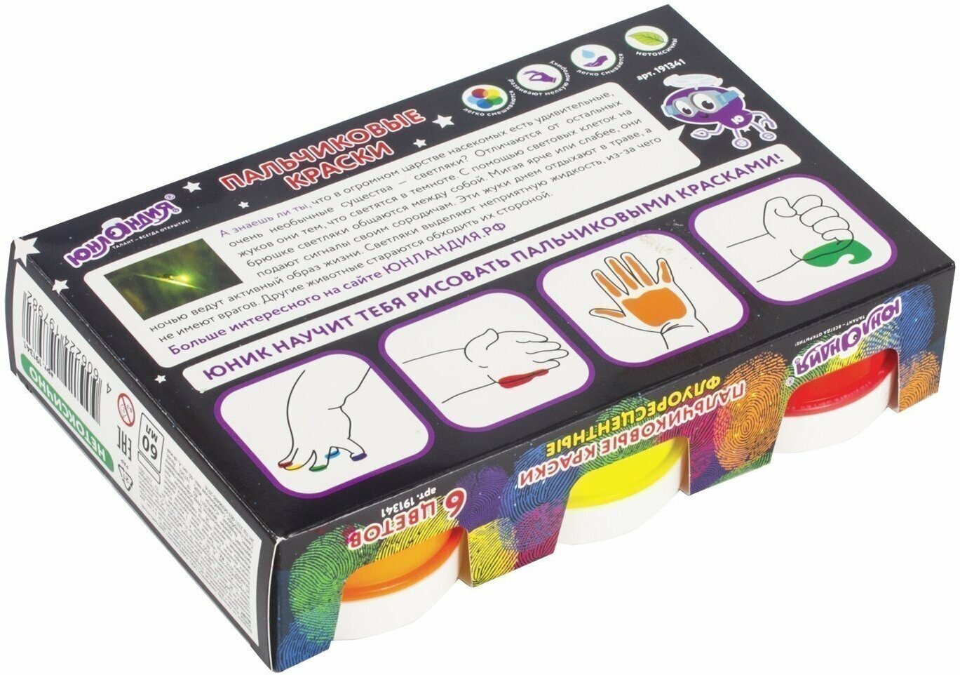 Выполнены на основе натуральных компонентов, не токсичны. Гелевая текстура не позволяет растекаться при использовании и в случае падения баночки. Краски светятся в ультрафиолете, легко смываются. Природные красители в составе могут окрашивать поверхности.Пальчиковые краски ЮНЛАНДИЯ - это удивительный материал для детского творчества, разработанный для самых юных художников. Они не только хорошо развивают мелкую моторику, но и способствует развитию речи ребенка. Помогают в формировании тактильной чувствительности и пространственного мышления, способствуют правильному цветовосприятию.