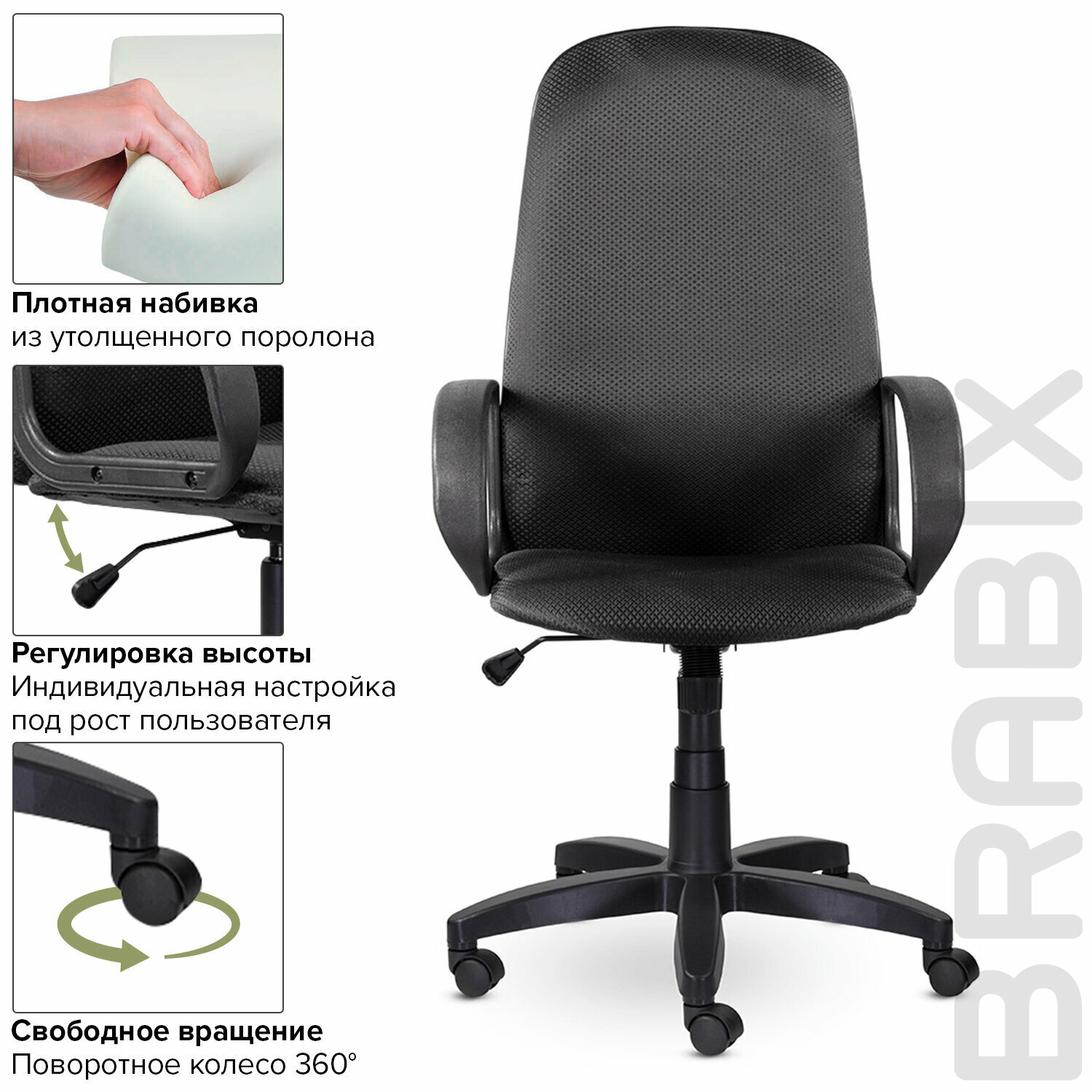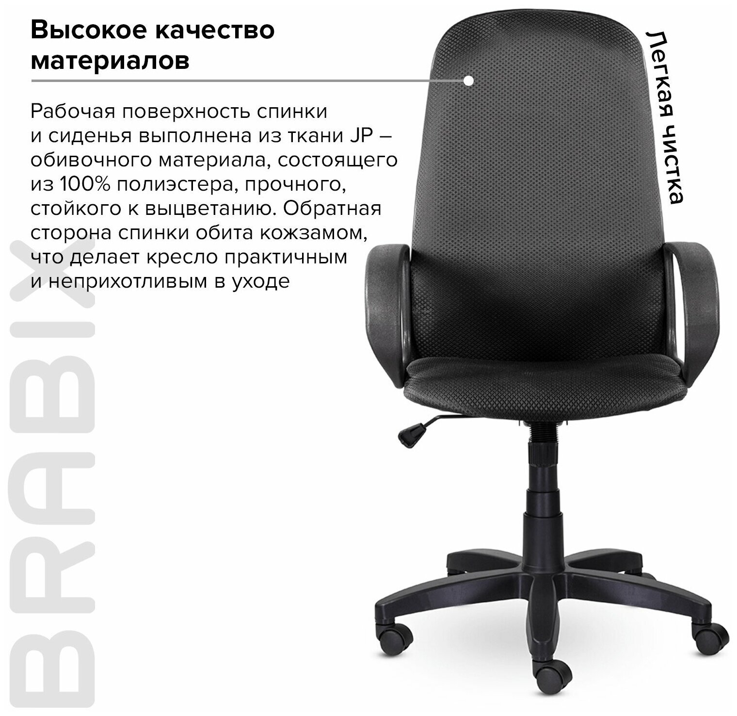 Бестселлер среди кресел средней ценовой категории. Оптимальное решение для персонала или руководителя среднего звена теперь под маркой Brabix.Рабочая поверхность спинки и сиденья выполнена из ткани JP - обивочного материала, состоящего из 100% полиэстера, прочного, стойкого к выцветанию. Обратная сторона спинки обита кожзамом, что делает кресло практичным и неприхотливым в уходе.