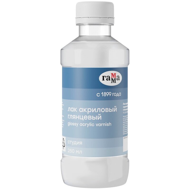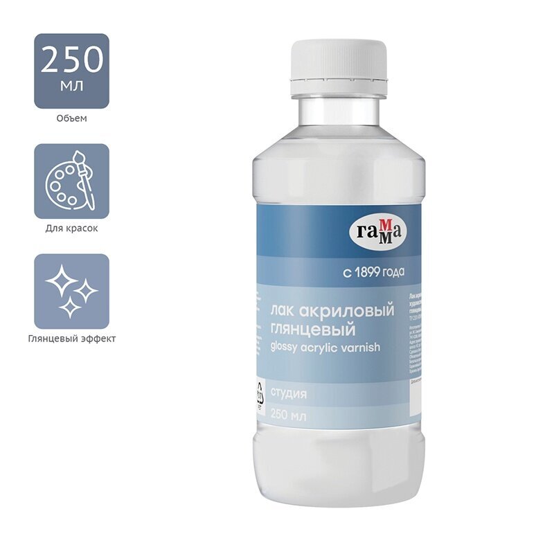 Лак ГАММА на основе водной акриловой дисперсии для завершающего покрытия работ, выполненных акриловыми красками. Также используется в декоративных техниках: декупаж, кракелюр, роспись по различным поверхностям.Создавая на поверхности прочную пленку, акриловый лак защищает работу от воздействий внешней среды. Придает поверхности изделия законченный вид с глянцевым эффектом.