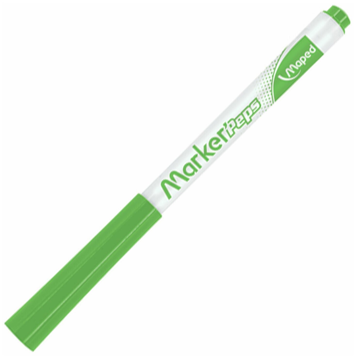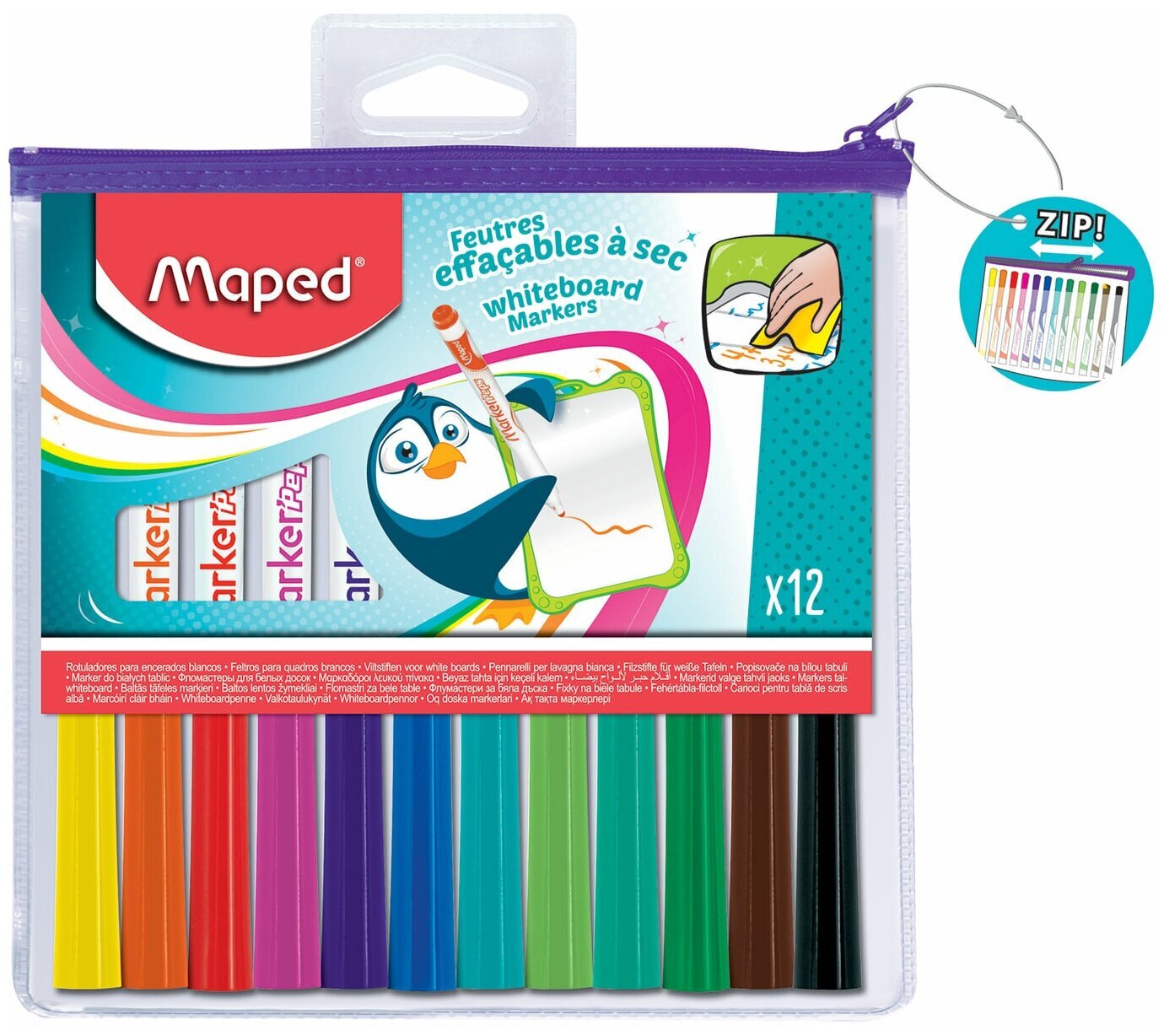 Маркеры "Marker Pep's" для белой доски в наборе из 12 штук предназначены для письма на досках с магнитно-маркерной поверхностью.Маркеры для доски MAPED поставляются в тонком круглом белом корпусе с колпачком в цвет чернил. Круглый наконечник обеспечивает линию письма толщиной 1,5 мм. Основа чернил - водная. Чернила быстро высыхают и не оставляют разводов.