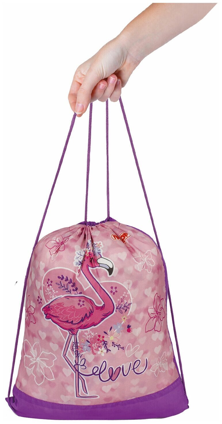 Мешок для обуви ПИФАГОР "Cute Flamingo" - необходимый аксессуар в школе. Подходит как для обуви, так и для физкультурной формы и сменной одежды для факультативных занятий. Затягивается двумя шнурками. Можно носить на плечах за спиной.Выполнен из плотного полиэстера с водоотталкивающей пропиткой. Яркая и четкая печать дизайна.