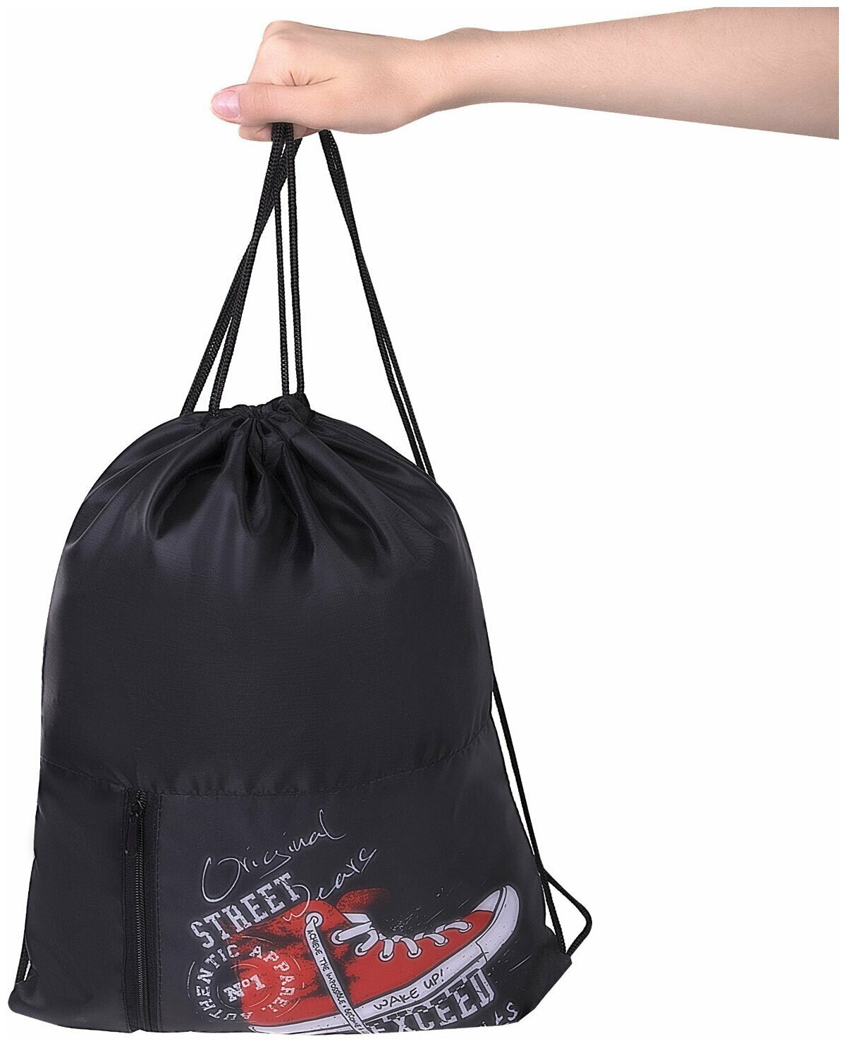 Мешок для обуви упакован в плотный ПЭТ пакет, который сохранит качество и товарный вид при хранении и транспортировке.