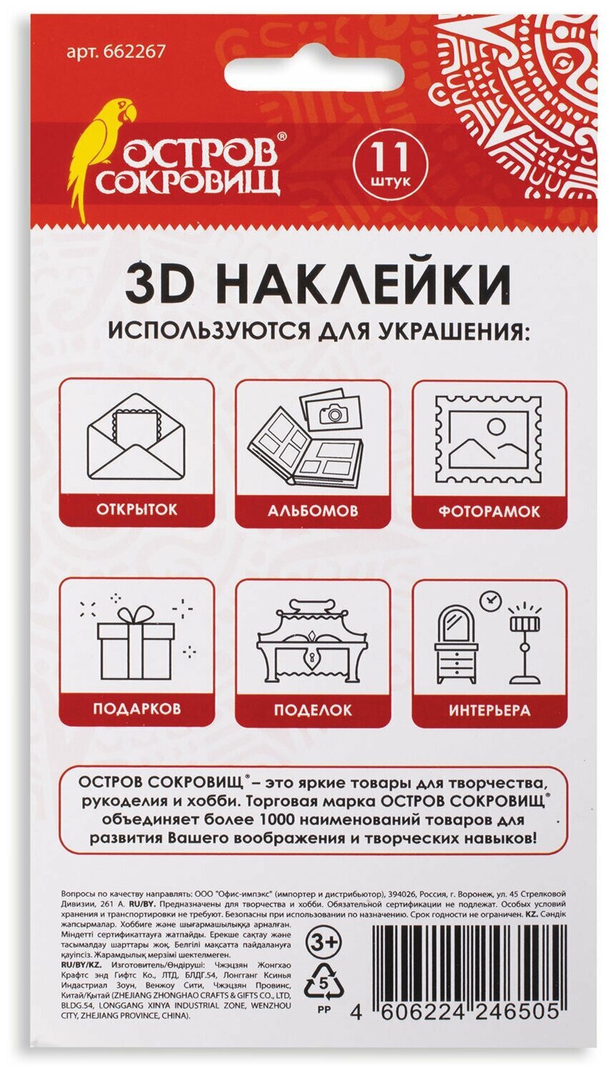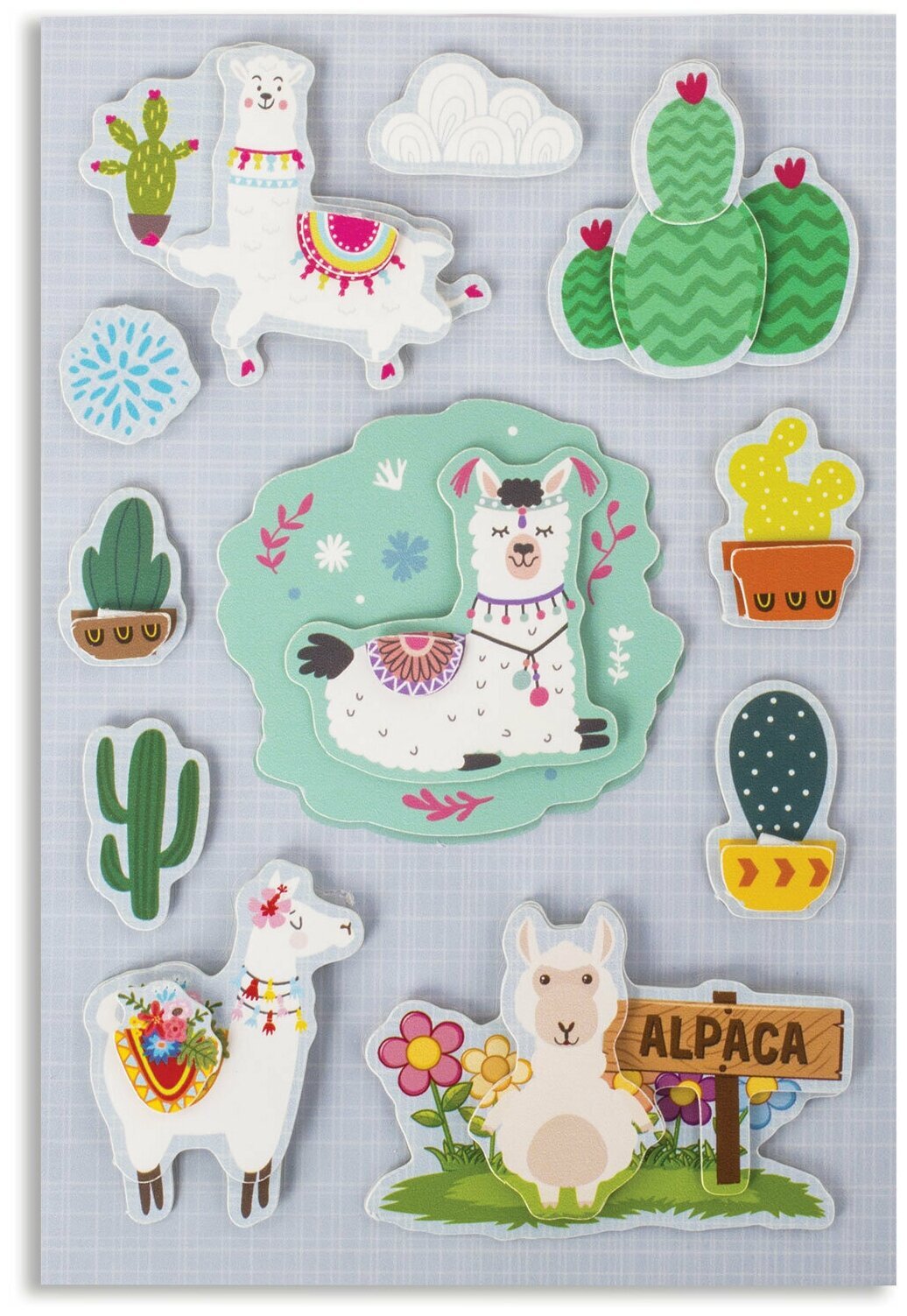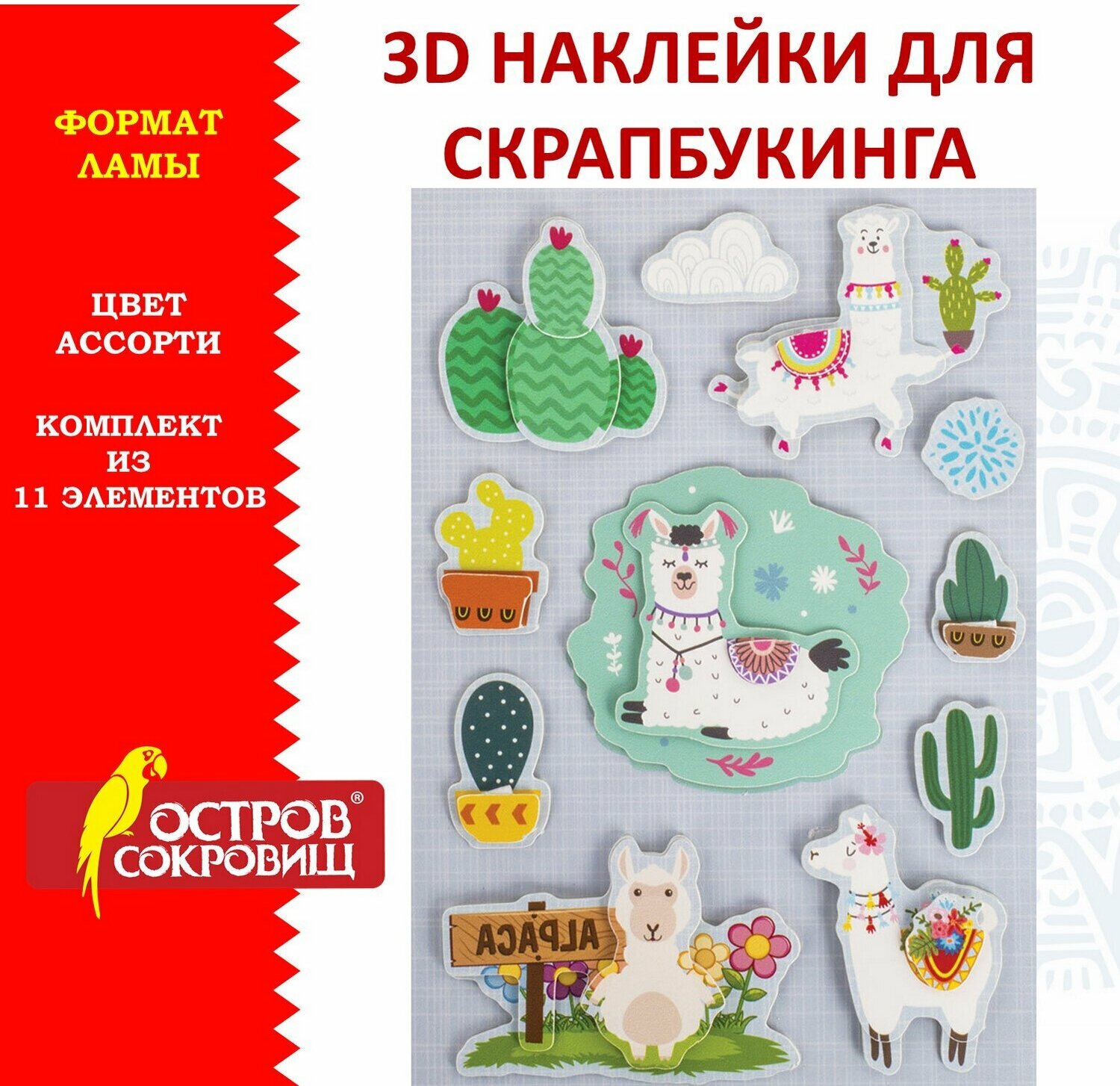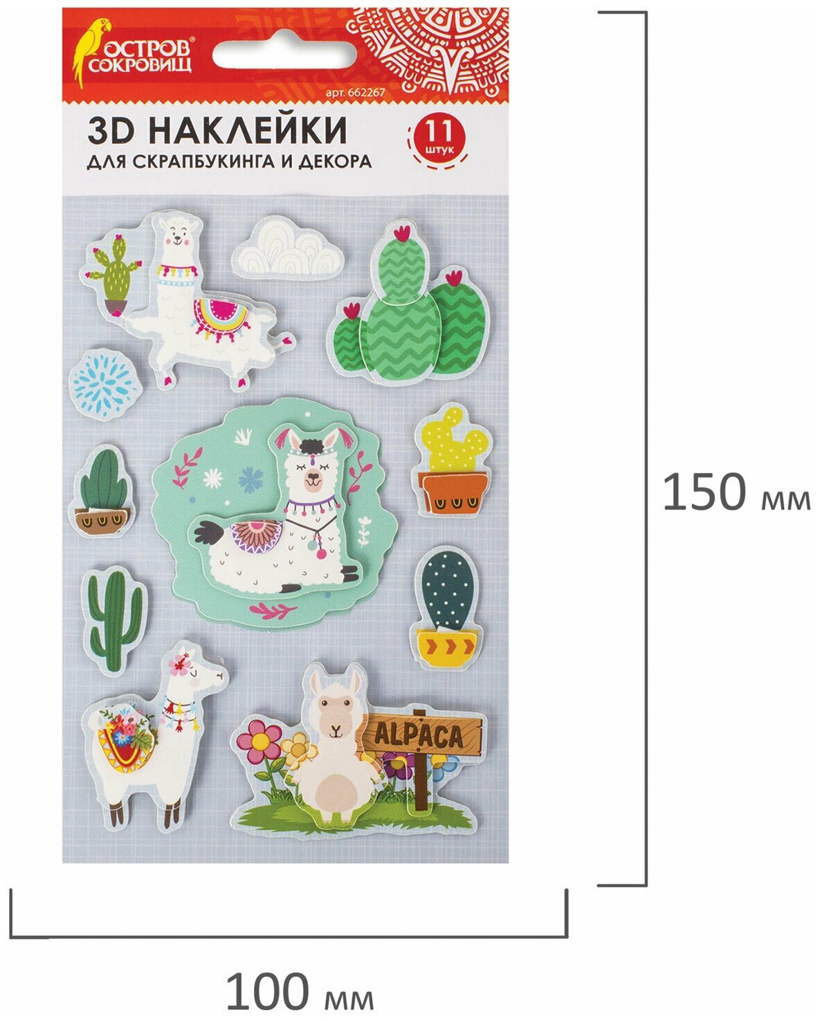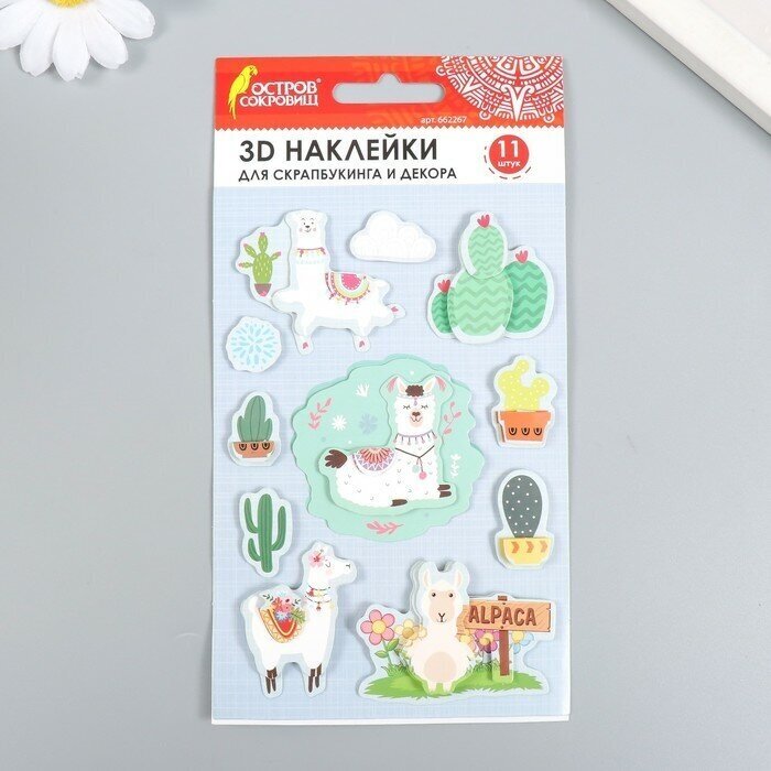 Бумажные объёмные наклейки ОСТРОВ СОКРОВИЩ предназначены для украшения альбомов, открыток, фоторамок, подарочной упаковки и предметов интерьера. Благодаря качественному клеевому слою наклейки надёжно фиксируются на различных видах поверхности.3D наклейки для скрапбукинга и декора ЛАМЫ - это универсальный декоративный материал, используемый в скрапбукинге и других видах творчества. В наборе содержится 11 ярких стикеров, состоящих из нескольких слоёв плотной бумаги. Благодаря многослойности наклейки имитируют объёмную картинку и помогут оригинально украсить любую поделку.