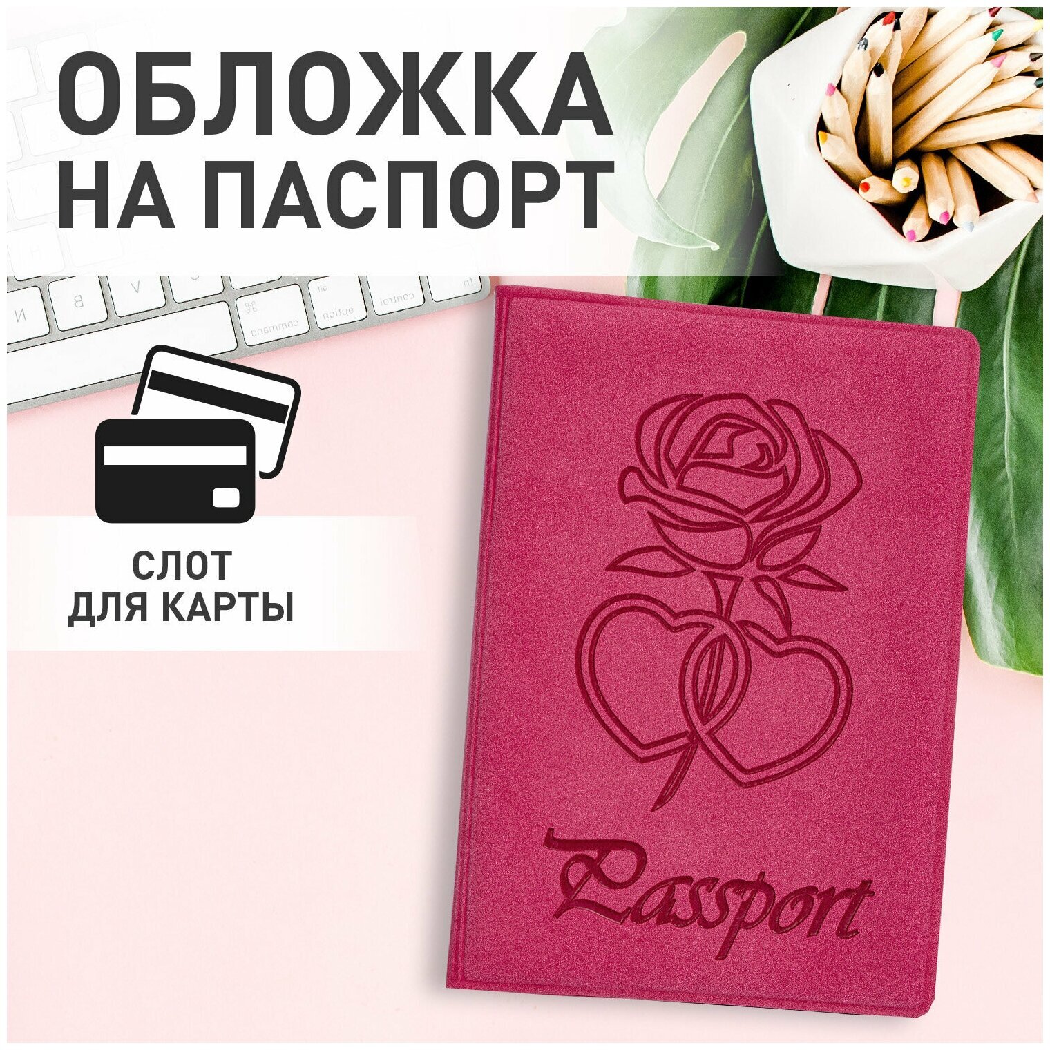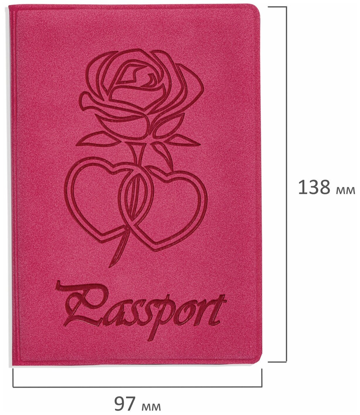 Обложка для паспорта STAFF надежно защитит документ от изнашивания и загрязнения, а также придаст изделию изысканный и неповторимый вид.Модель выполнена из бархатного полиуретана яркого розового цвета и украшена тисненой розой, лепестки которой напоминают сердца, а также надписью "Паспорт". На внутреннем развороте расположены два кармана из прозрачного пластика, а благодаря компактным размерам 97х138 мм удобно всегда носить с собой.
