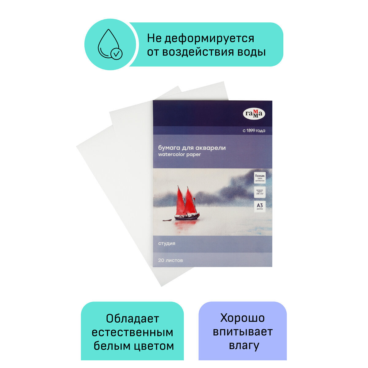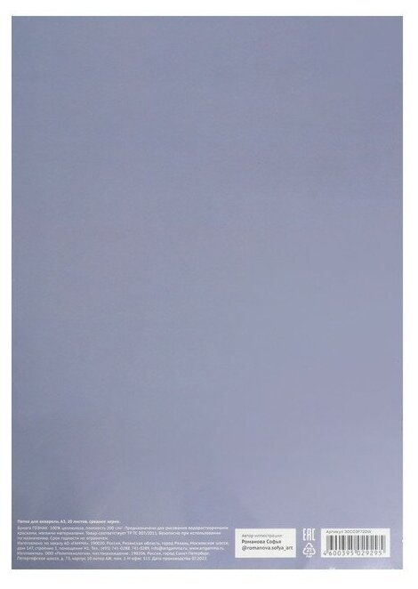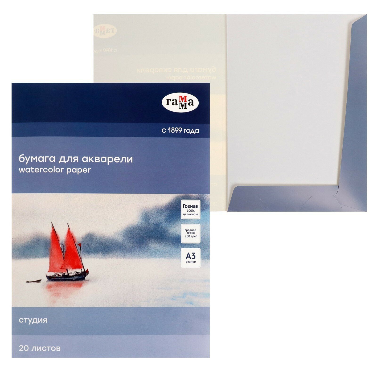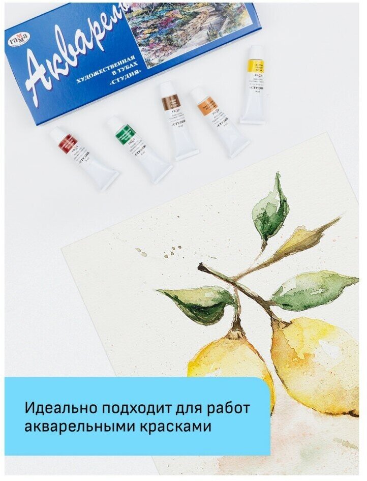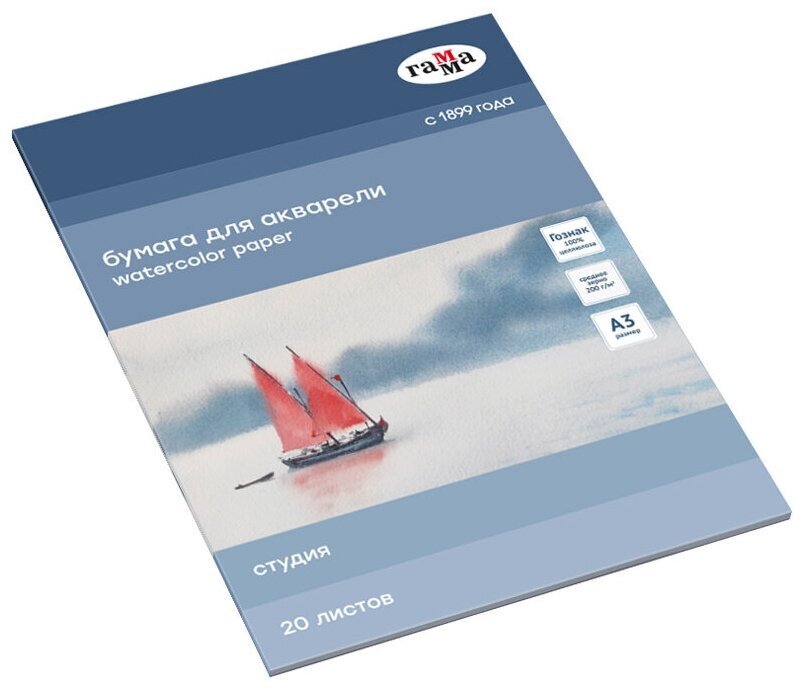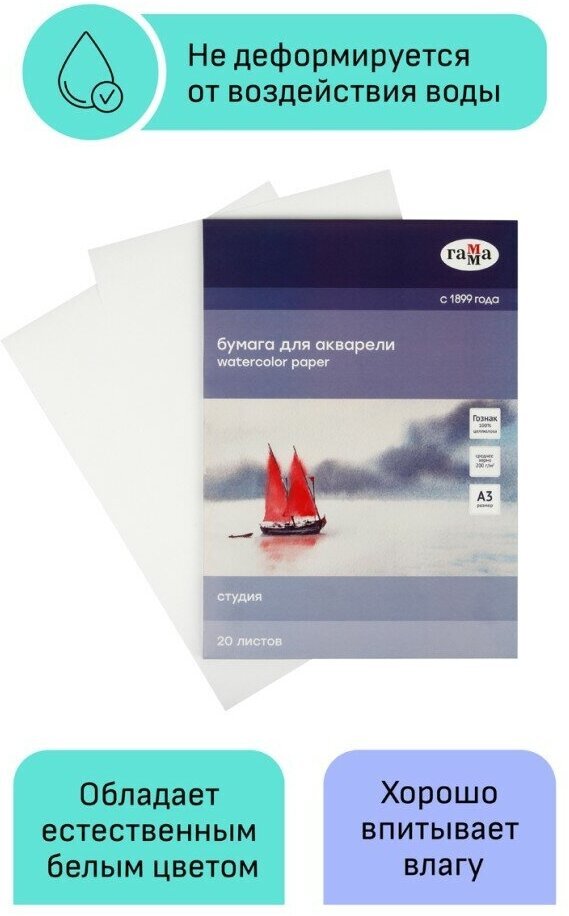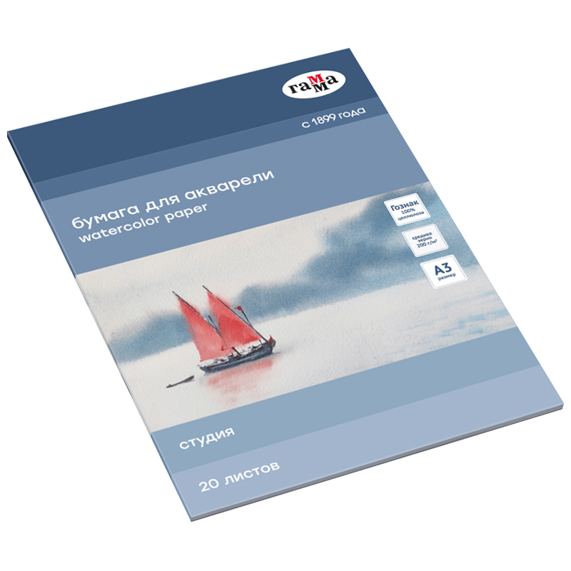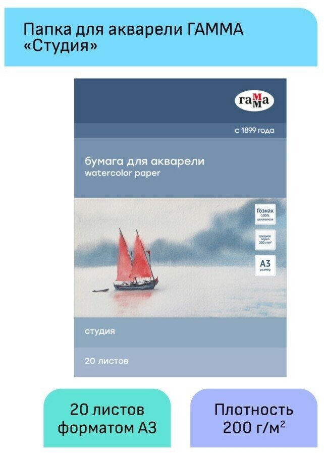 В папках Гамма Студия используется рисовальная бумага марки-А Гознак (Спб). Бумага отлично подходит для акварели, гуаши, работы в смешанных техниках, многослойных работ карандашами. Выполнена из 100% целлюлозы, плотностью 200г/м2. Естественная белизна. Бумага хорошо впитывает влагу, не коробится от воздействия воды.