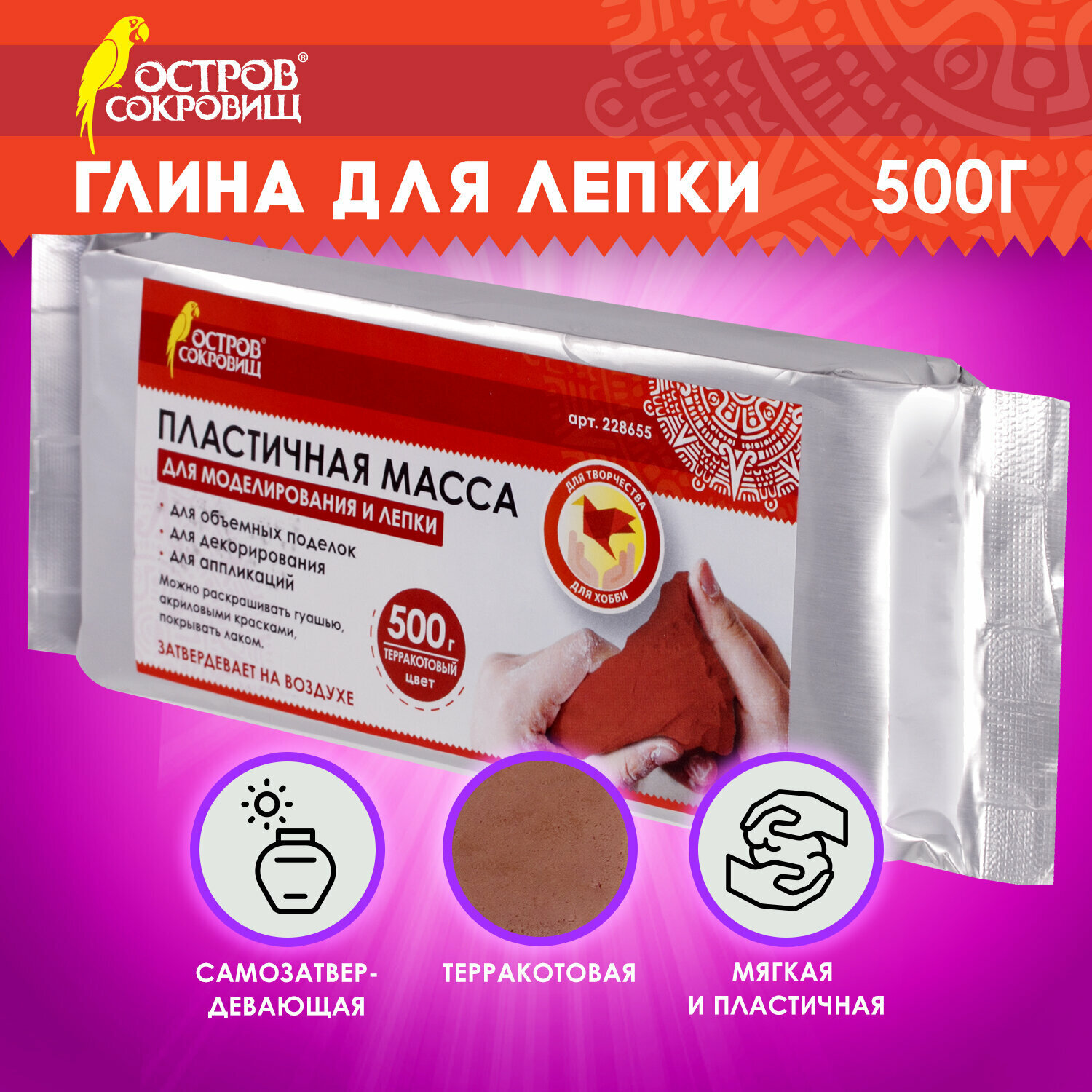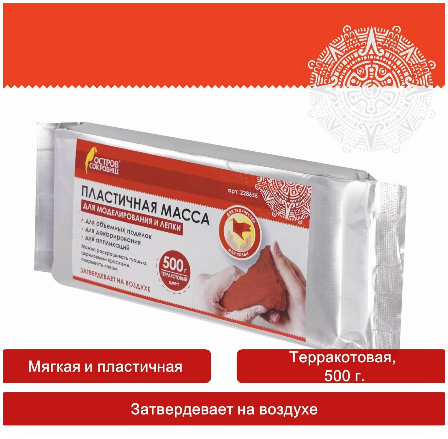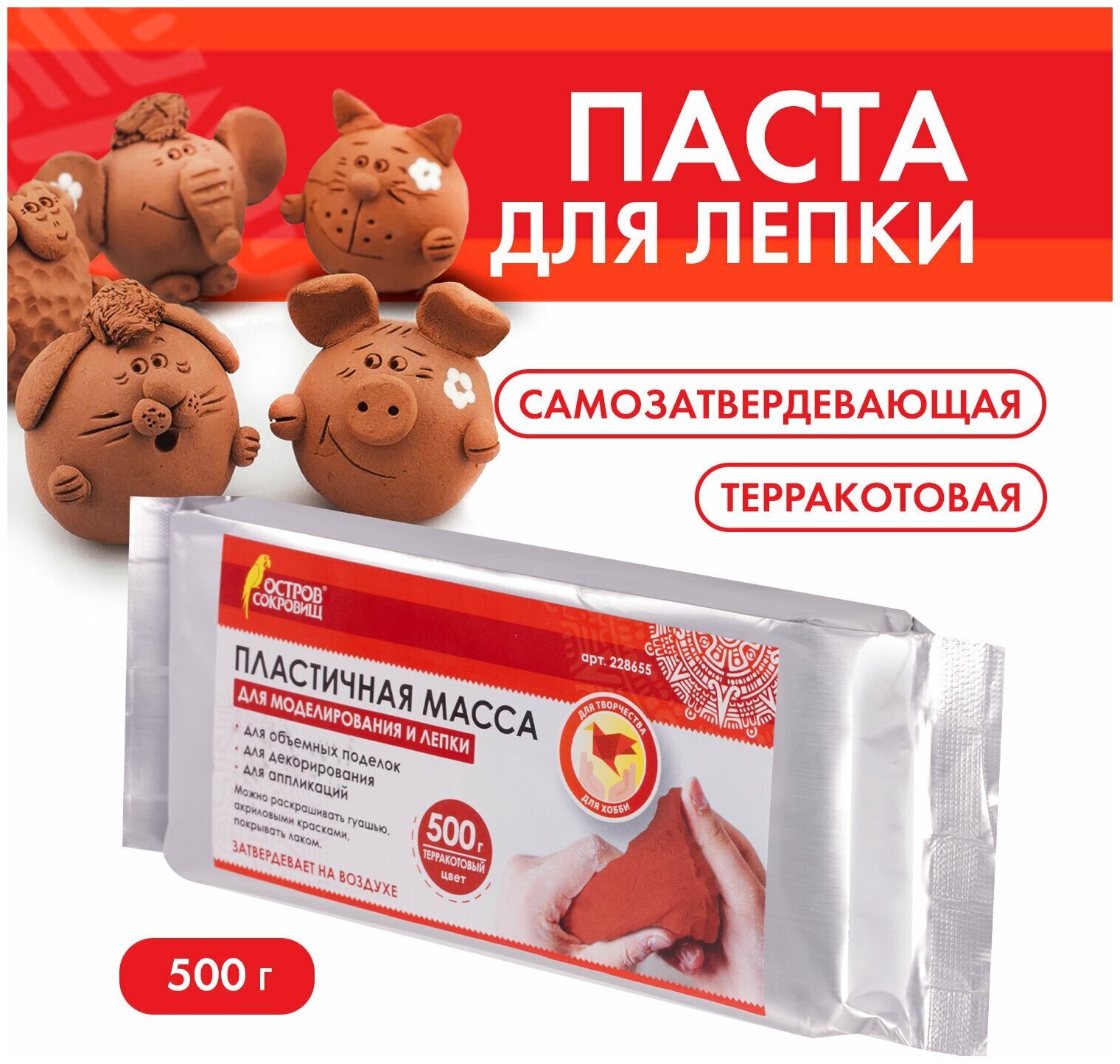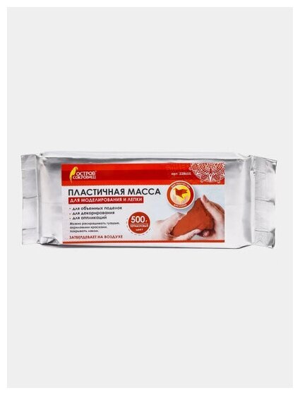Масса для лепки ОСТРОВ СОКРОВИЩ терракотового цвета фасовкой 500 г упакована в герметичную фольгированную упаковку, что позволяет хранить товар в течение длительного времени. Масса очень податлива: моделируется руками, пластична, легко лепится, раскатывается, режется, принимает любую форму. При необходимости можно использовать инструменты. Чтобы избежать появление трещин на изделии после застывания, необходимо работать с массой влажными руками. Затвердевает на воздухе, после высыхания становится очень прочной, не усаживается.