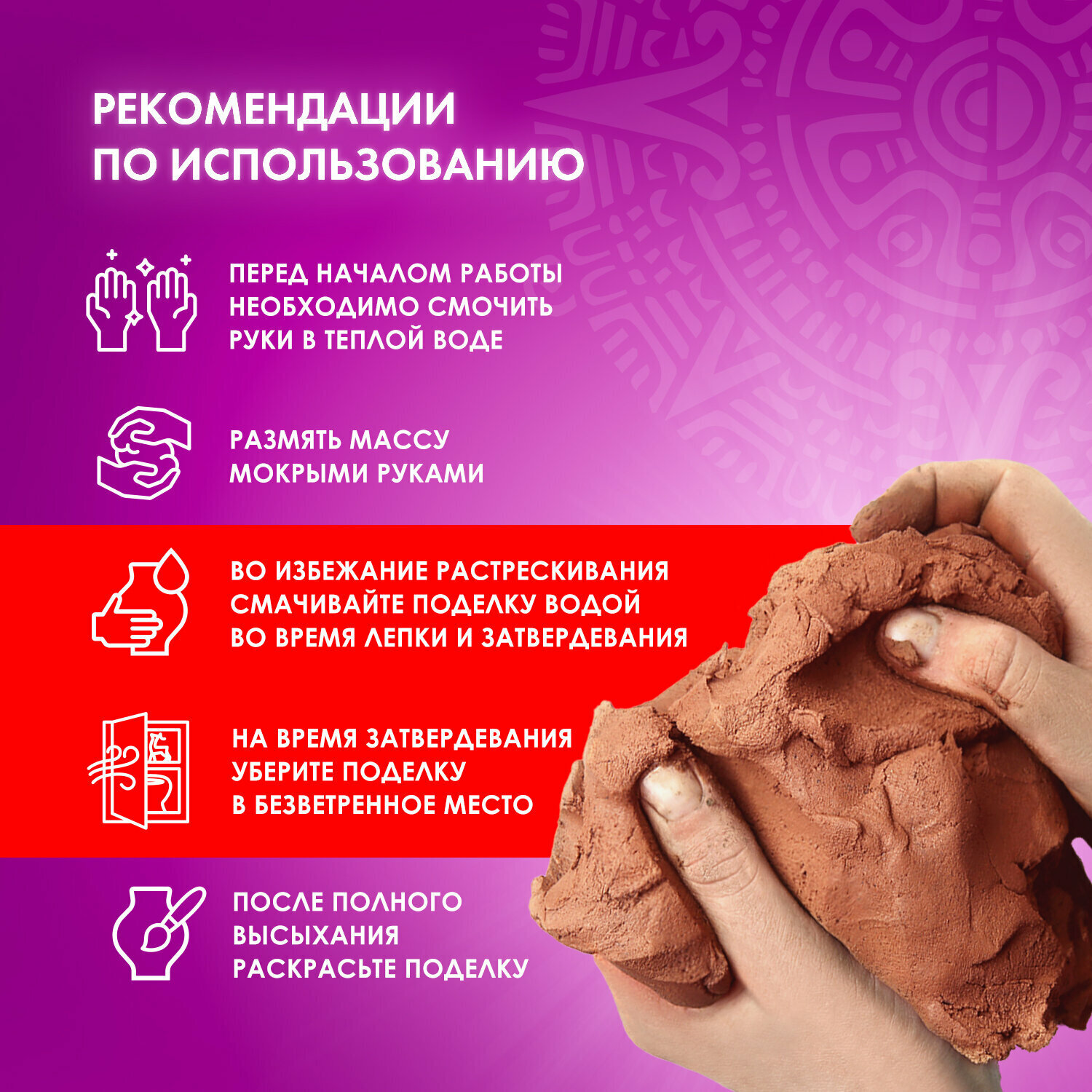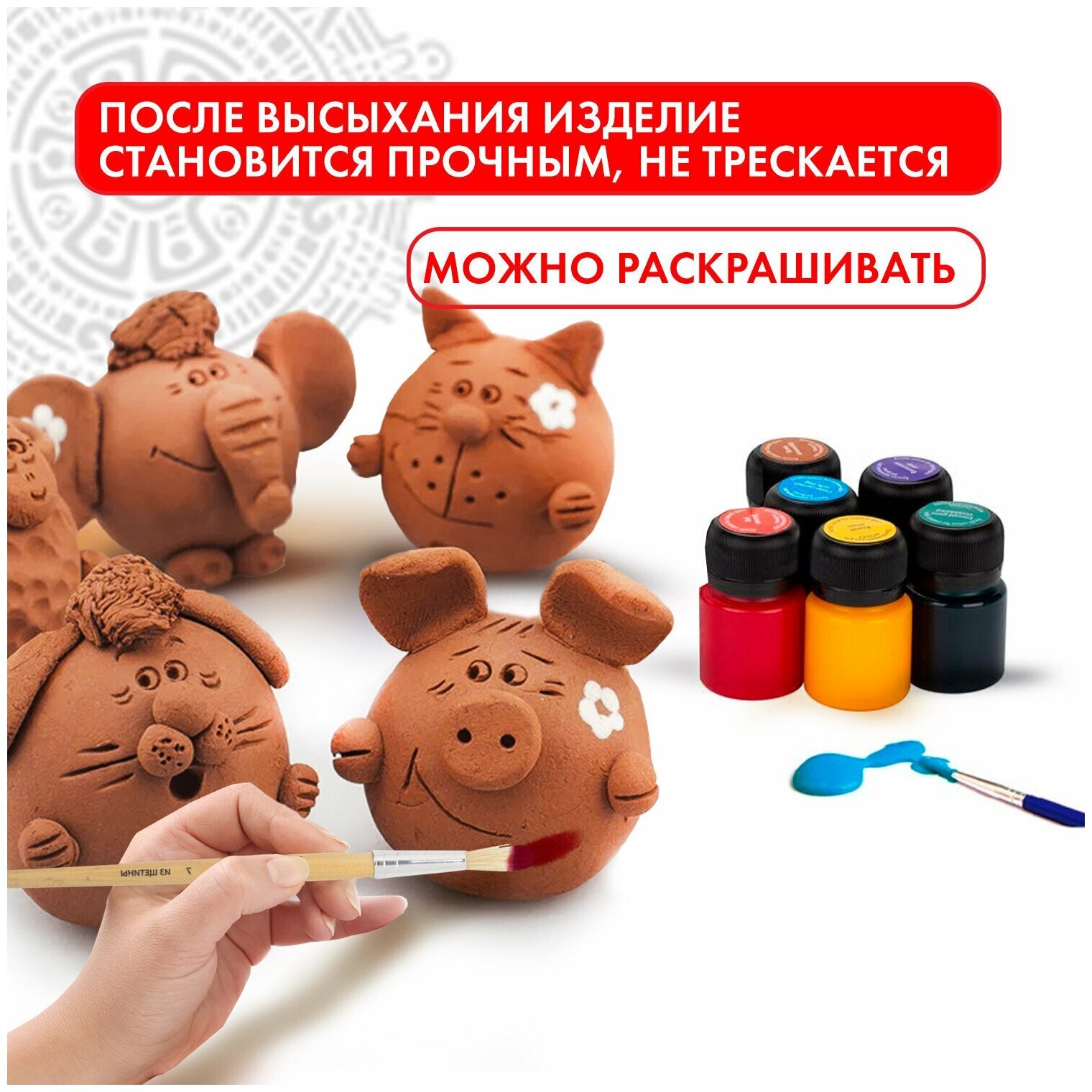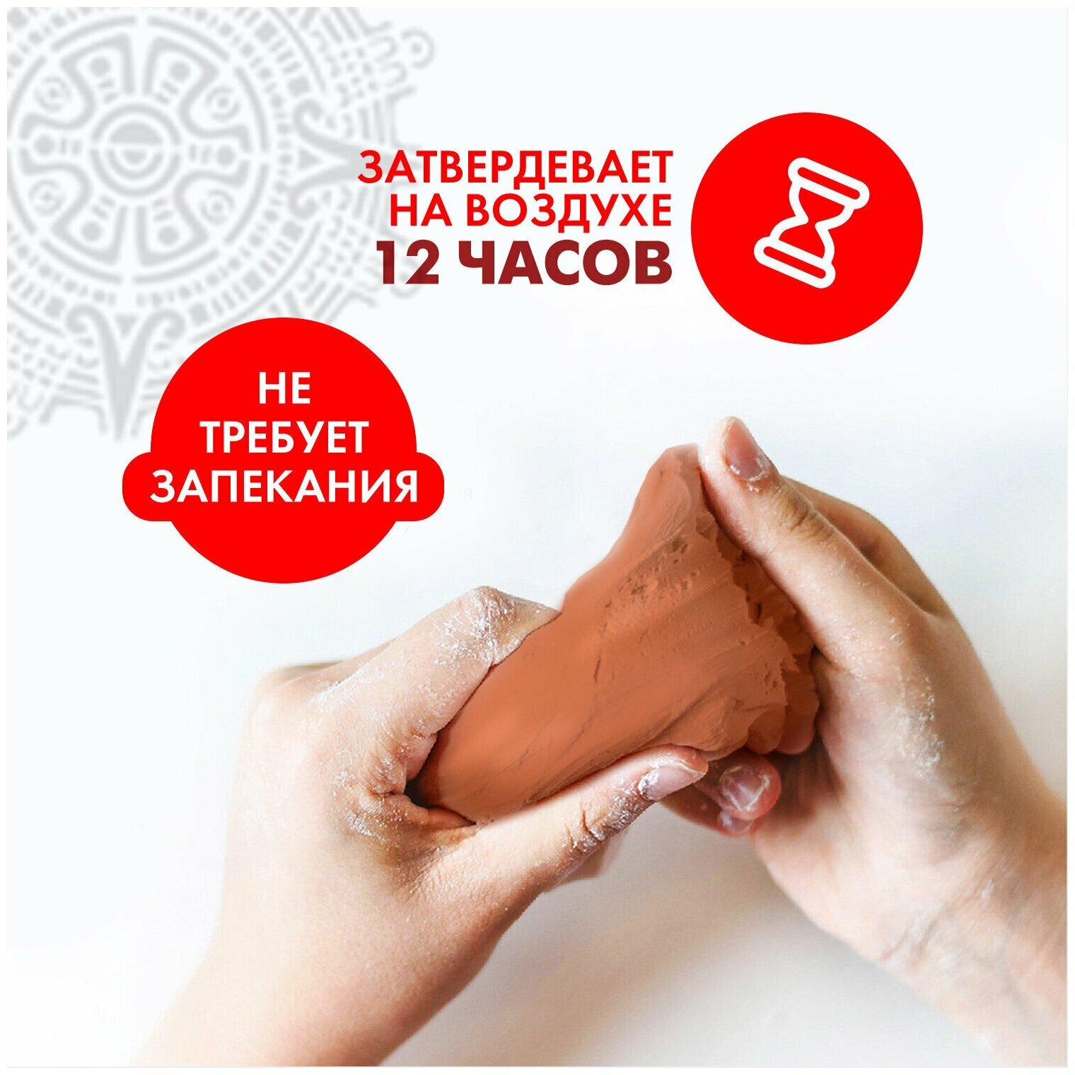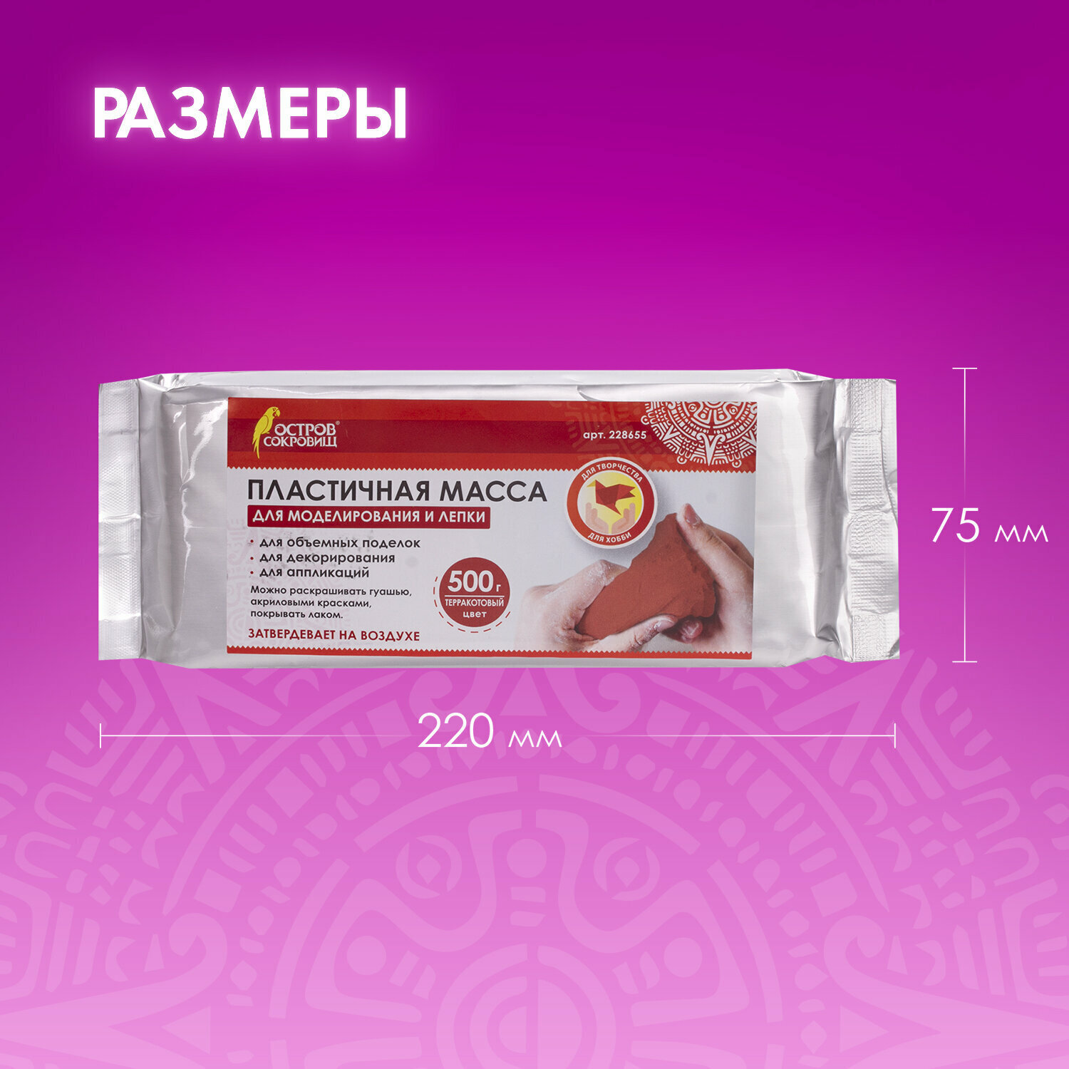 Масса для лепки ОСТРОВ СОКРОВИЩ терракотового цвета фасовкой 500 г упакована в герметичную фольгированную упаковку, что позволяет хранить товар в течение длительного времени. Масса очень податлива: моделируется руками, пластична, легко лепится, раскатывается, режется, принимает любую форму. При необходимости можно использовать инструменты. Чтобы избежать появление трещин на изделии после застывания, необходимо работать с массой влажными руками. Затвердевает на воздухе, после высыхания становится очень прочной, не усаживается.