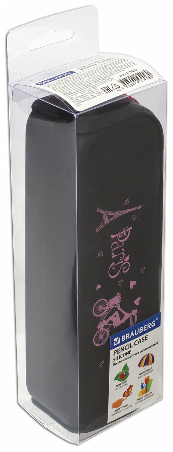 Пенал-косметичка BRAUBERG "Paris" выполнен из нетоксичного гипоаллергенного силикона с эффектом Soft Touch. Контрастная молния оснащена силиконовым бегунком с логотипом. Вмещает до 50 канцелярских предметов стандартного размера.Пенал прямоугольной формы с одним вместительным отделением застегивается на молнию с удобным силиконовым бегунком. Размер - 20х5х6 см. Поставляется в прозрачной пластиковой коробке с европодвесом.