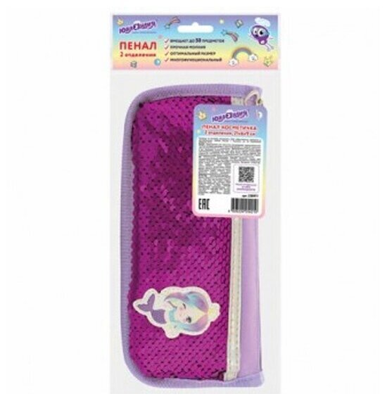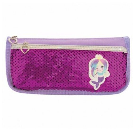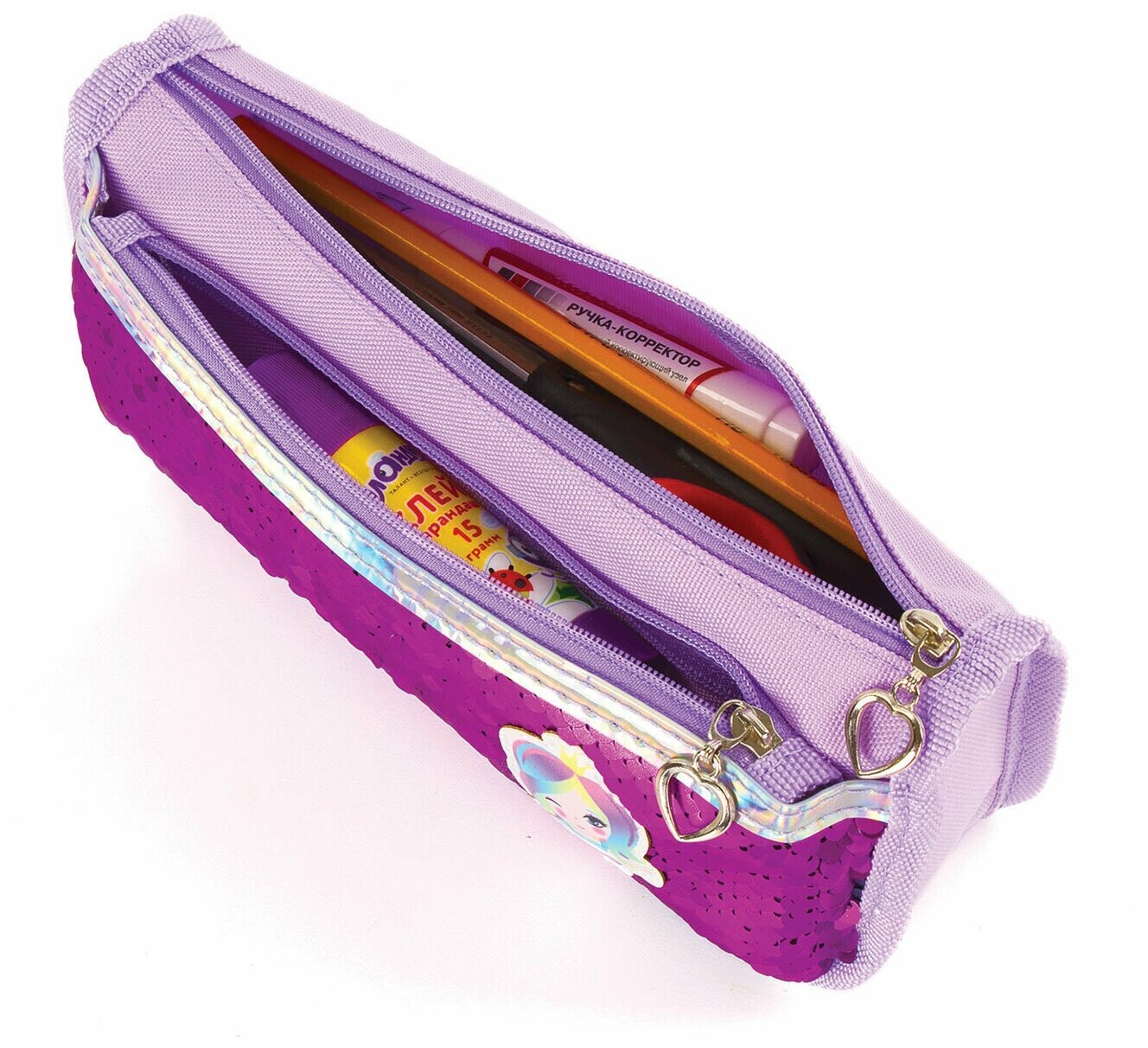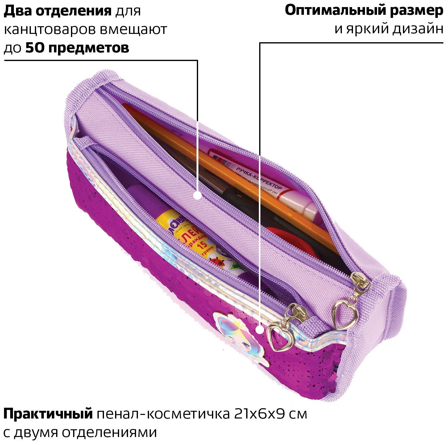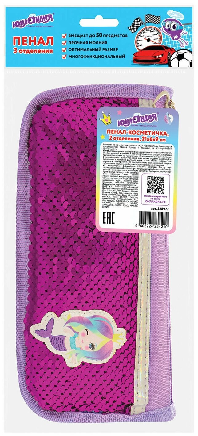 Пенал-косметичка ЮНЛАНДИЯ, 2 отделения, мягкий, пайетки, "Русалка", фиолетовый, 21х6х9 см, 228977