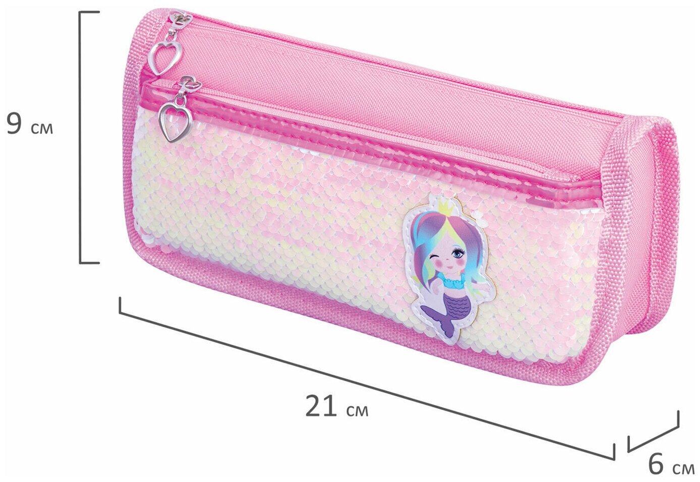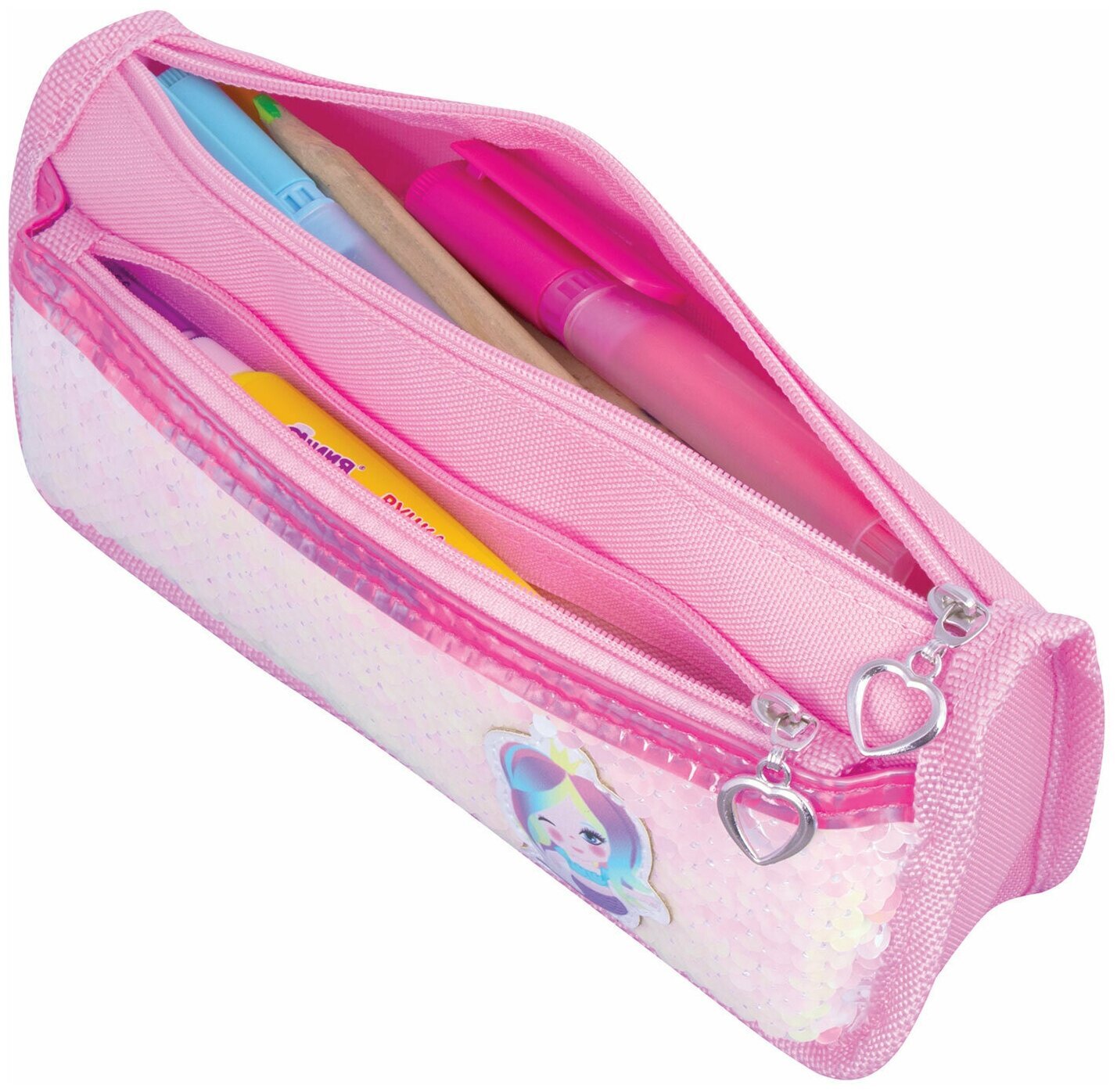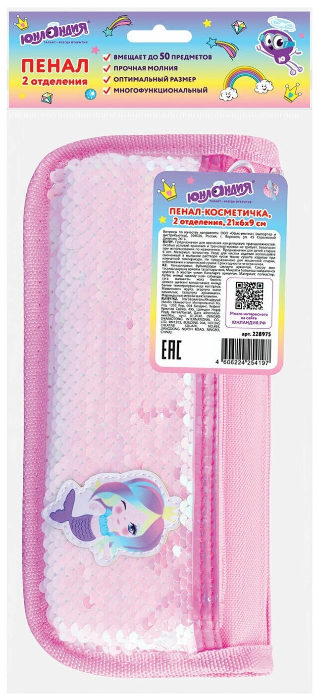 Пенал-косметичка ЮНЛАНДИЯ предназначен для хранения школьных принадлежностей, вмещает до 50 канцелярских предметов стандартного размера. Удобный и вместительный пенал не займет много места в школьном ранце или рюкзаке.Выполнен из прочного полиэстера, декорирован реверсивными пайетками и патчем. Имеет два вместительных отделения. Застегивается на молнию с металлическим бегунком в виде сердечка. Поставляется в прозрачном полиэтиленовом пакете с картонным подвесом.