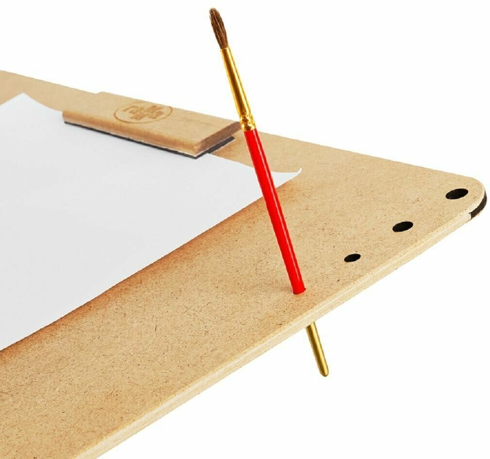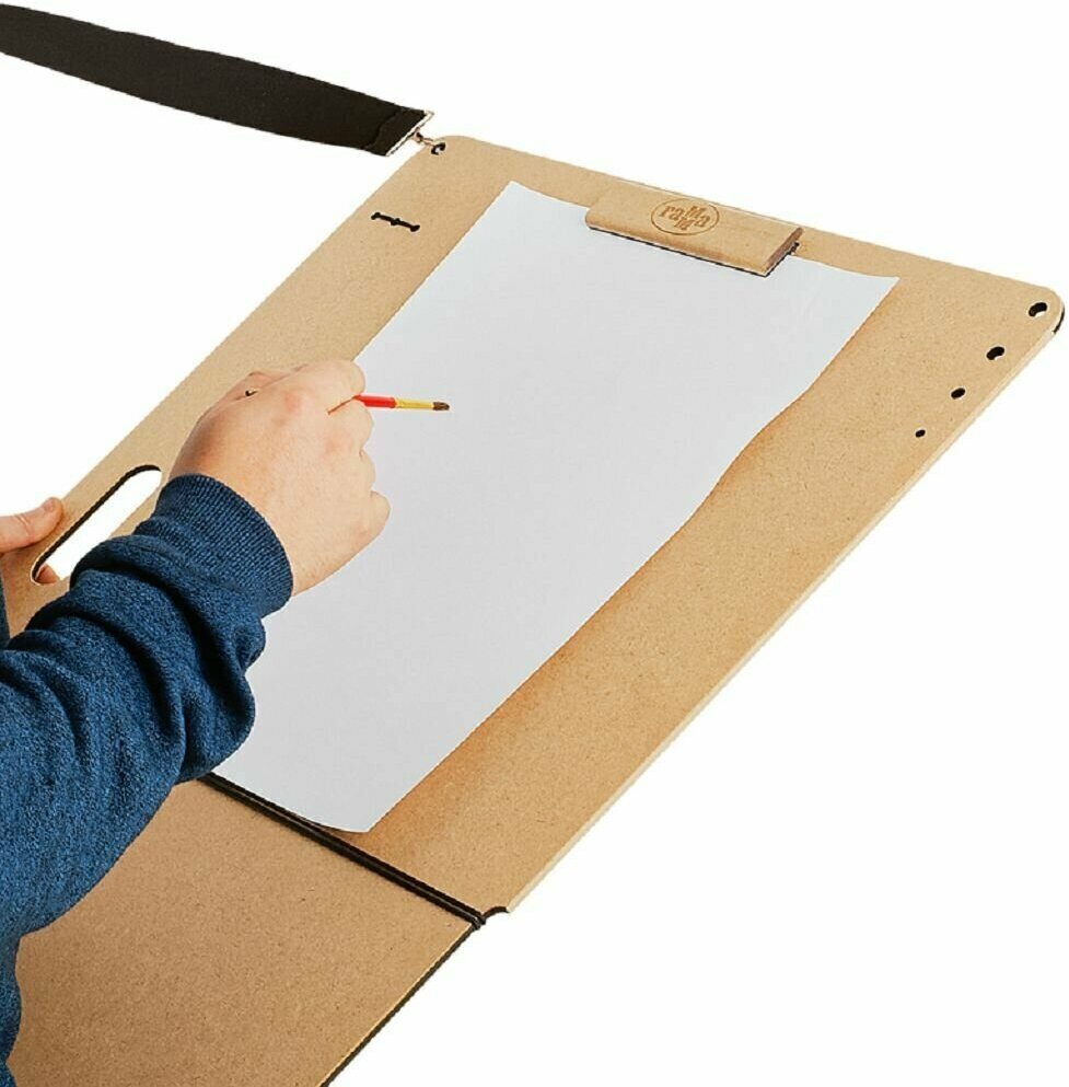 Планшет-клипборд для живописи на пленэрах и вне студии — лёгкий, тонкий, но прочный. Магнитный зажим и резинка надёжно фиксируют лист, не оставляя заломов. Гладкая поверхность не повреждает даже тонкую бумагу.Держатели для карандашей и отверстия для кистей позволяют организовать рабочее место — нужные инструменты под рукой. Планшет можно установить на мольберт-треногу или этюдник. Ремень и округлый вырез нижнего края планшета обеспечивают комфорт во время длительной работы. Вырубная ручка для удобной транспортировки.