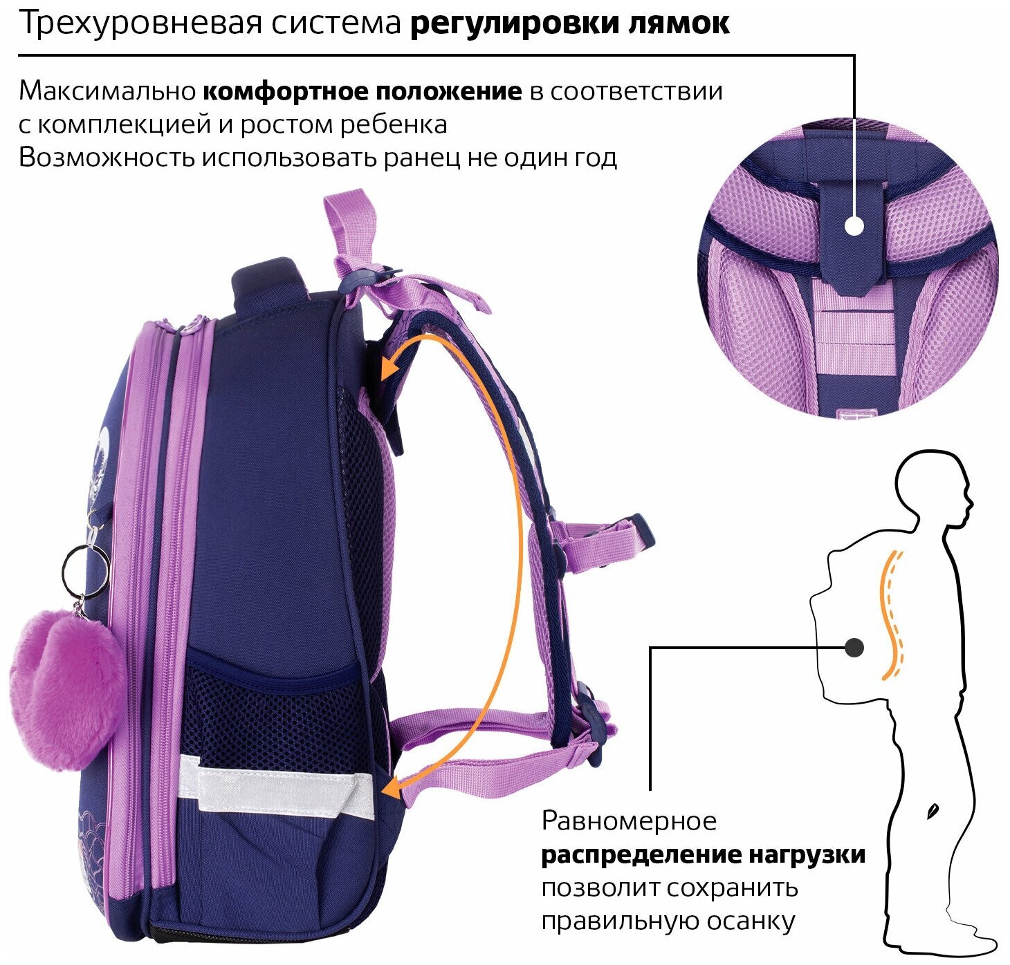 Регулируемые по длине и высоте лямки можно оптимально подогнать под комплекцию ребенка, чтобы ранец носился с комфортом, несмотря на зачастую избыточный вес содержимого: учебников, тетрадей, канцтоваров. Регулировка позволит использовать ранец