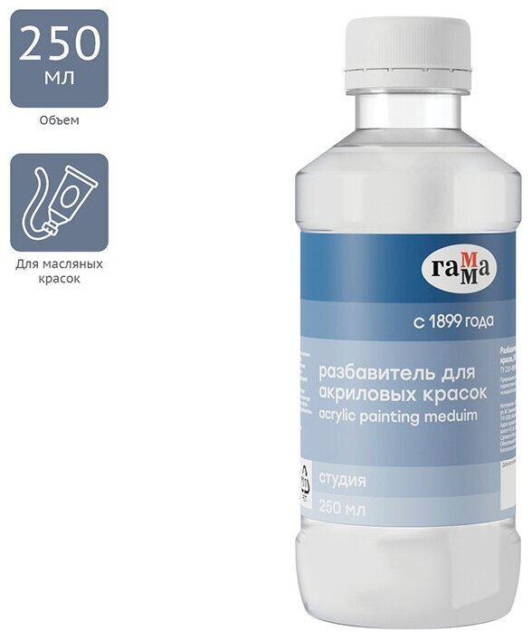 Разбавитель для акриловых красок ГАММА "Студия" предназначен для разведения масляных красок и межслойной лессировки.Разбавитель белого цвета объемом 250 мл поставляется в пластиковой банке. Его нужно добавлять к краске постепенно при постоянном перемешивании до достижения нужной консистенции.