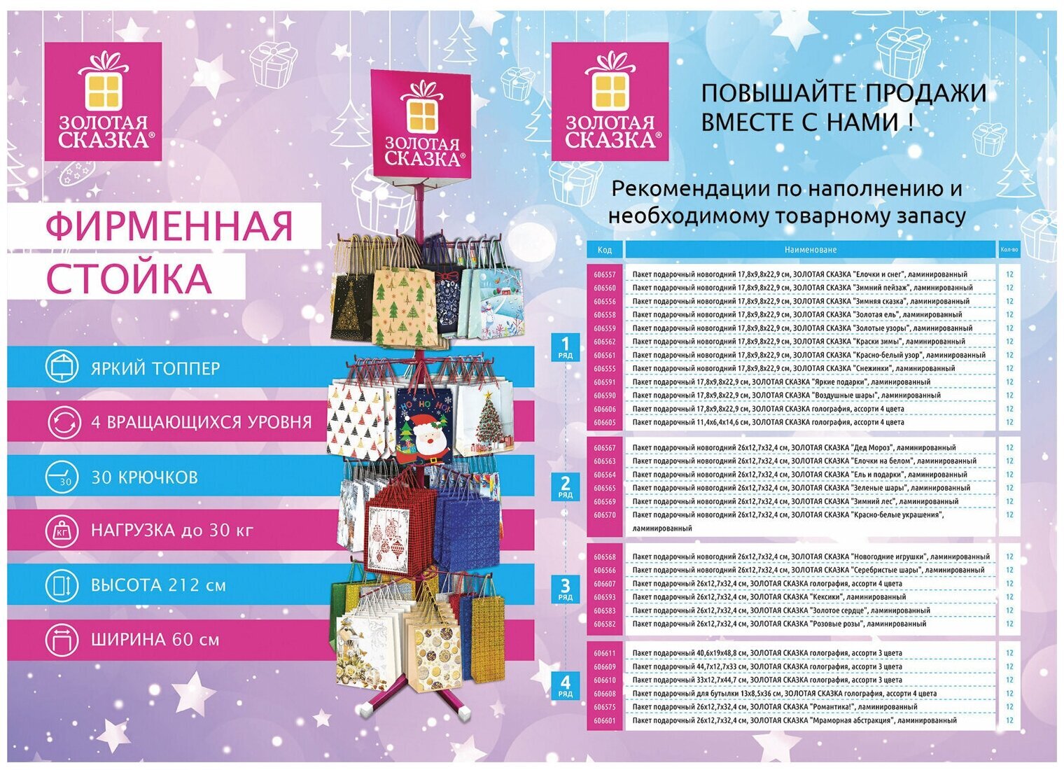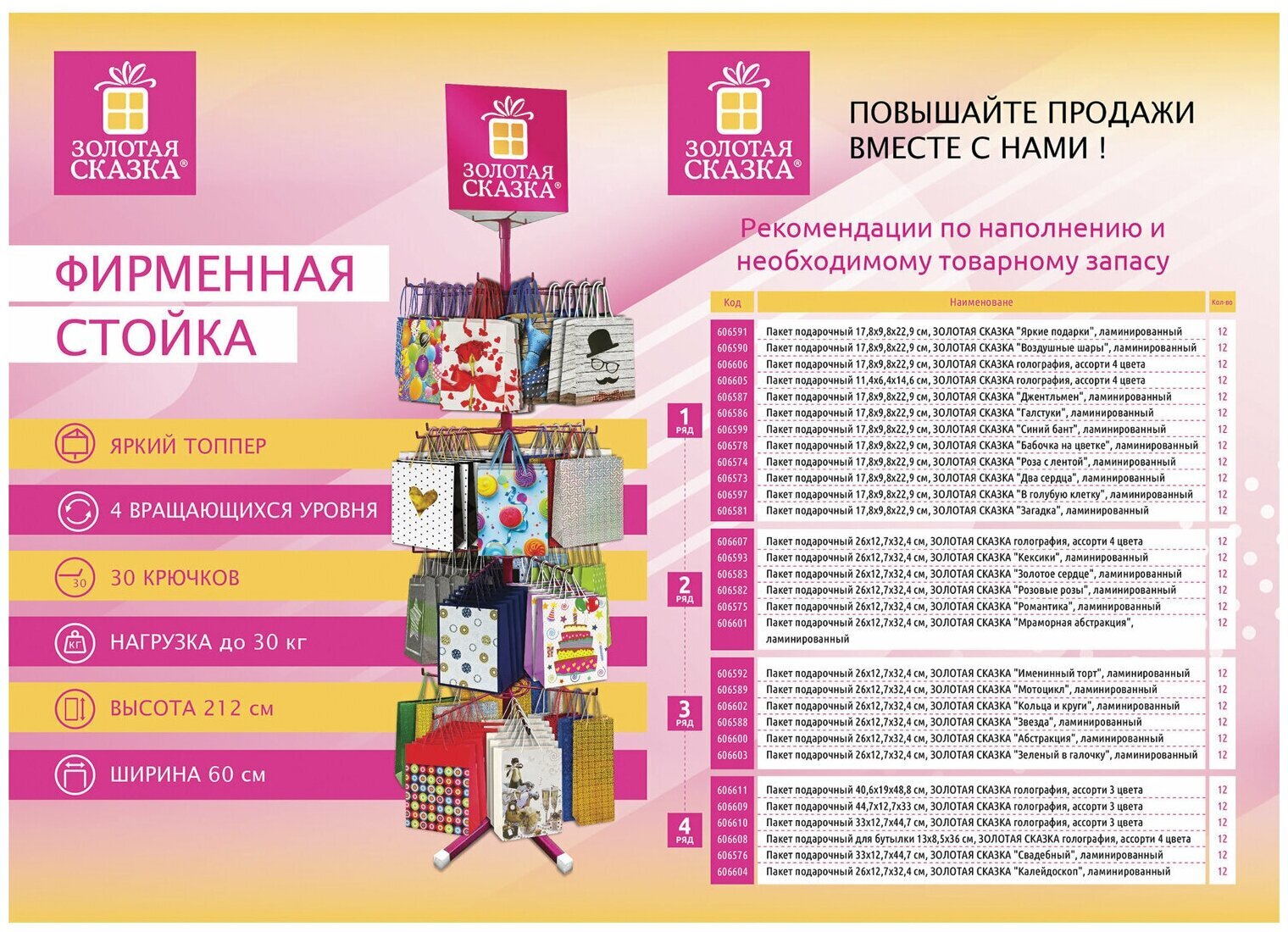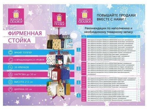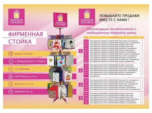 Напольная фирменная стойка "ЗОЛОТАЯ СКАЗКА" позволит выгодно разместить продаваемый ассортимент так, чтобы клиенту было удобно выбрать нужный товар.Вместительная и стильная стойка идеальна для увеличения прибыли. Яркий топпер привлекает внимание покупателя к бренду и непосредственно размещенному товару.