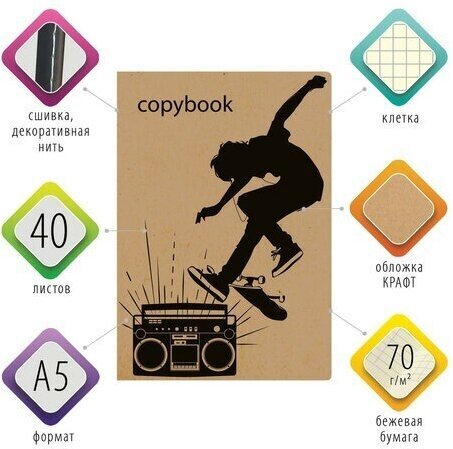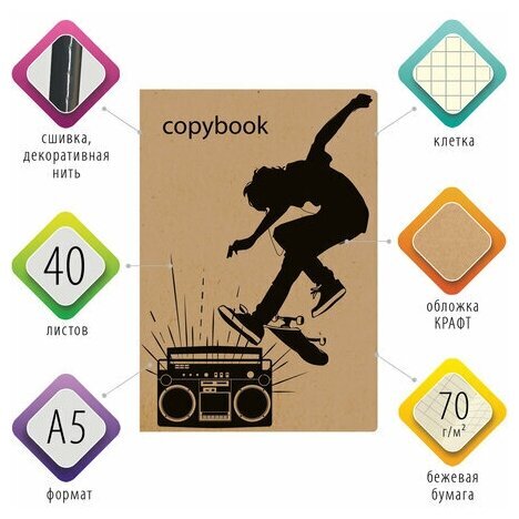 Практичная тетрадь BRAUBERG "СКЕЙТЕР" для учебы и работы. Обложка тетради изготовлена из крафт-картона со стильным, молодежным дизайном.Общая тетрадь формата А5 содержит 40 листов с линовкой в клетку. Сшивка плотно соединяет листы. Обложка изготовлена из высококачественного импортного крафт-картона с двусторонней запечаткой, что придает тетради изысканный и неповторимый стиль. Внутренний блок - тонированная офсетная бумага цвета слоновой кости плотностью 70 г/м2.