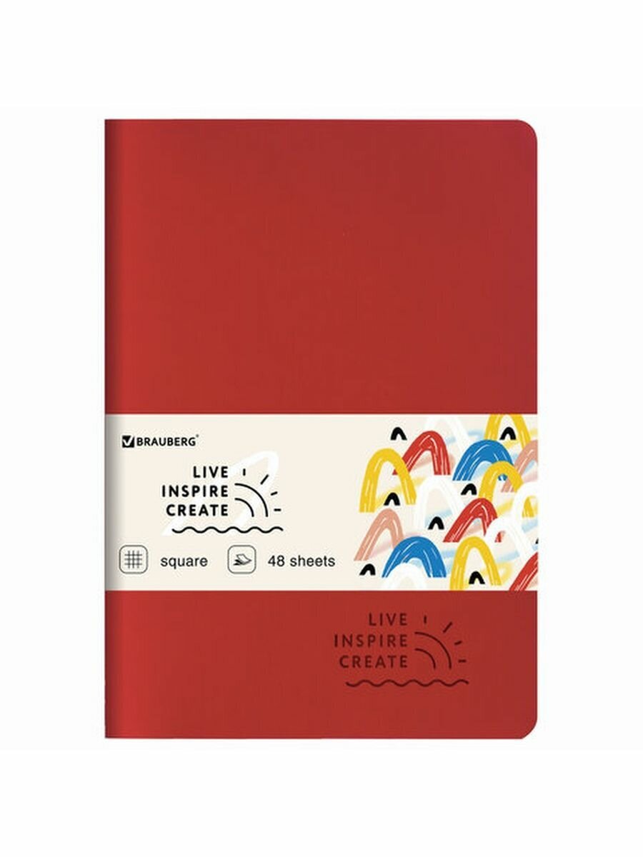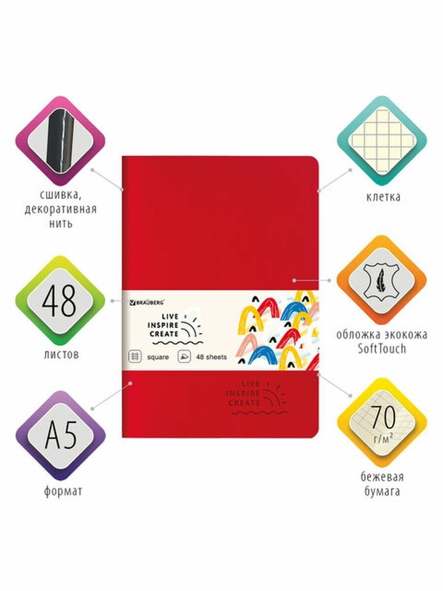 Практичная тетрадь BRAUBERG "RAINBOW" незаменима для учебы и работы.Общая тетрадь формата А5 содержит 48 листов с линовкой в клетку. Сшивка плотно соединяет листы. Обложка изготовлена из высококачественного и износоустойчивого материала - экокожи с покрытием SoftTouch красного цвета, что придает тетради изысканный и неповторимый стиль. Внутренний блок - бежевая офсетная бумага плотностью 70 г/м2.