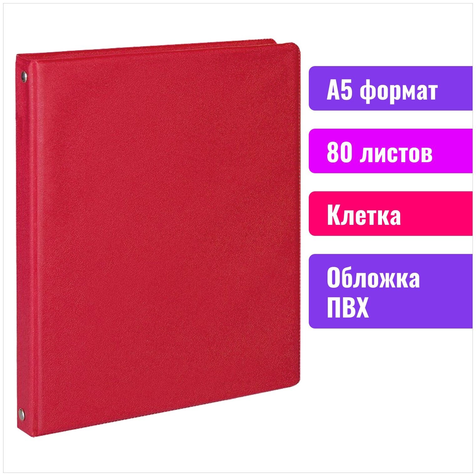 Тетрадь на кольцах А5 (180х220 мм), 80 л., обложка ПВХ, клетка, BRAUBERG, красный, 403911