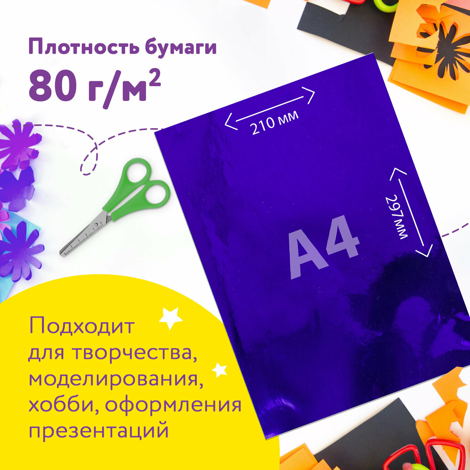В набор входят 5 листов с классической глянцевой поверхностью и 5 листов с зеркальной. Всего 10 разнообразных цветов. Бумага формата А4 имеет плотность 80 г/м2. Листы упакованы в удобный полиэтиленовый пакет с липким краем. Благодаря такому набору ребенок без труда сможет реализовать любую творческую задумку.