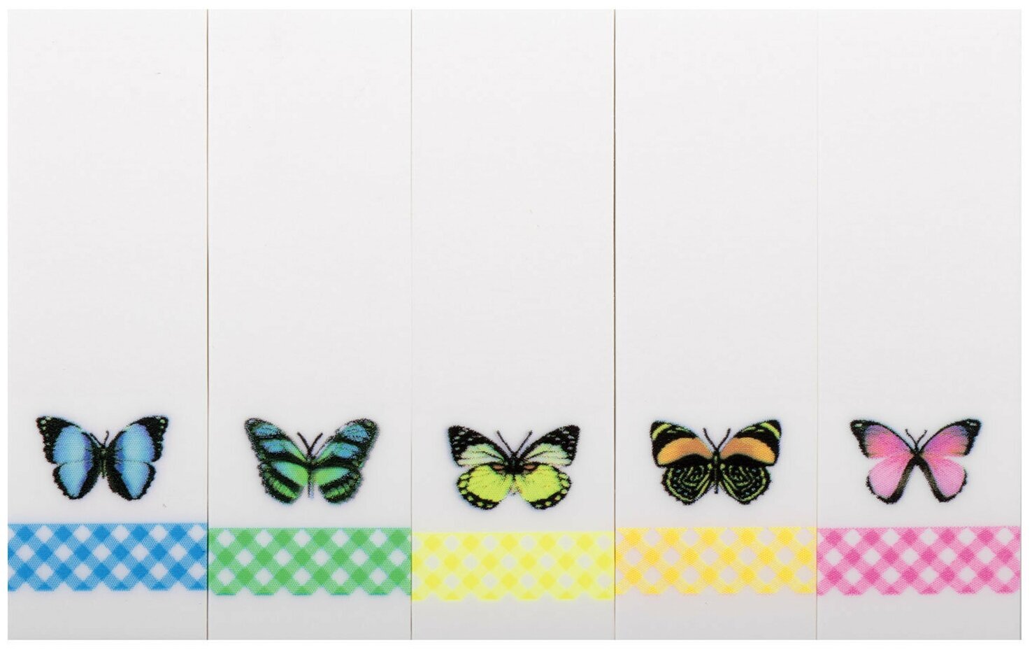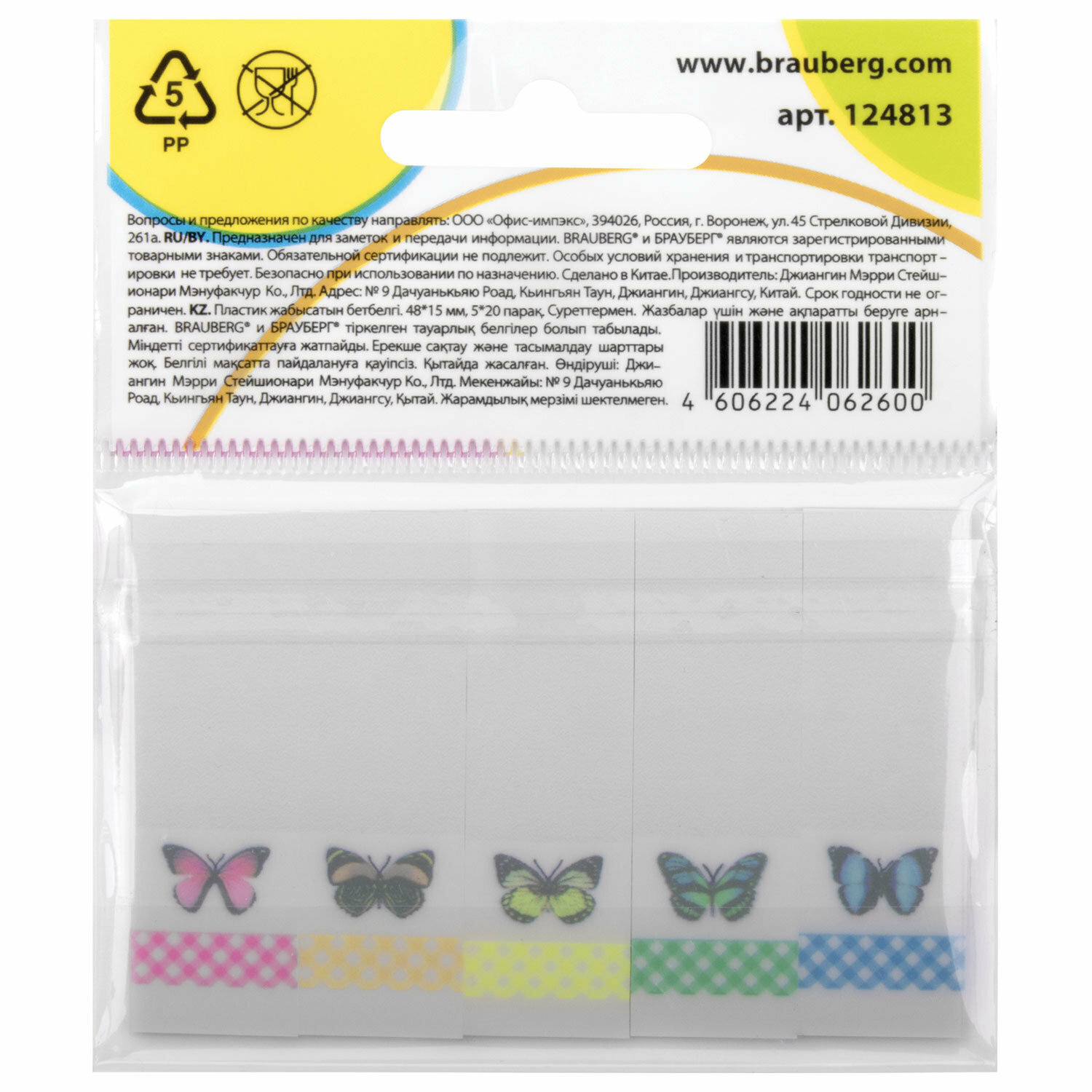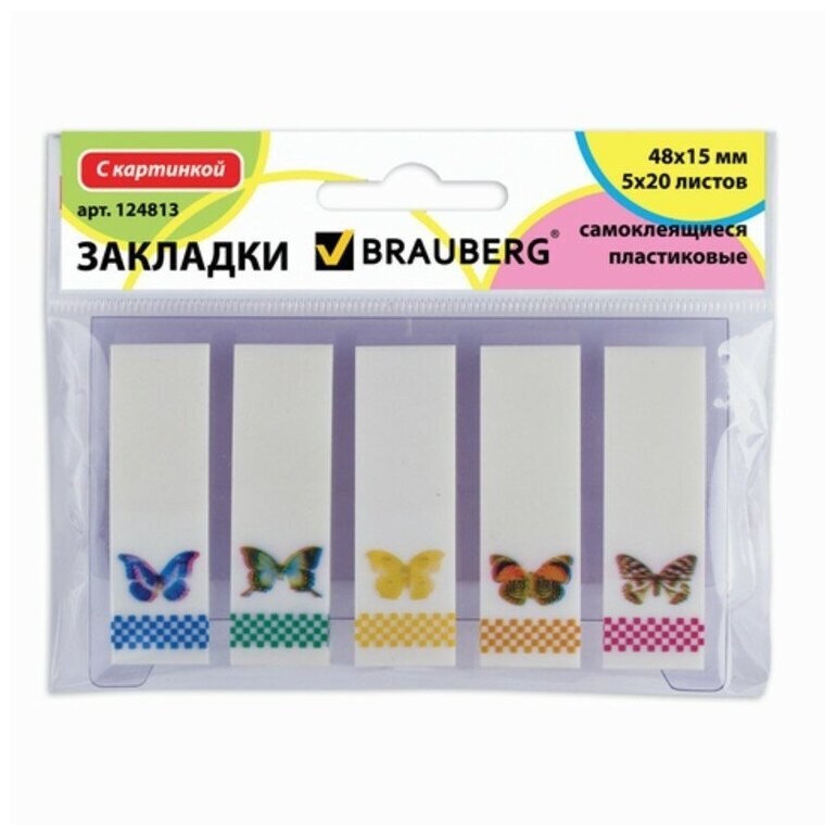 Яркие пластиковые полупрозрачные закладки BRAUBERG акцентируют внимание на важных страницах книги, журнала, каталога и др.Набор белых пластиковых закладок размером 48х15 мм с 5 разноцветными изображениями бабочек по краям состоит из 100 листов, по 20 закладок каждого цвета. Клейкий слой - 22 Н/м. Легко клеятся к любой поверхности и не оставляют следов. Материал закладок позволяет делать надписи ручкой и карандашом. Уложены на пластиковом основании. Поставляются в полиэтиленовом пакете с европодвесом.