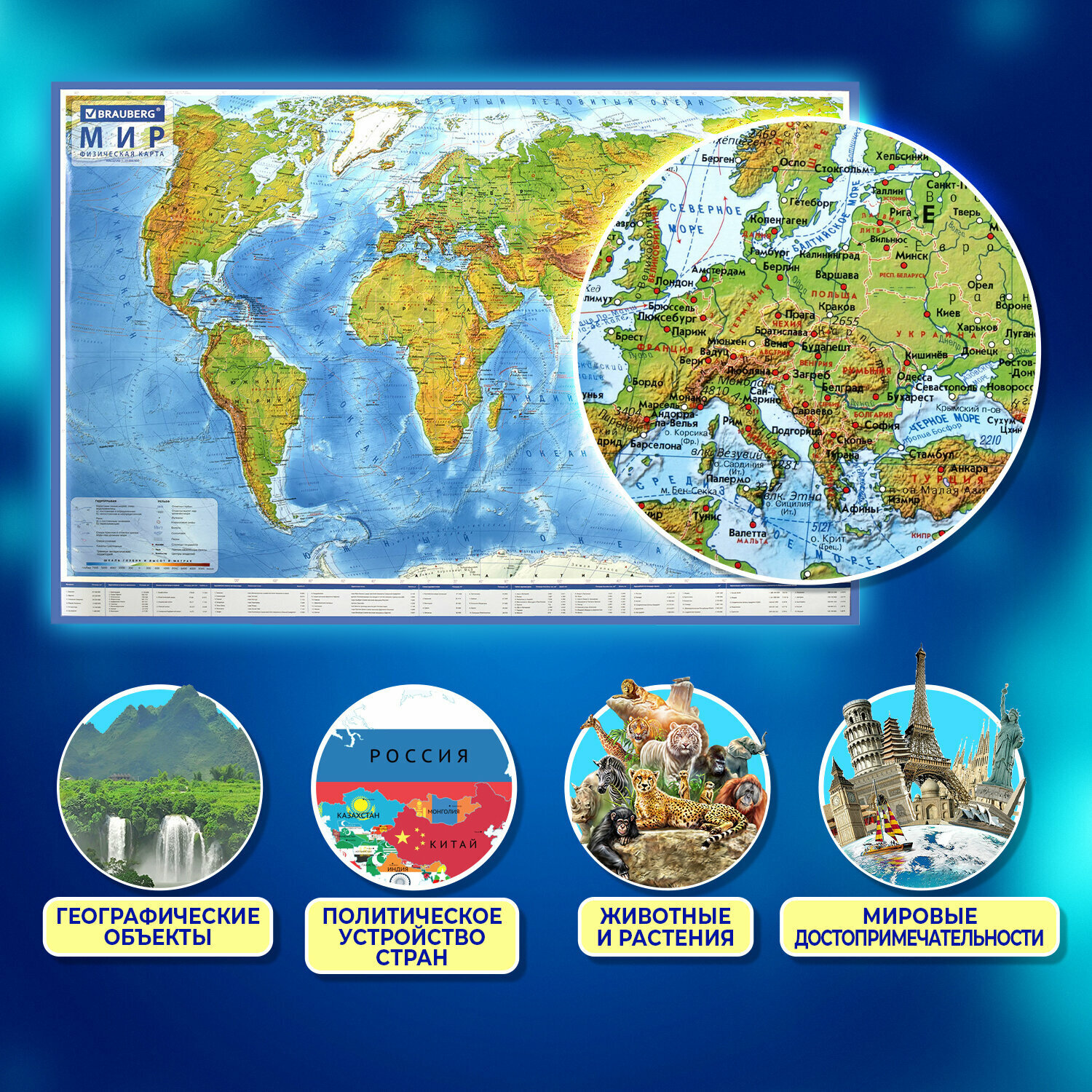 На географической карте мира BRAUBERG отображаются названия континентов, океанов и морей, рек, гор, течений и т. д.Окунитесь в волшебный мир вместе с интерактивной картой мира BRAUBERG благодаря приложению IQ Globe!