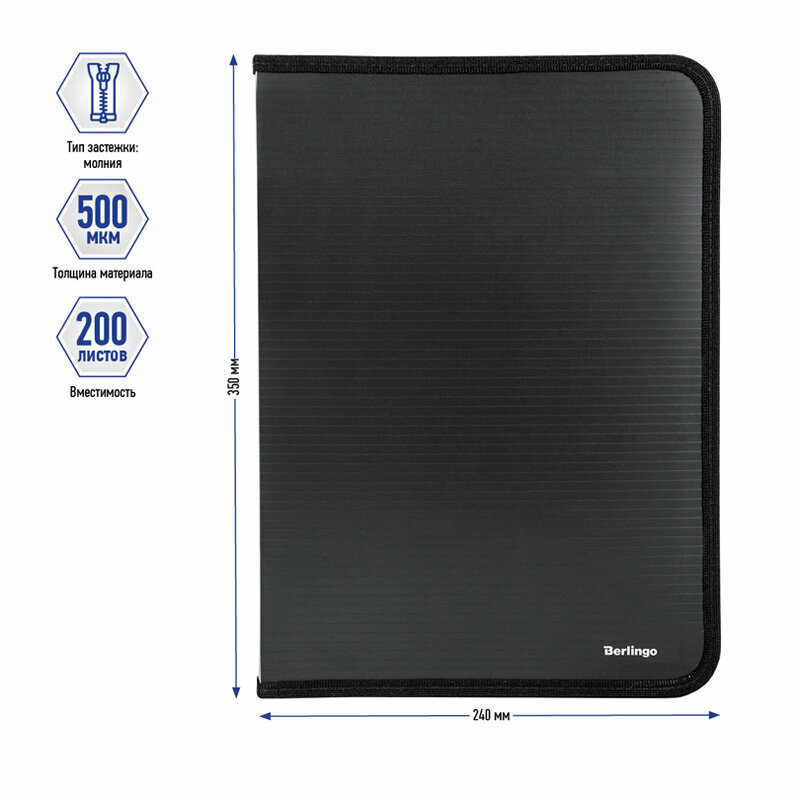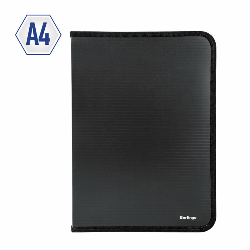 Папка на молнии Berlingo формата А4 – это функциональный аксессуар для работы и учебы, который выполнен в классическом черном цвете. Предназначены для транспортировки и хранения большого количества бумаг. Папка изготовлена из качественного непрозрачного пластика толщиной 500 мкм с фактурой «линии». Размер папки составляет 240*335*25 мм. Вместимость папки – 200 листов. Молния надежно защитит вложенные документы от загрязнений и пыли и обеспечит быстрый доступ к содержимому. Индивидуальная упаковка в пакет.• Вместимость: 200 листов;• Формат: А4 (240*335*25мм);• Цвет: черный.