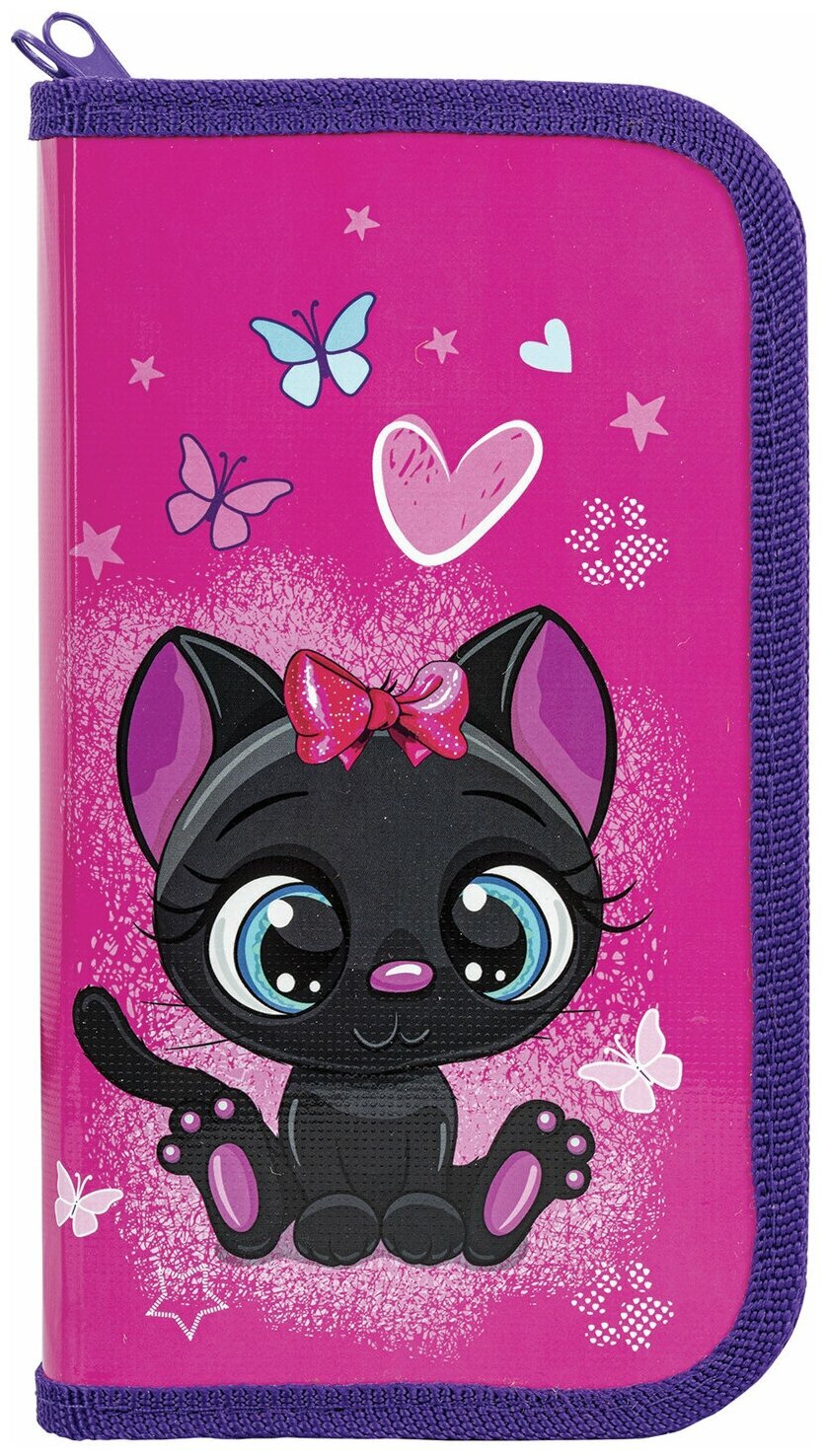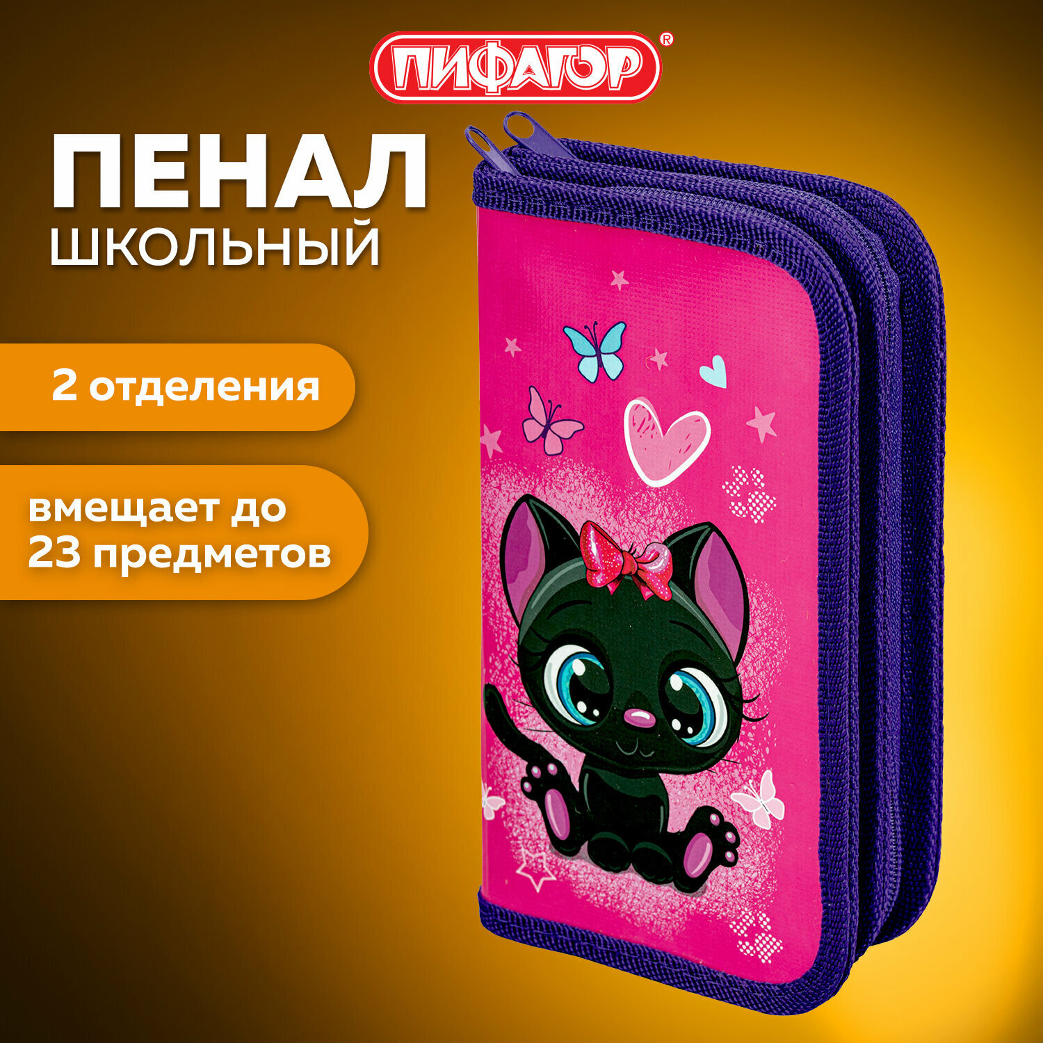 Пенал ПИФАГОР "Black kitten" стандартного размера с двумя отделениями. Удобные молнии с трех сторон с металлическим бегунком, прочные резинки для предметов. Вмещает до 25 предметов.Материал пенала - ламинированный картон с цветной печатью, ярким дизайном и конгревом. Основа пенала - плотный картон, обшитый тканью по краям. Такая конструкция отличается износостойкостью и прочностью, поможет защитить канцелярские принадлежности от повреждений.