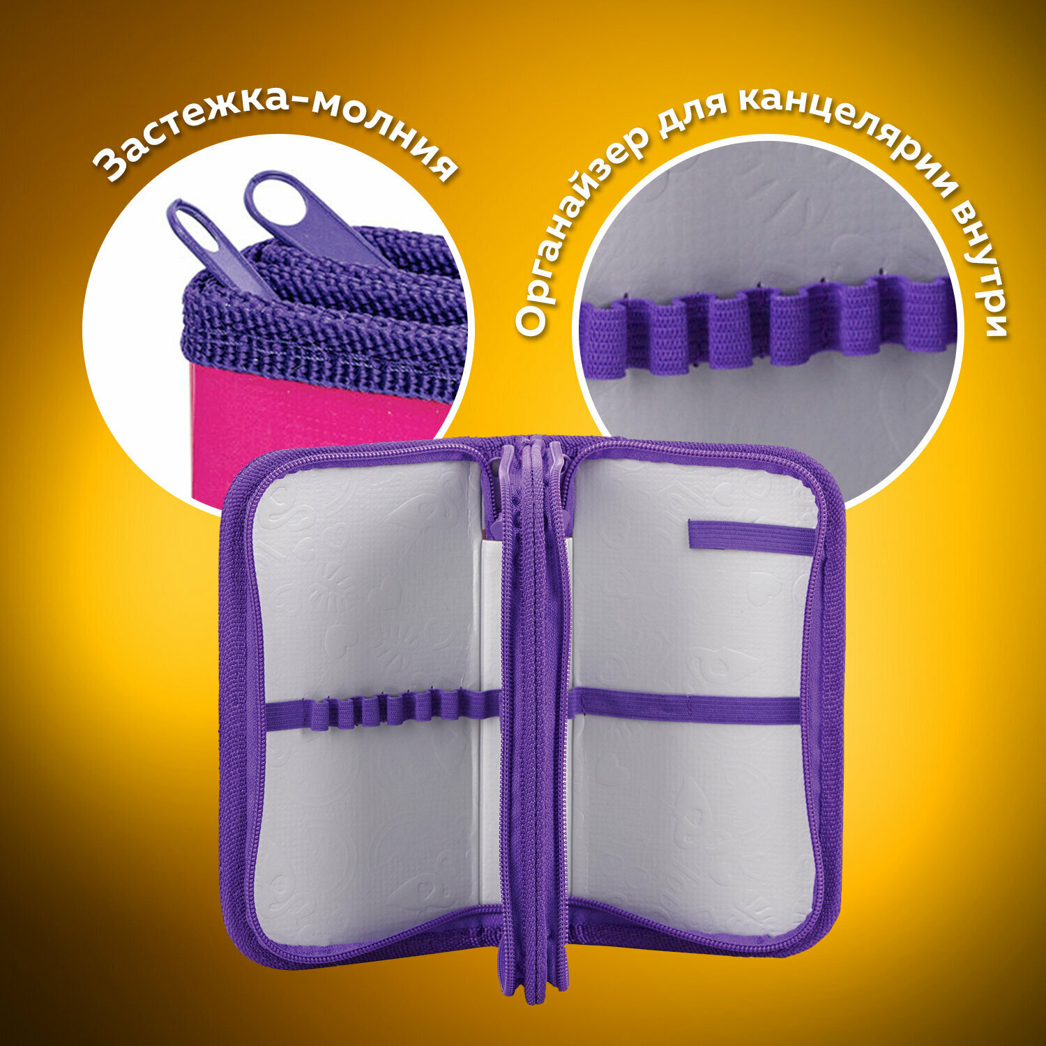 Пенал имеет стандартный размер 19х11 см и два отделения, что позволяет легко размещать его в ранце или рюкзаке, сумке. Хорошая наполняемость пенала дает возможность держать все необходимые для уроков канцтовары в порядке, в одном месте.